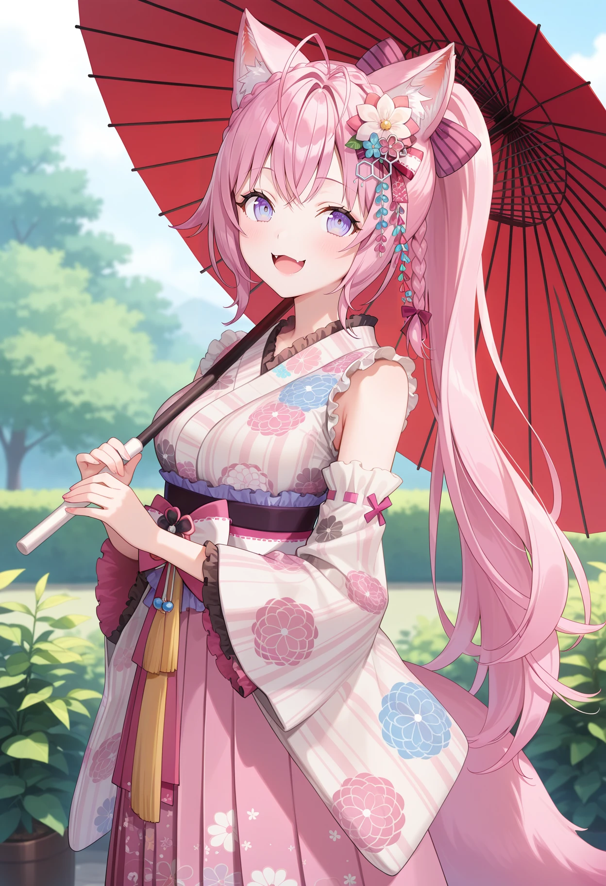 outifit2bbkoyori, long hair, pink hair, side ponytail, single braid, animal ears, hair bow, hair ornament, hair flower, fang, tail, frilled kimono, print kimono, white kimono, detached sleeves, long sleeves, wide sleeves, striped bow, obi, hakama skirt, pink skirt