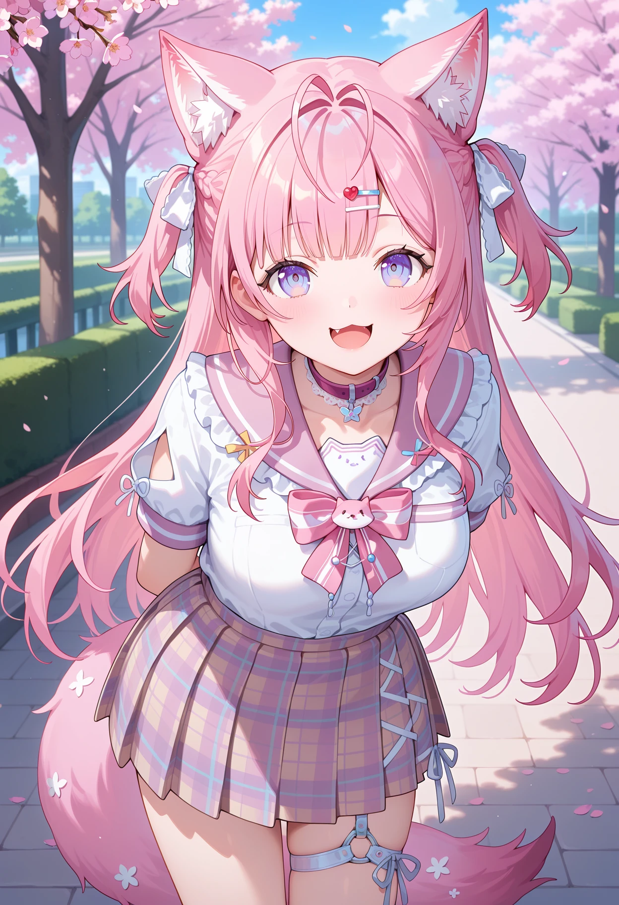 outfit4ddkoyori, long hair, pink hair, two side up, braid, animal ears, hair ribbon, hairclip, fang, tail, choker, school uniform, pink sailor collar, pink bowtie, white shirt, short sleeves, plaid skirt, single garter strap, thigh strap