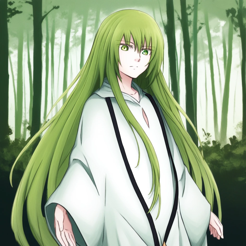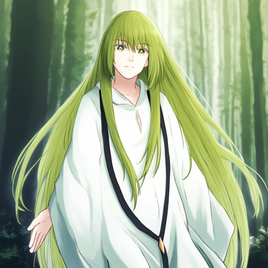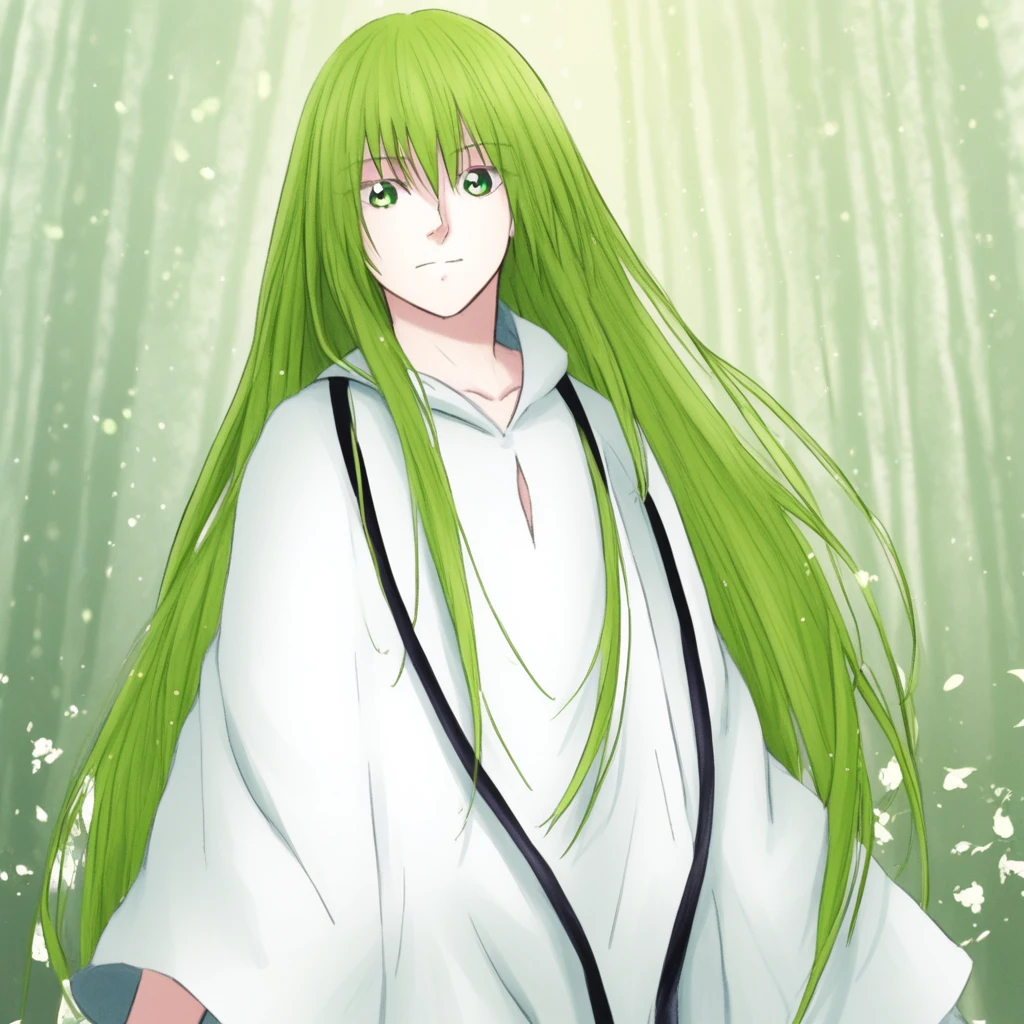 Enkidu, androgynous, green hair, long hair, green eyes, black string, barefoot, white robe