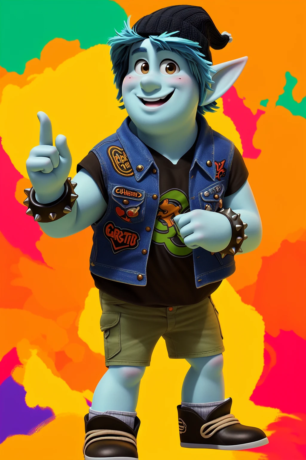 <lora:BarleyLightfootV2:0.7>,barleylightfoot, blue hair, pointy ears, hat, jewelry, bracelet, spiked bracelet, denim jacket, shorts, blue skin, bara, full body, jewelry,brown eyes,