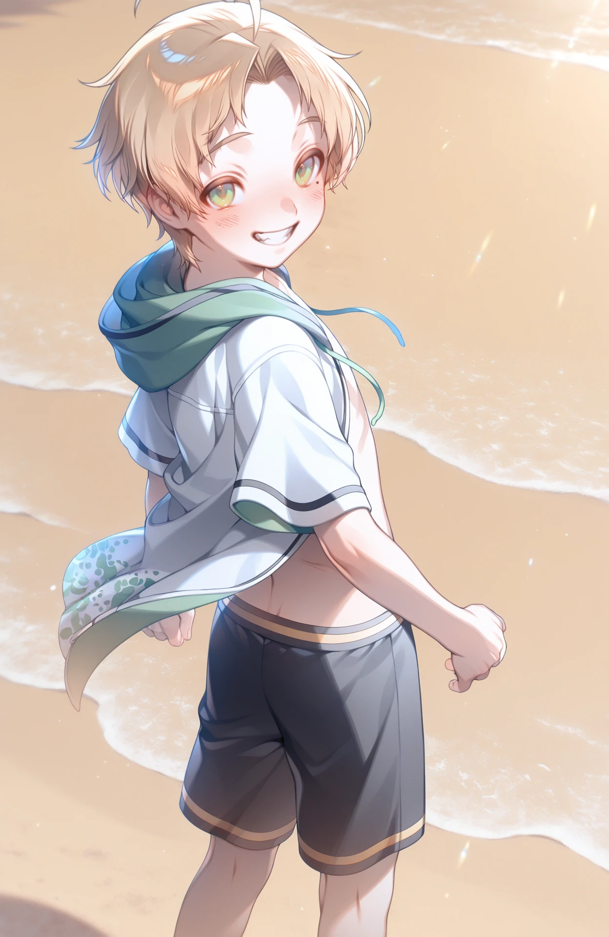 shirotaka style, rudeus, 1boy, green eyes, mole under eye, blonde hair, ahoge, white shirt, short sleeves, black vest, red shorts