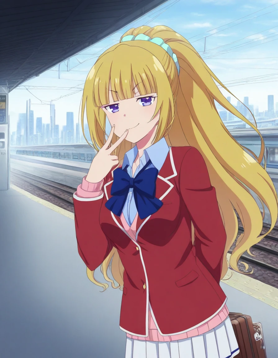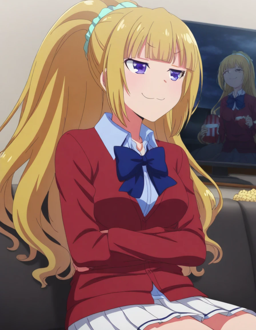kei karuizawa, long hair, bangs, blunt bangs, purple eyes, blonde hair, shirt, hair ornament, ponytail, scrunchie, blue scrunchie, smile,