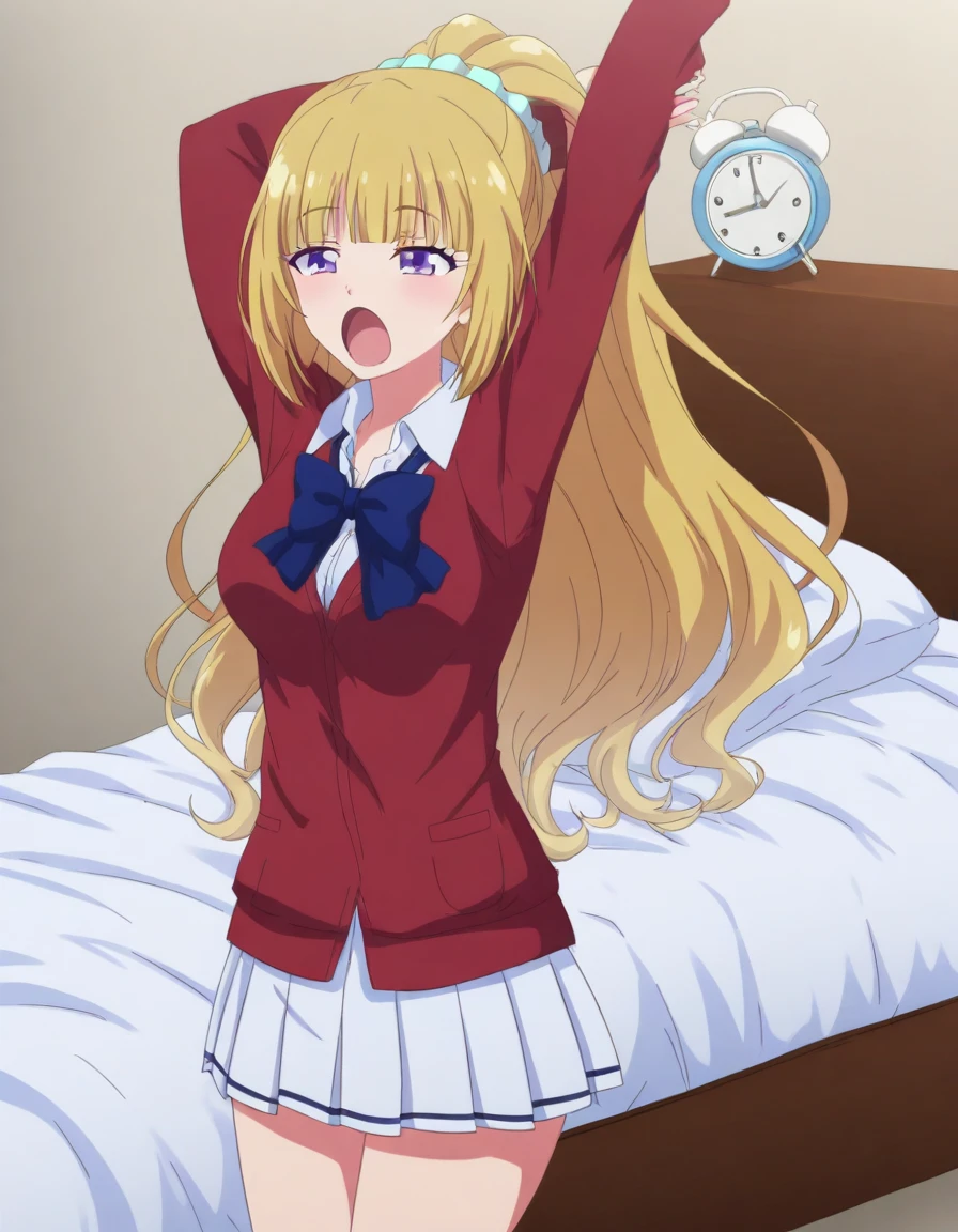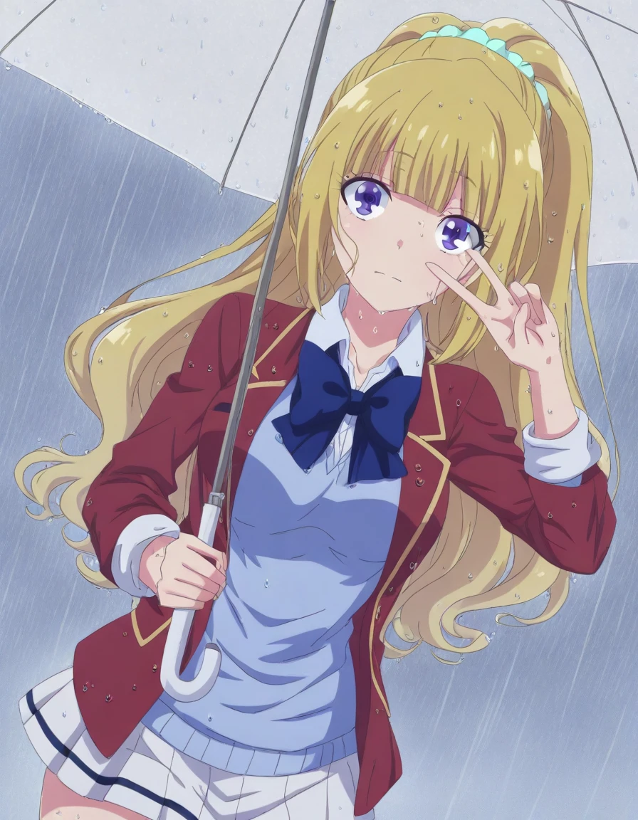 kei karuizawa, long hair, bangs, blunt bangs, purple eyes, blonde hair, shirt, hair ornament, ponytail, scrunchie, blue scrunchie, medium breasts,