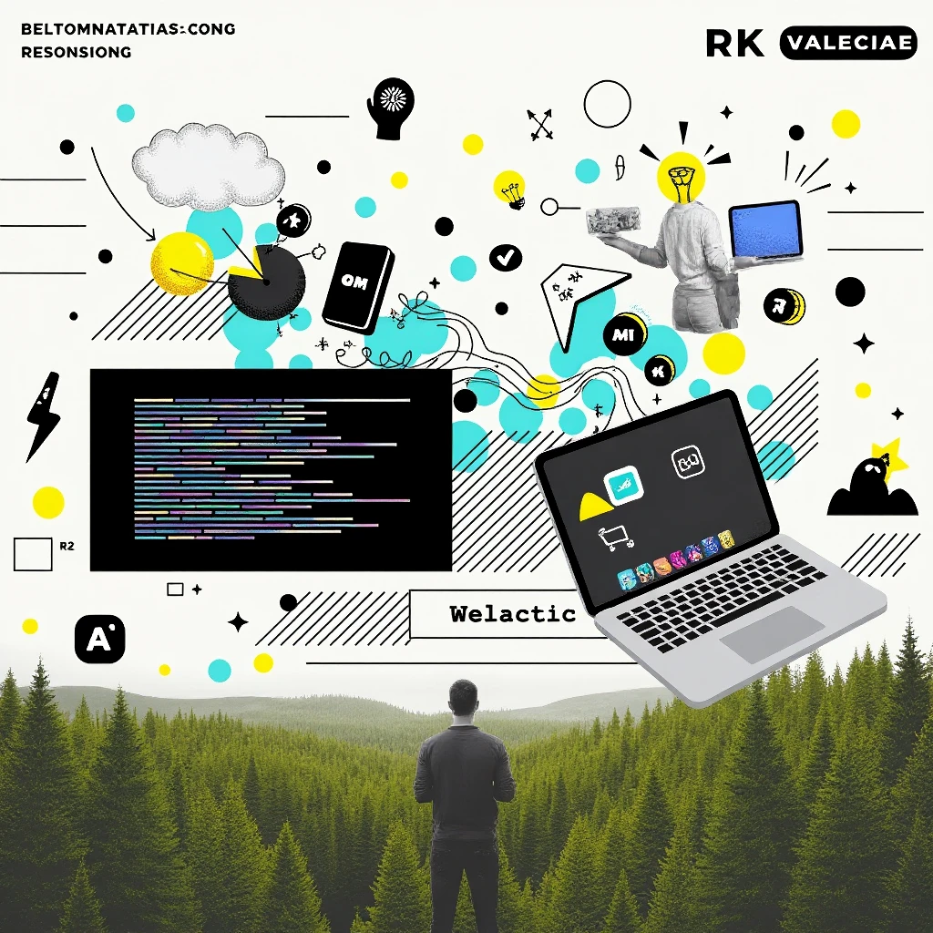 "A hybrid landscape, contemporary collage art style, combining a serene forest with digital glitch effects, floating computer parts, and hand-drawn elements, creating a contrast between nature and technology."