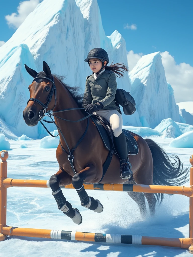 The horse's front two hooves are raised, ready to jump or jumping.