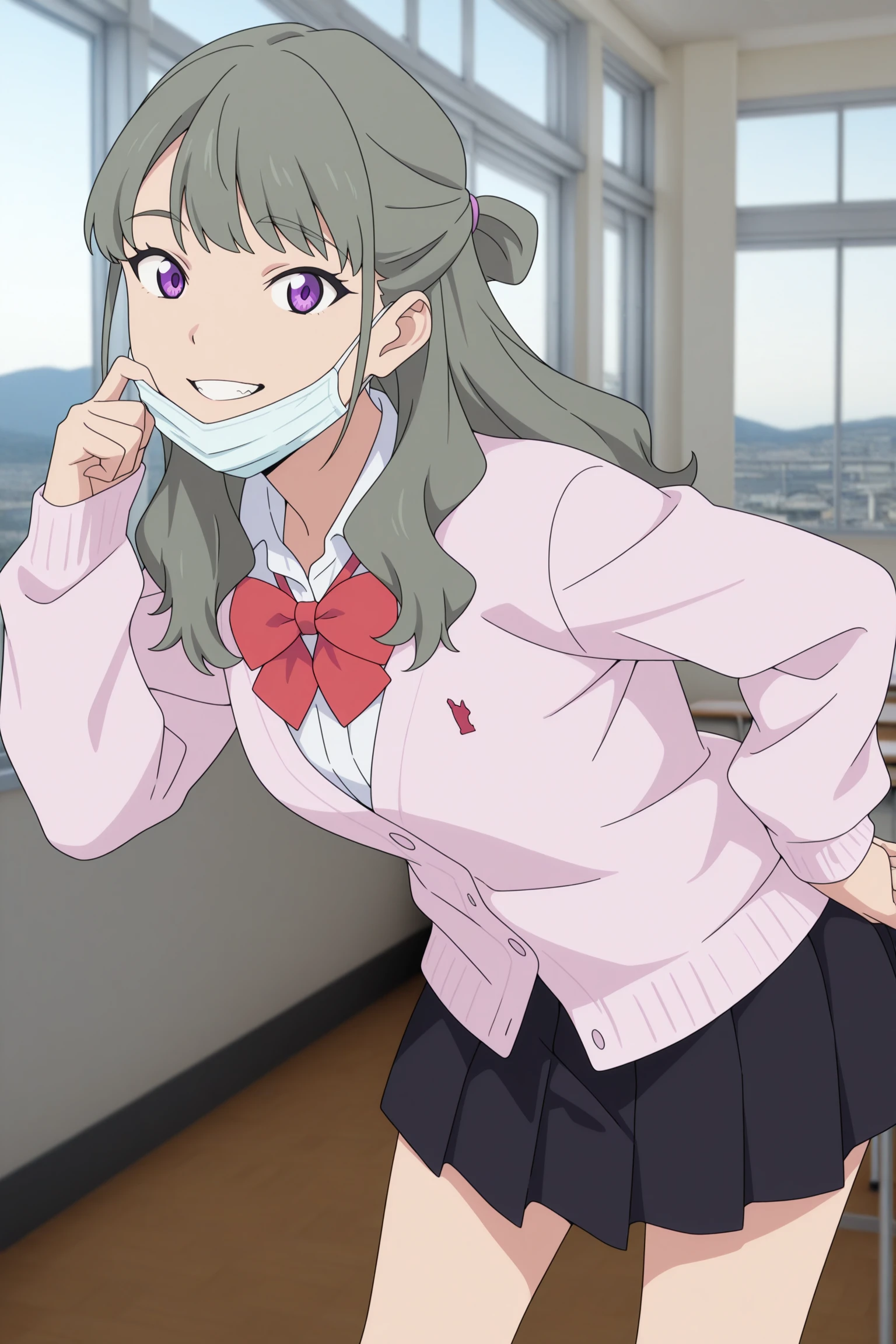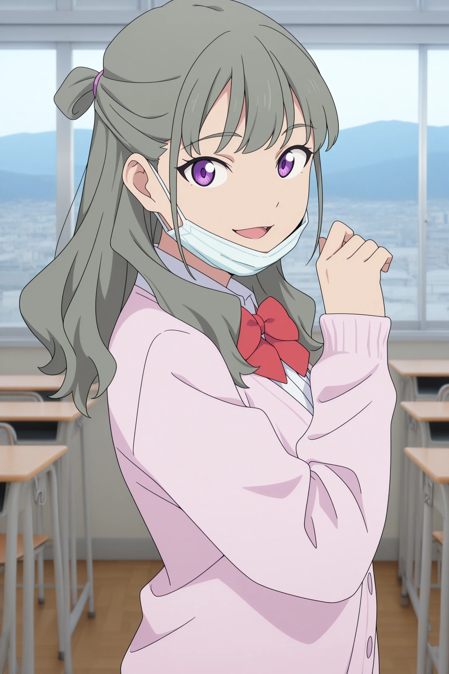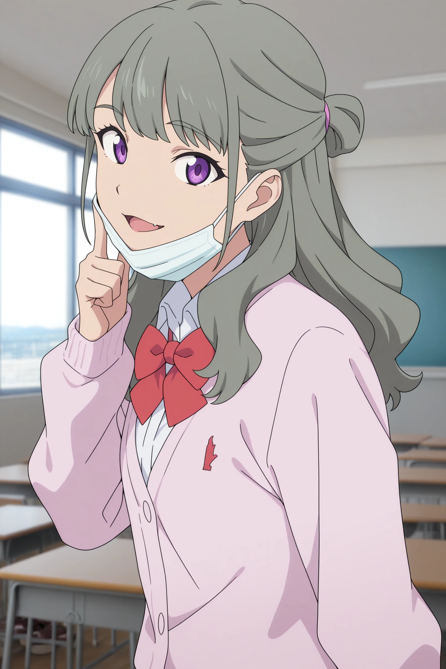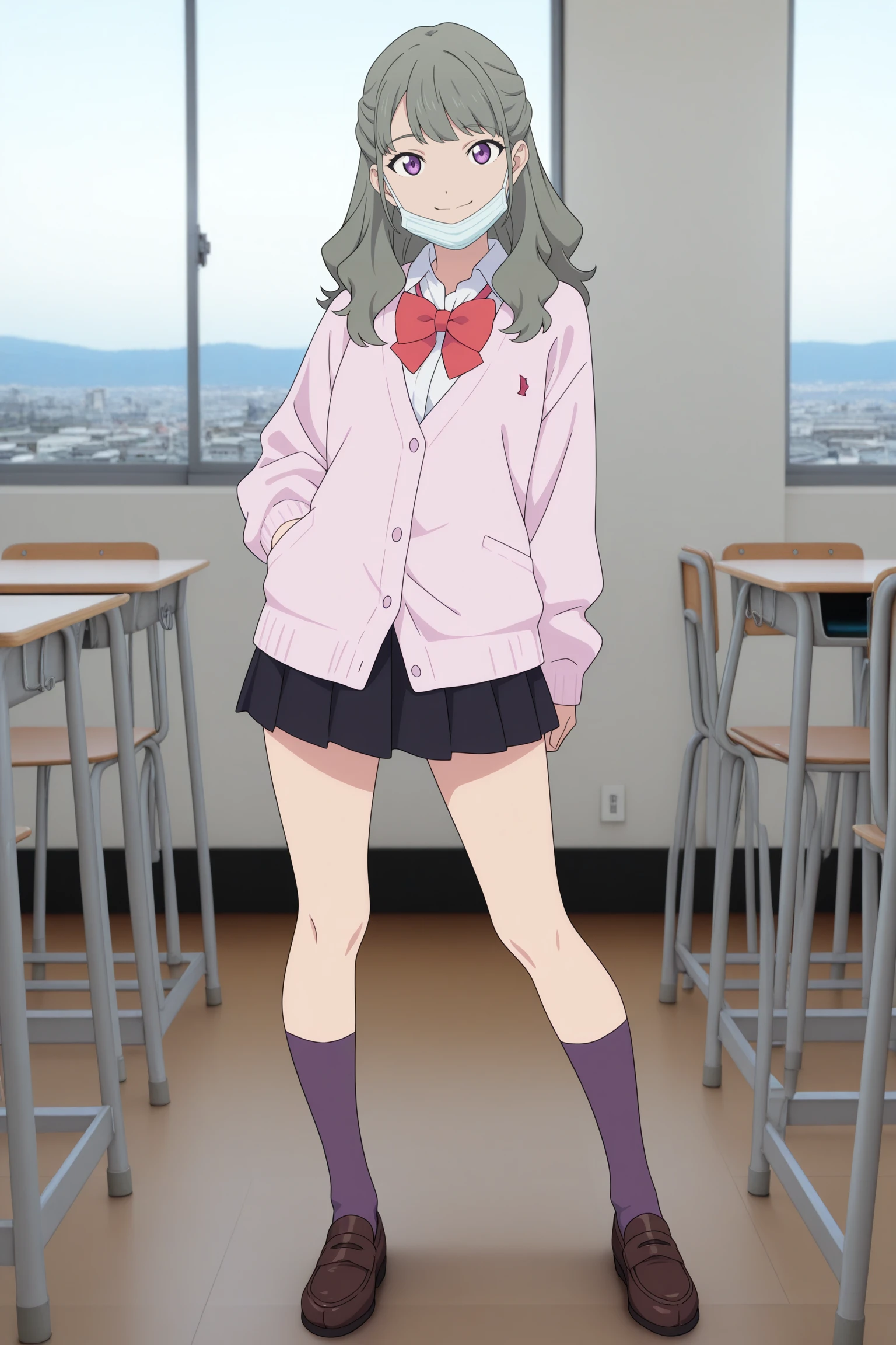 ranka, long hair, grey hair, half updo, hair tie, fanged bangs, choppy bangs, purple eyes, surgical mask, long sleeves, pink cardigan, white shirt, collared shirt, red bowtie, black skirt, pleated skirt, purple socks, kneehighs, brown footwear, loafersDescription