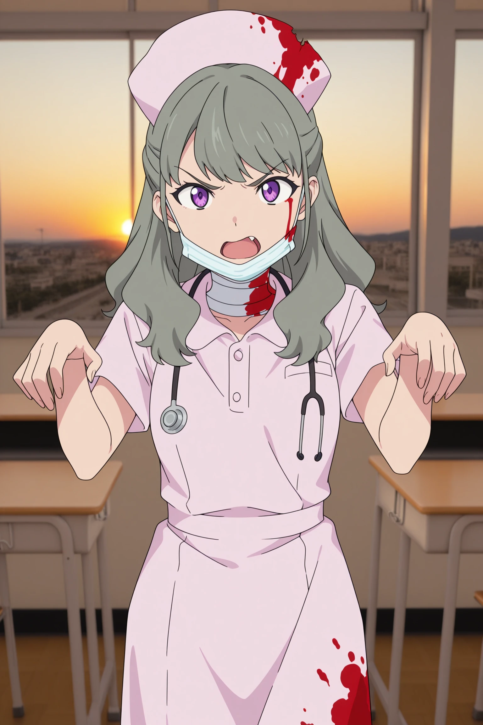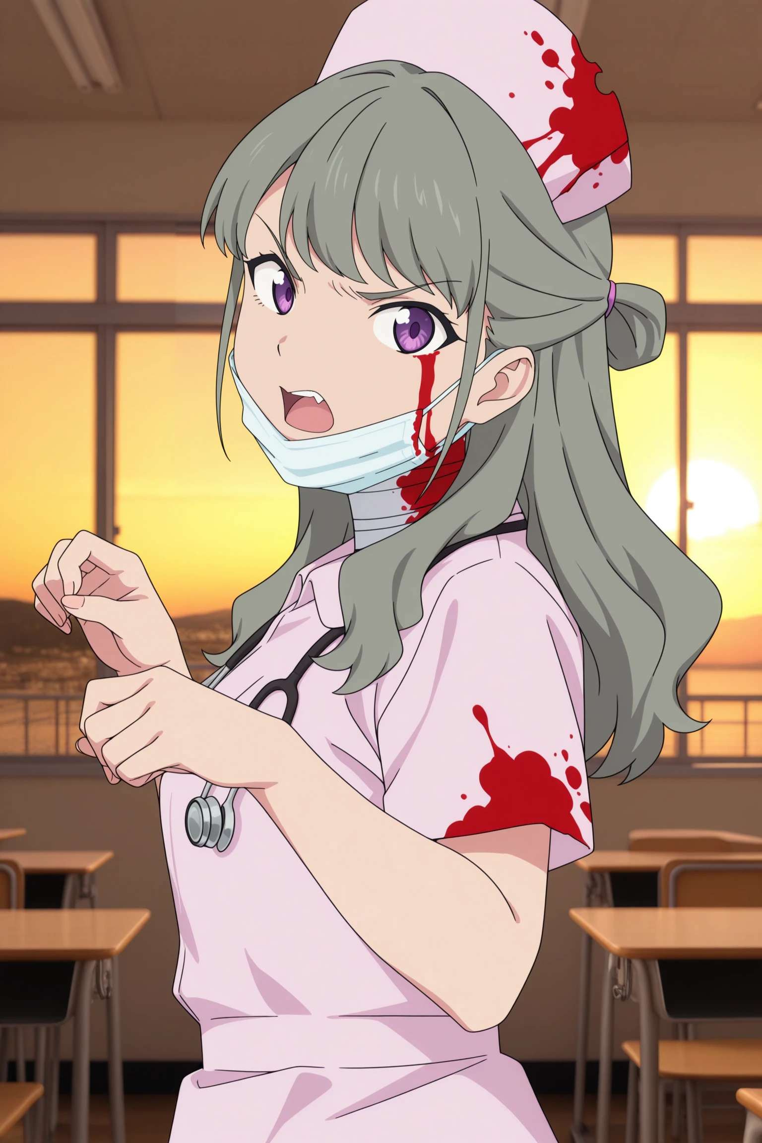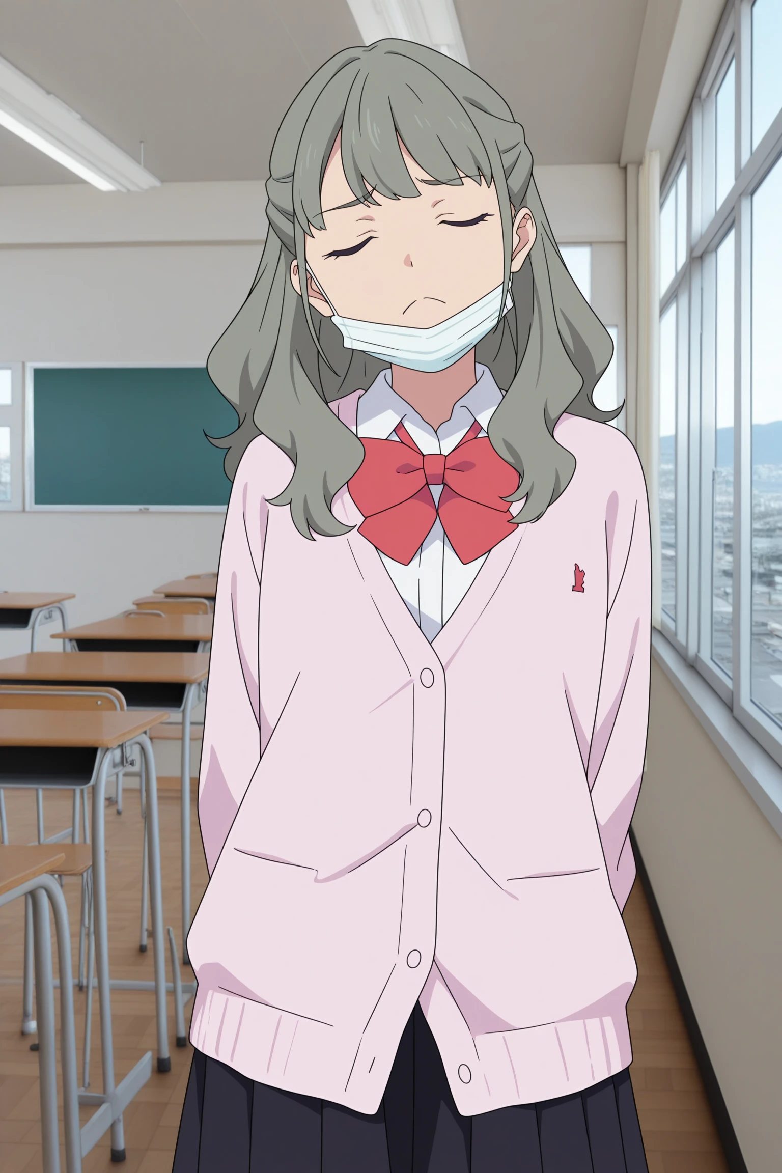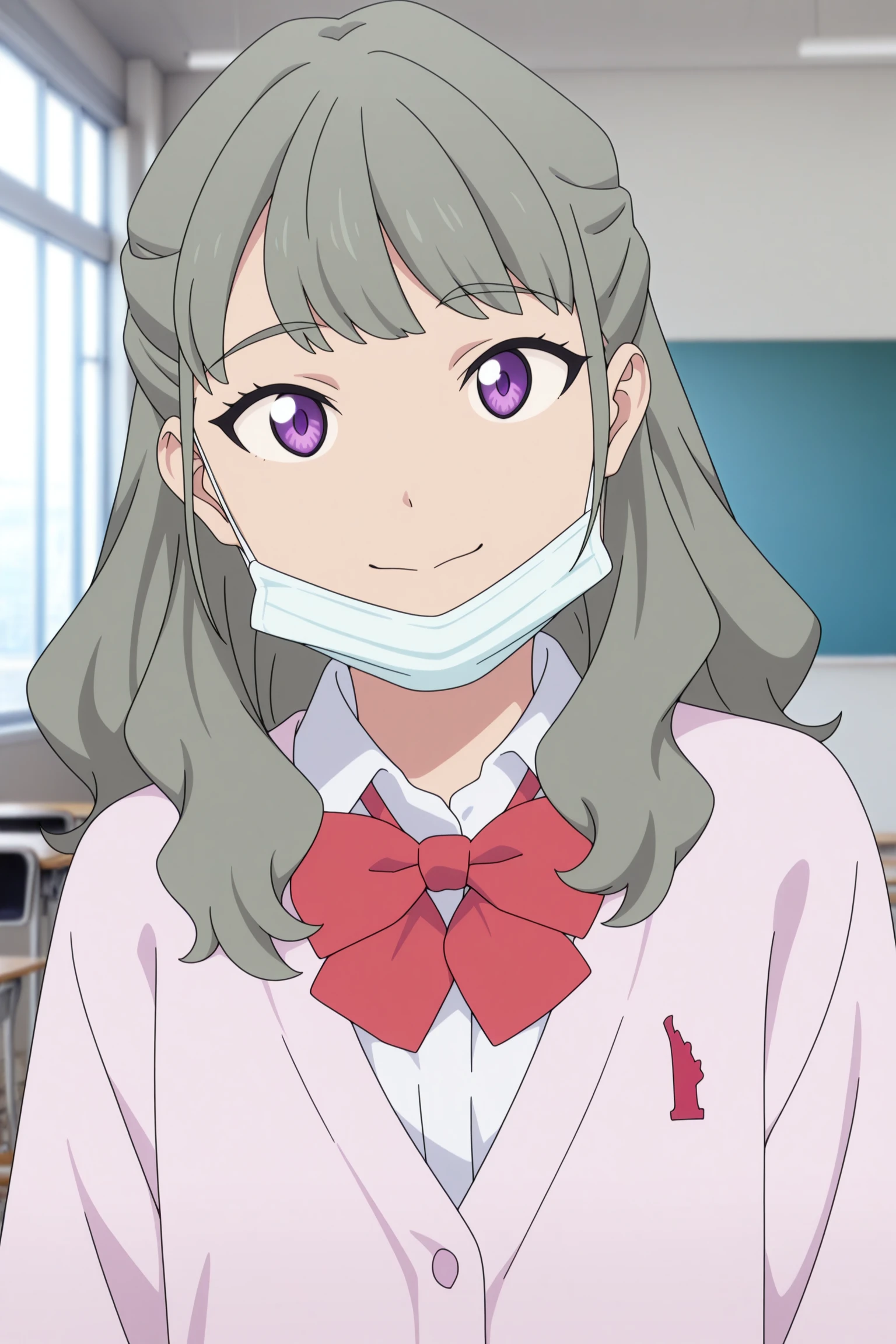 ranka, long hair, grey hair, half updo, hair tie, fanged bangs, choppy bangs, purple eyes, surgical mask, long sleeves, pink cardigan, white shirt, collared shirt, red bowtie, black skirt, pleated skirt, purple socks, kneehighs, brown footwear, loafersDescription