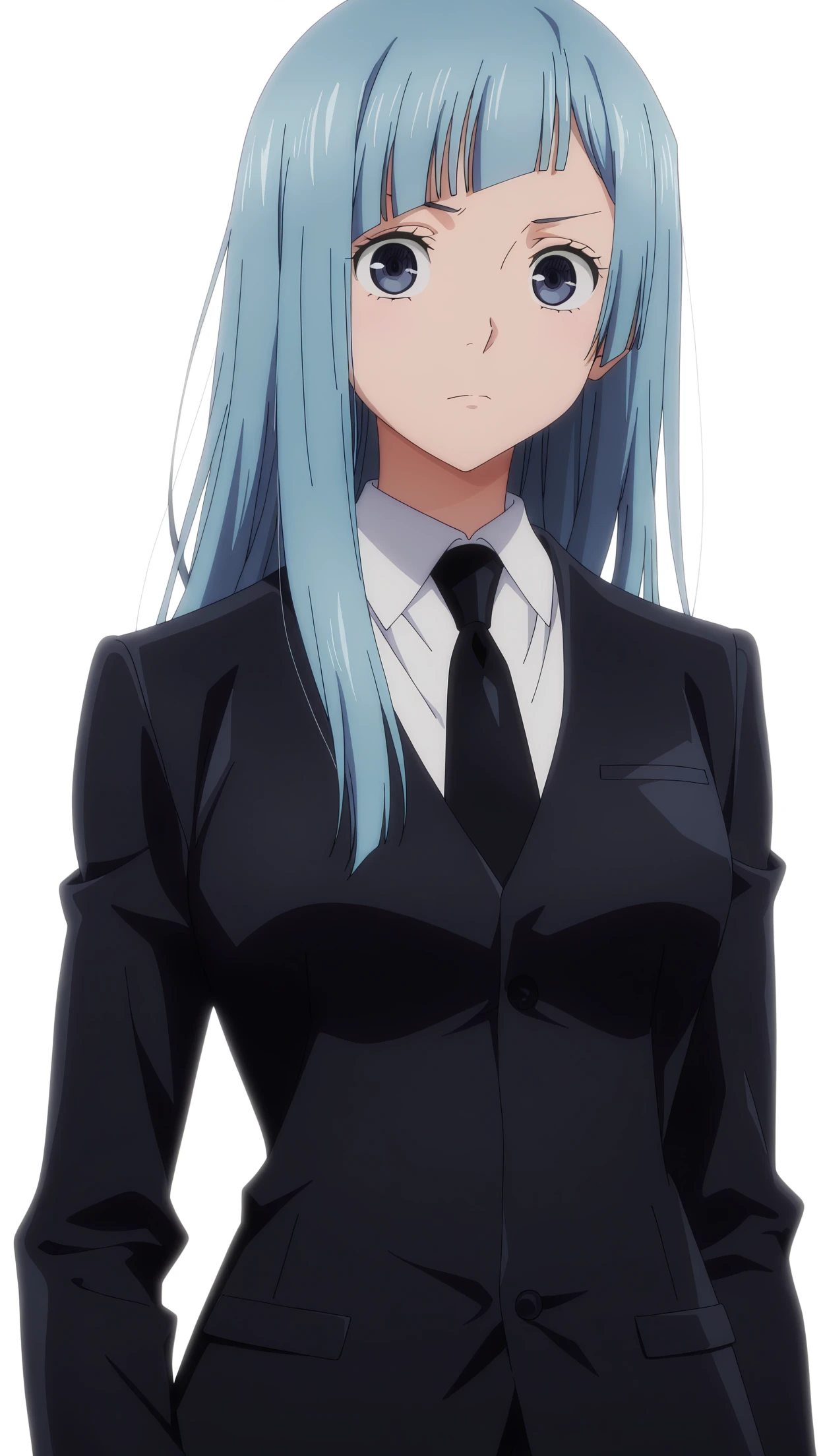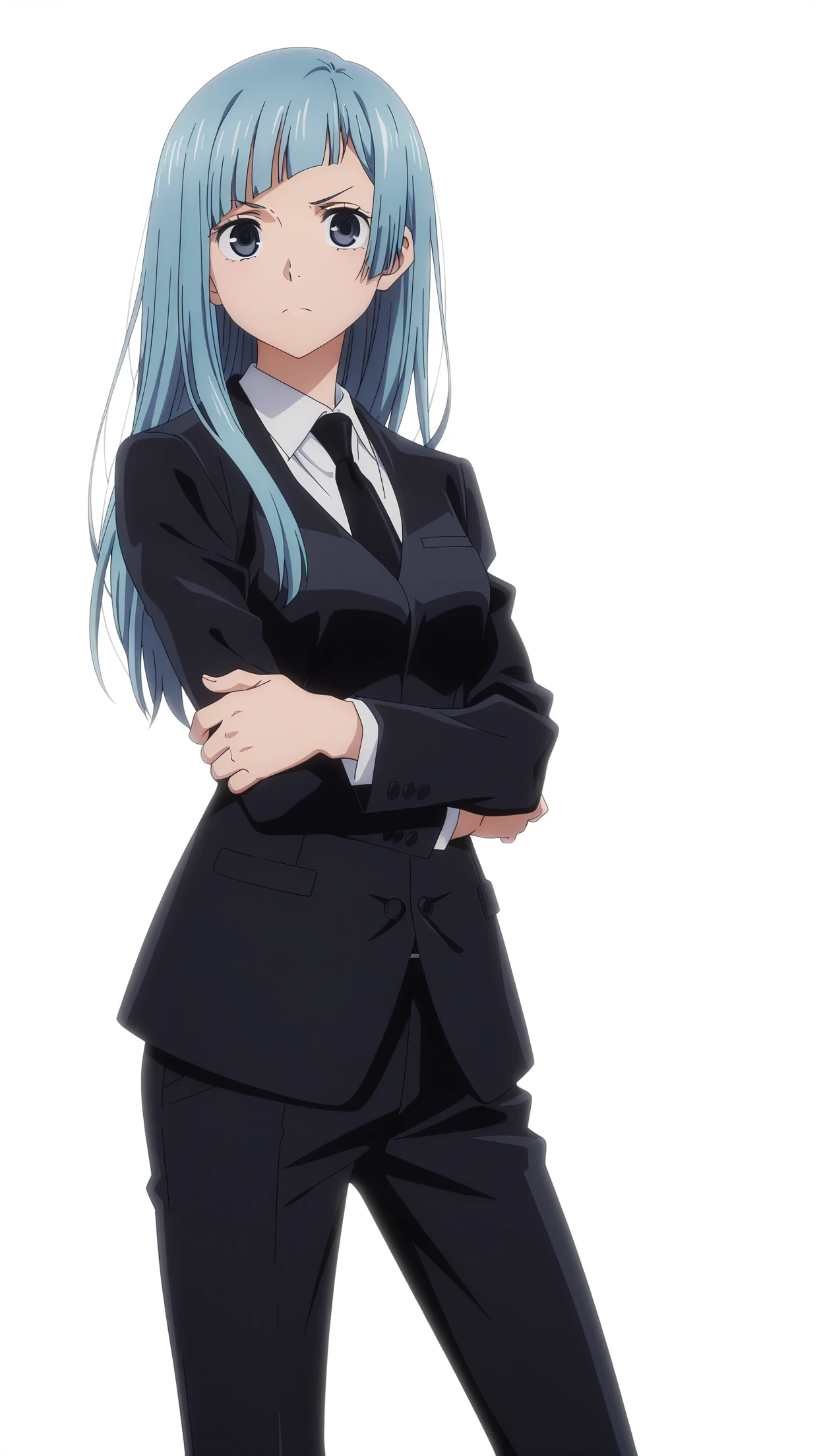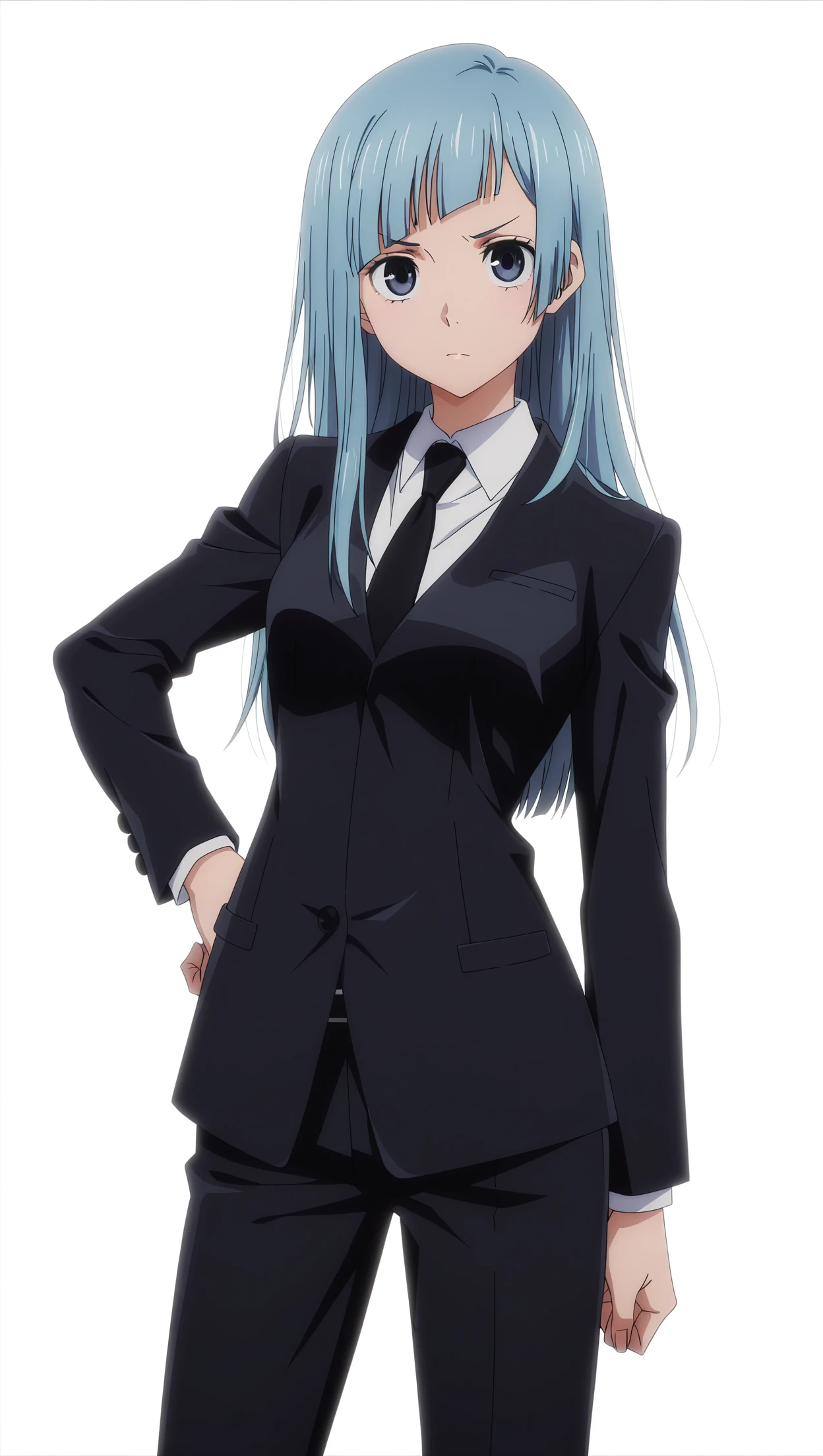 anime coloring, masterpiece, best quality, amazing quality, miwa, 1girl, long hair, blue hair, blue eyes, medium breasts, formal, suit, necktie, black necktie, pants, solo, pose, standing, looking at viewer, white background, simple background⚙️ Generation Settings