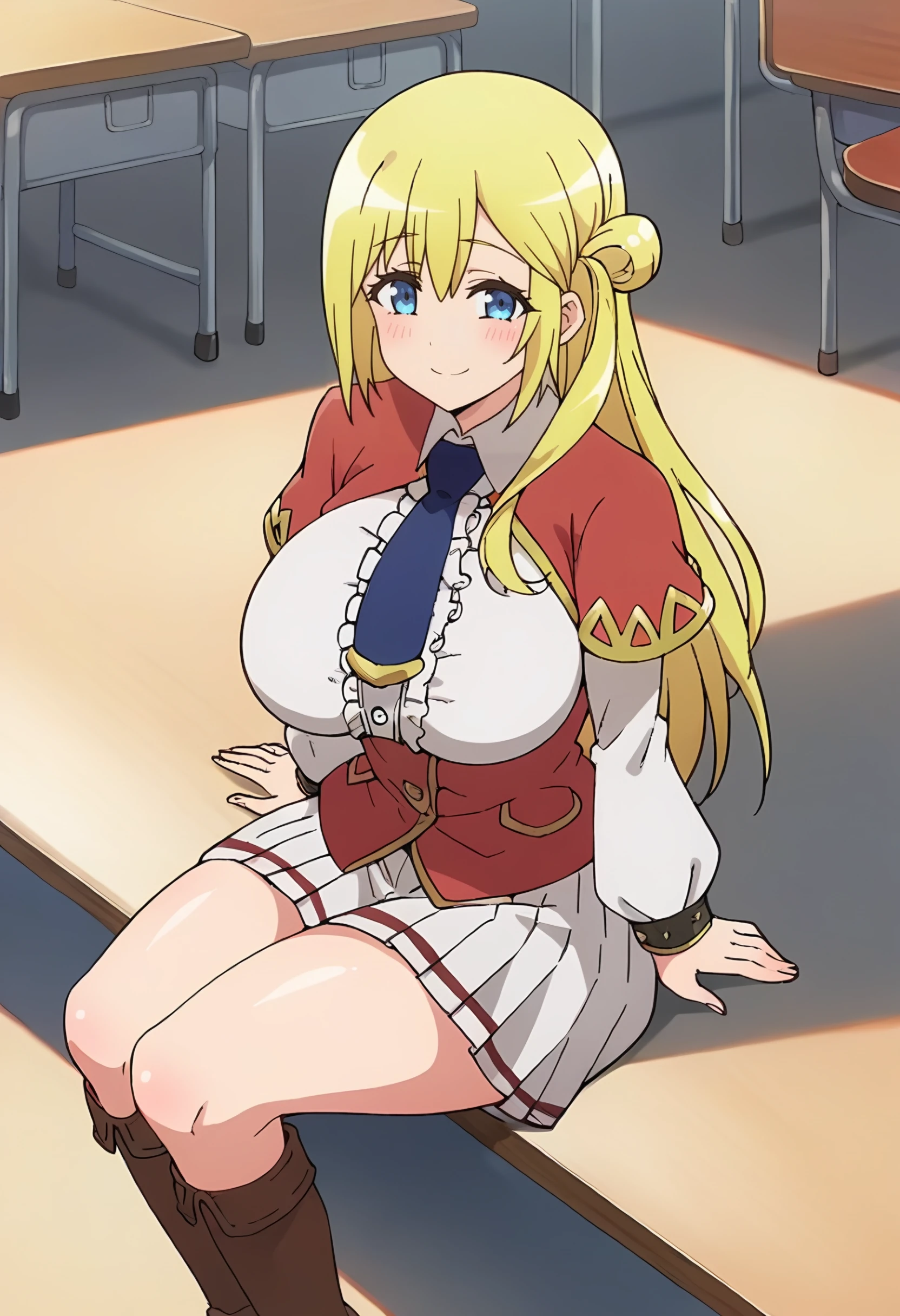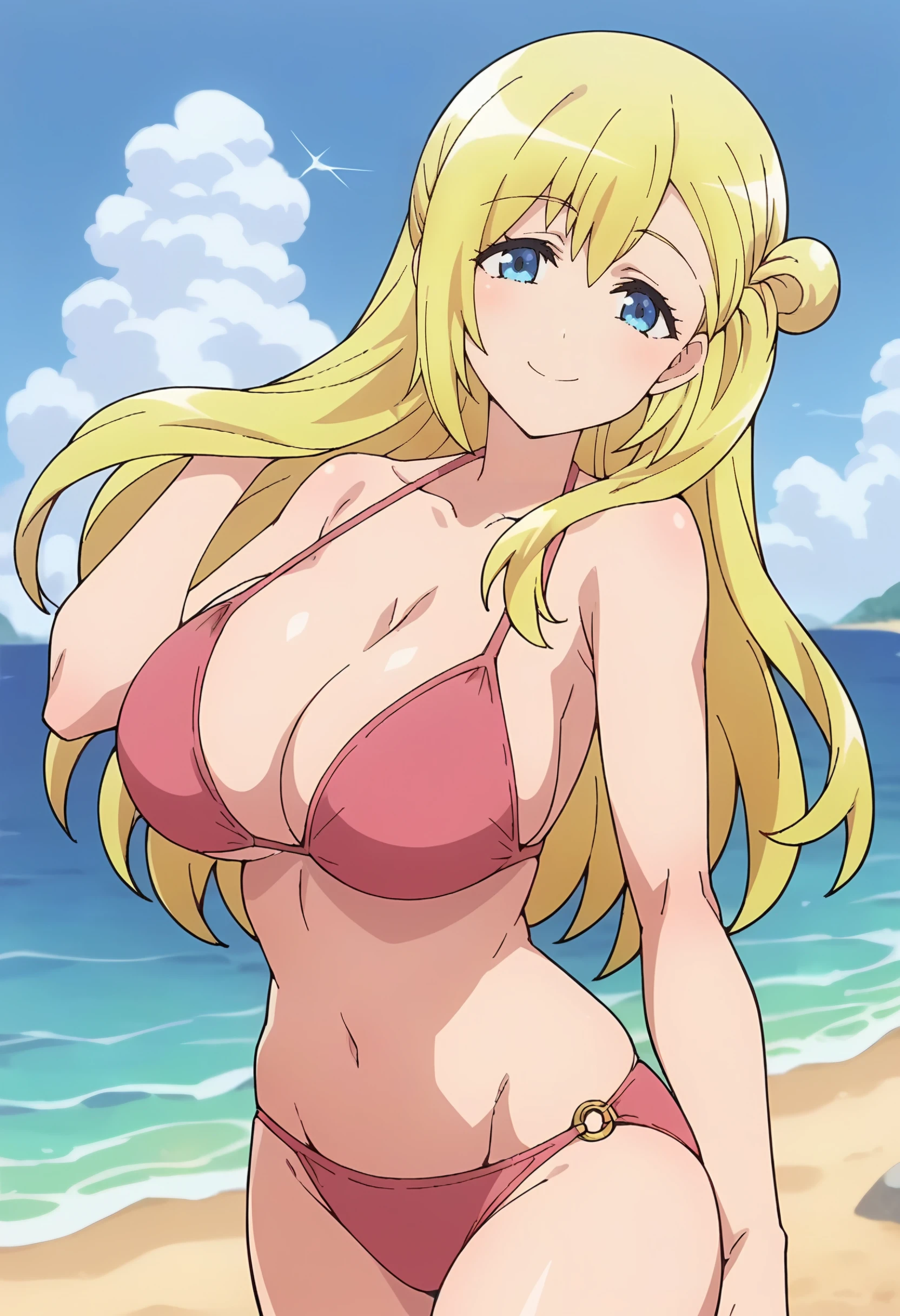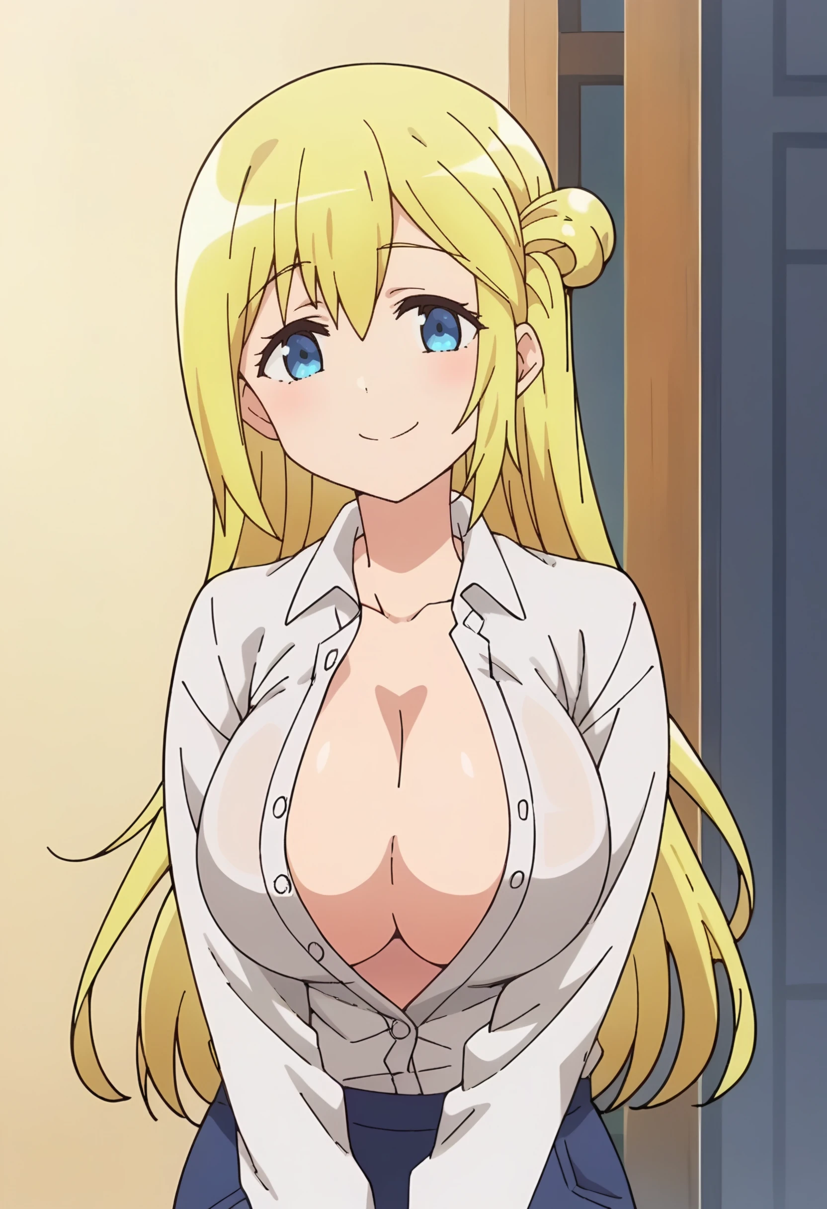 Enome, 1girl, blonde hair, solo, breasts, smile, large breasts, long hair, hair bun ,