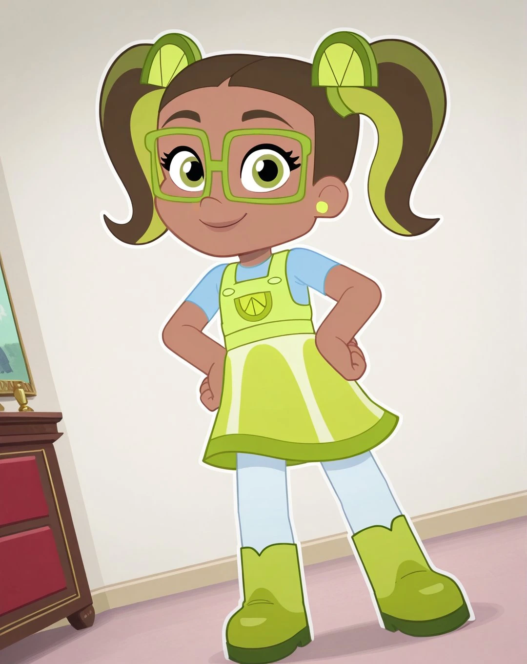 Lime_Chiffon,brown skin, green eyes, square glasses, emerald earrings, two-tone hair, brown and lime hair, pigtails, lime-shaped hair-ties, lime green overall skirt, sky blue t-shirt, pastel blue leggings, lime green riding boots