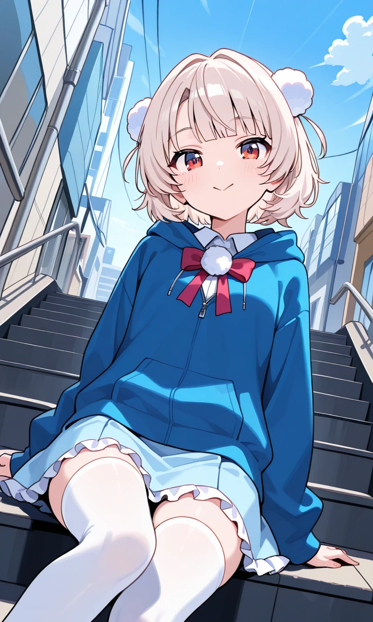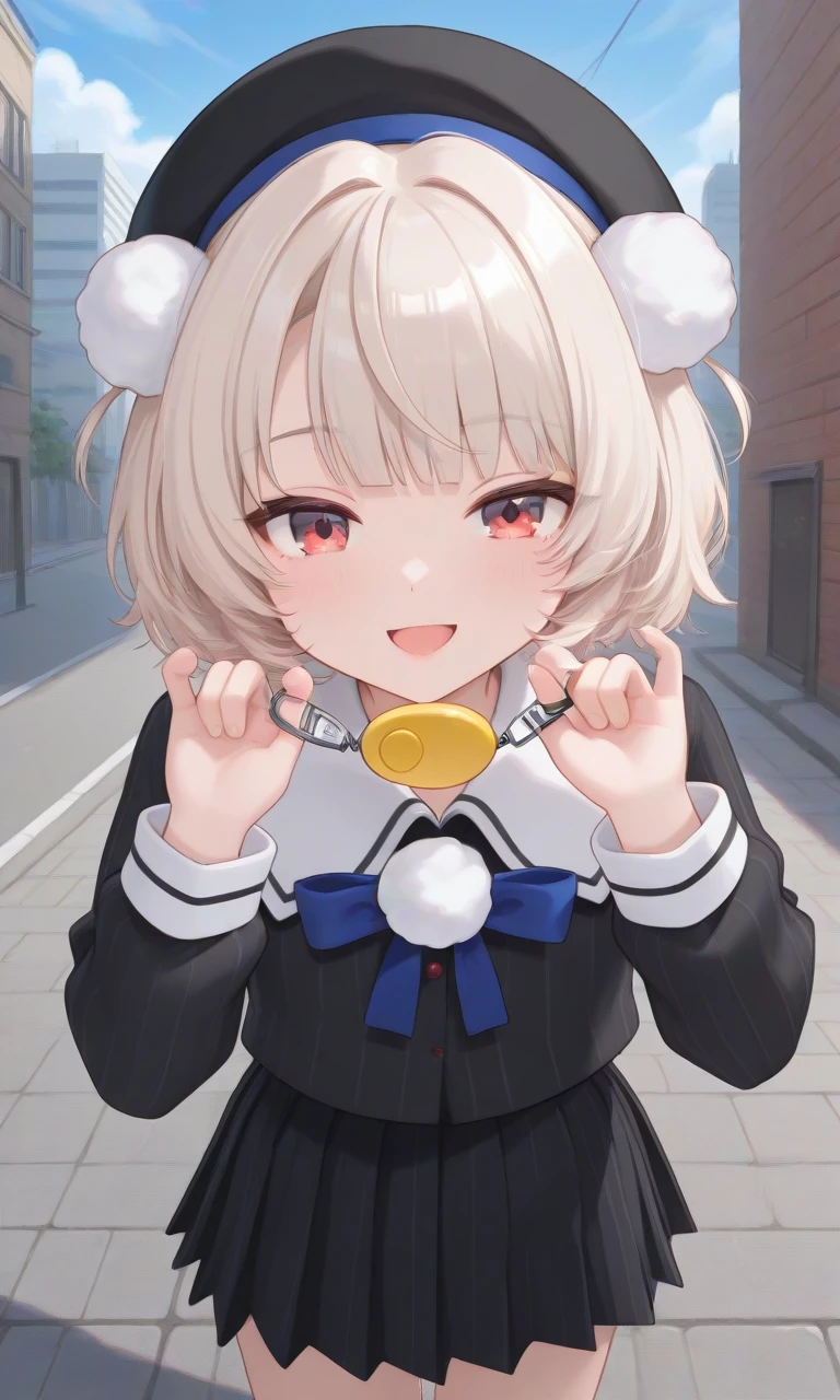 voisona ui, short hair, pom pom hair ornament, beret, black headwear, vertical-striped clothes, black shirt, white sailor collar, blue bowtie, sleeve cuffs, black skirt, pleated skirt