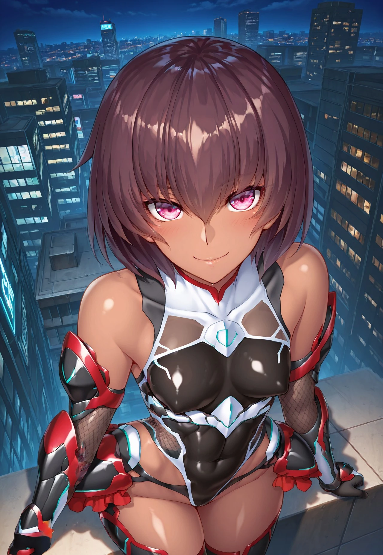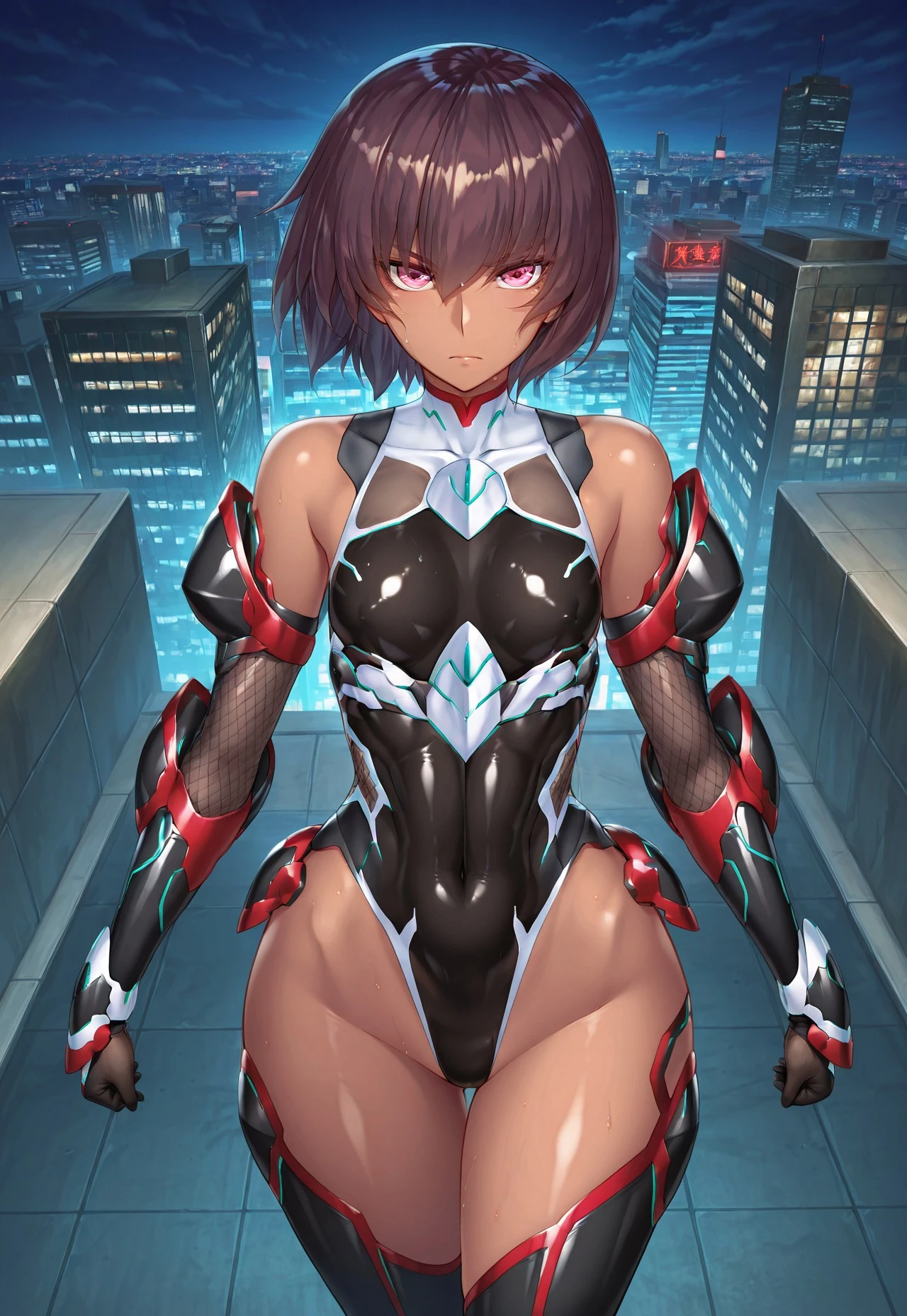 Tags: Future Yukikaze Mizuki, short hair, brown hair, tan, pink eyes, small breasts, wide hips, shiny