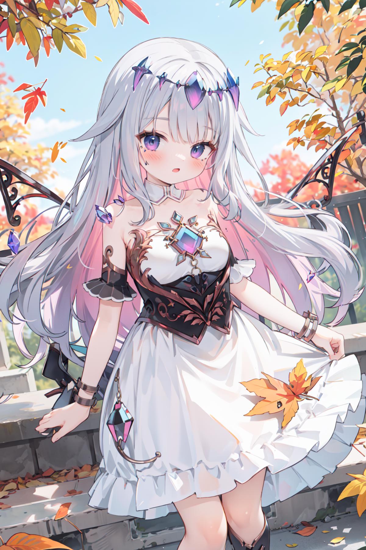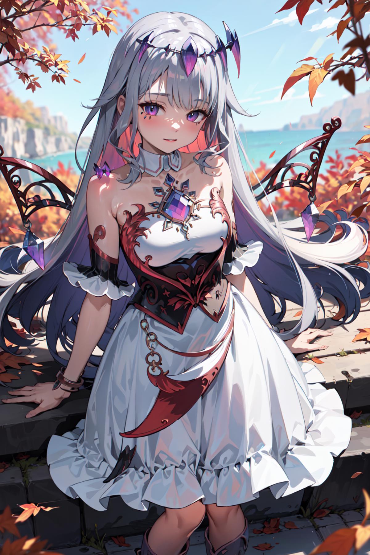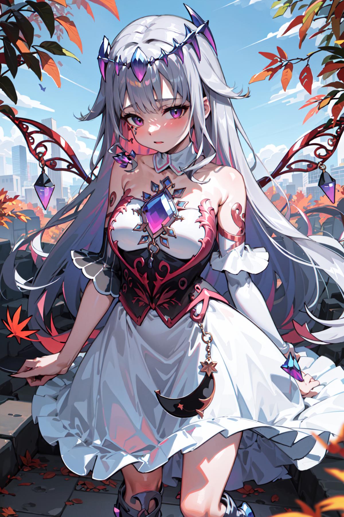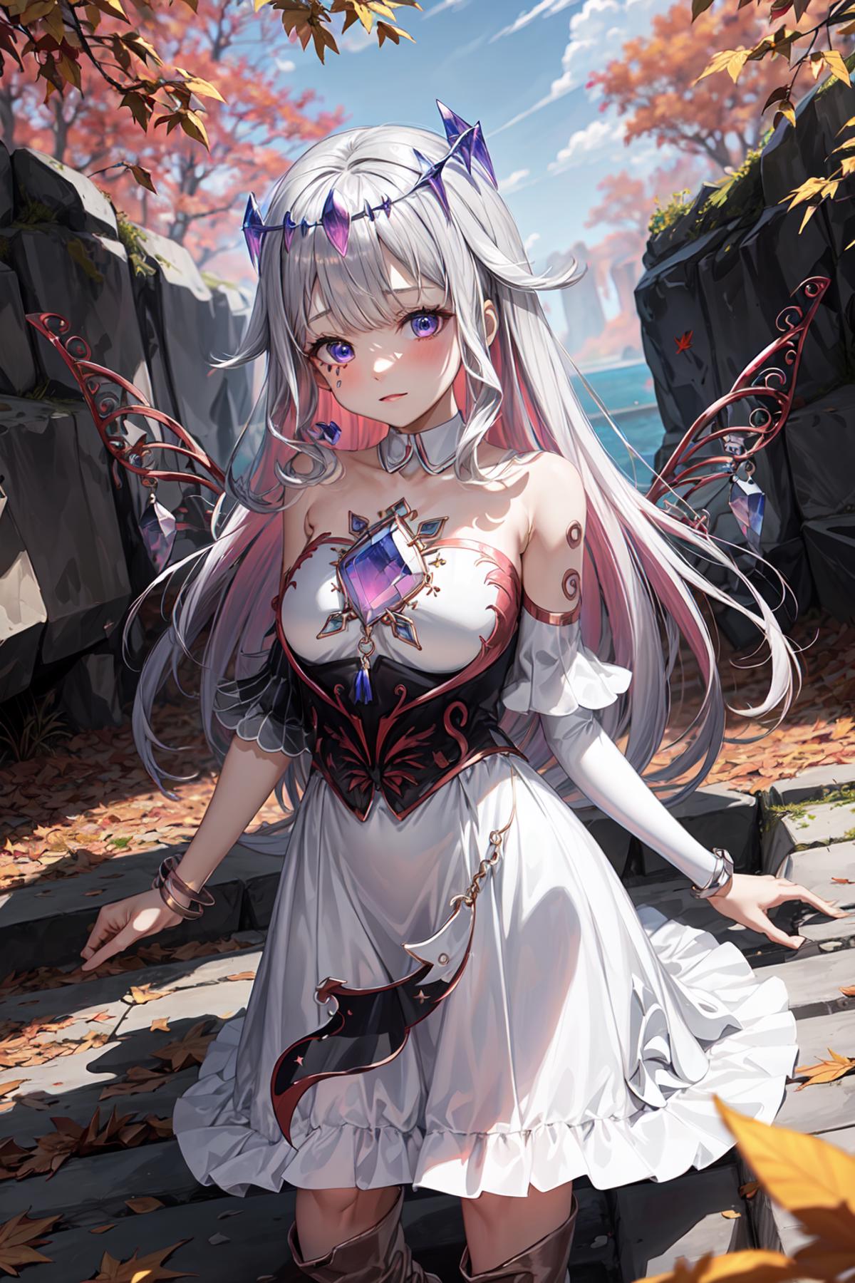 These keywords will help with the main outfit: white dress, detached sleeves, bare shoulders, wings, strapless, crystal, collarbone, short sleeves, white sleeves, strapless dress, boots