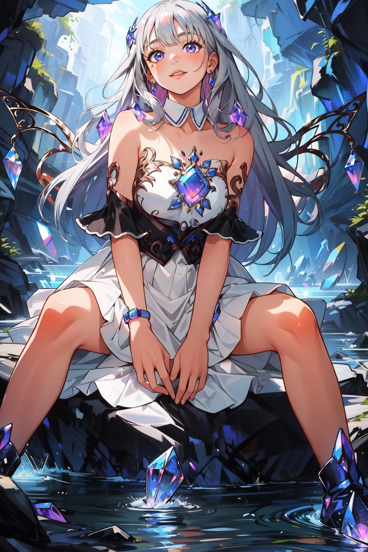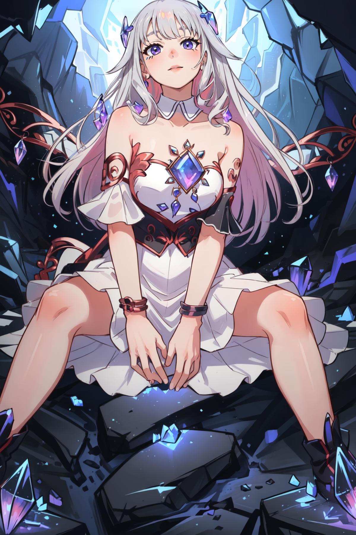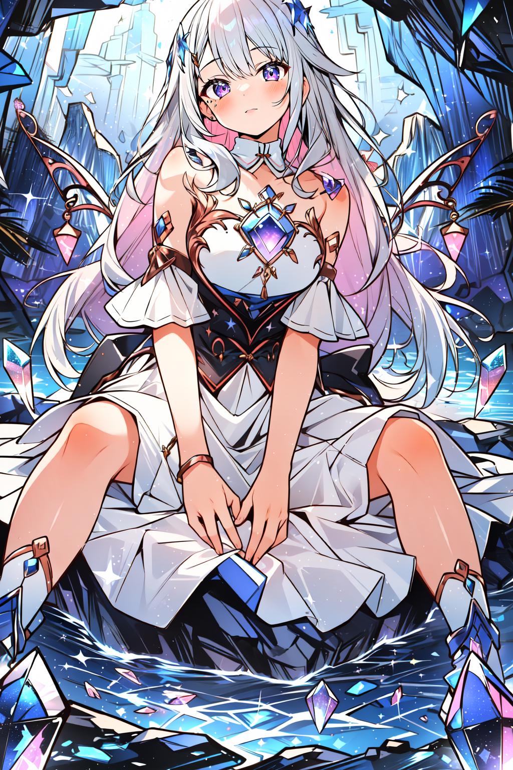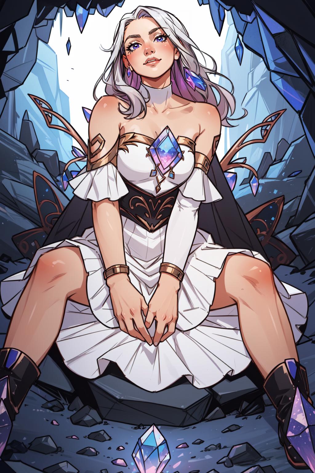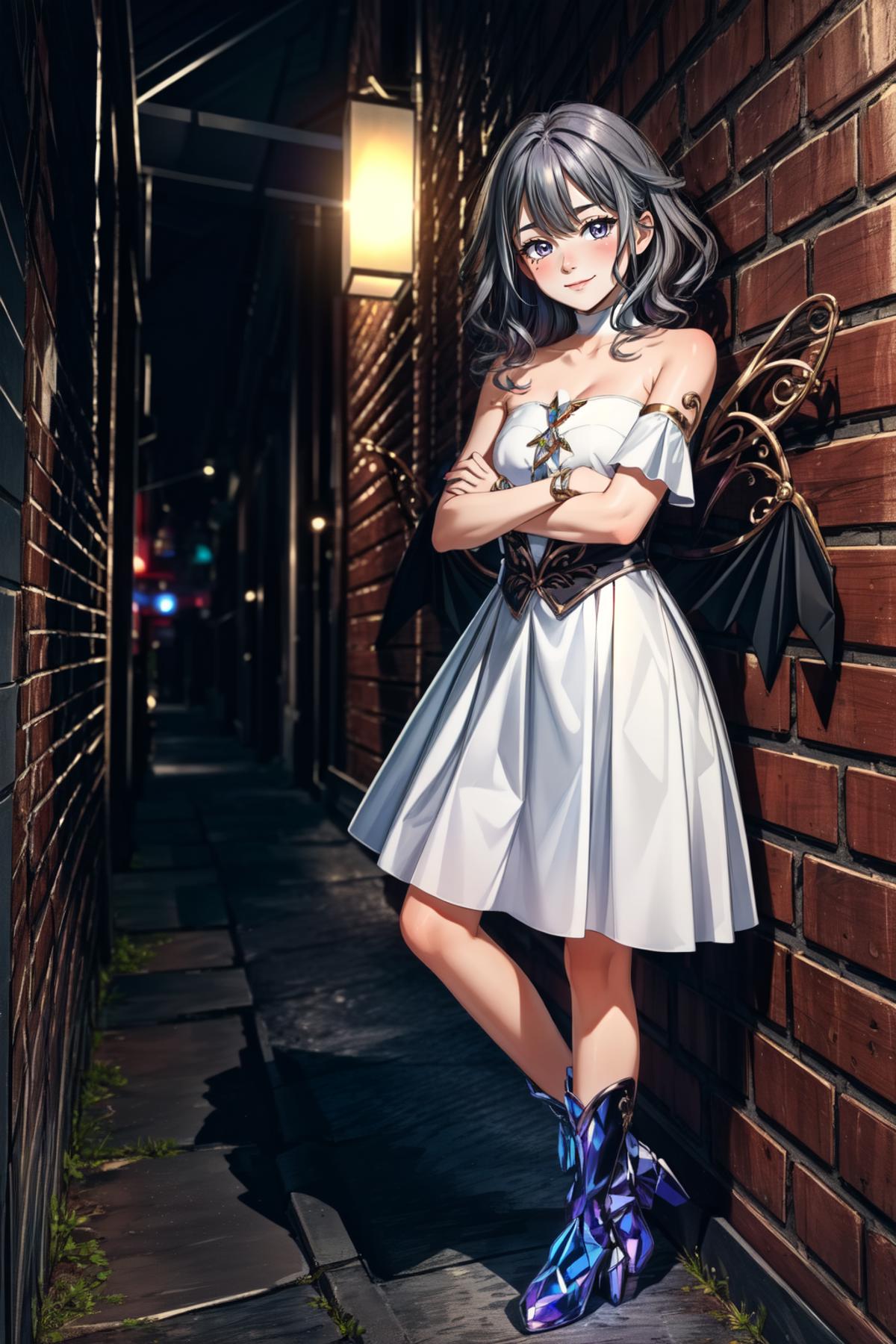 These keywords will help with the main outfit: white dress, detached sleeves, bare shoulders, wings, strapless, crystal, collarbone, short sleeves, white sleeves, strapless dress, boots