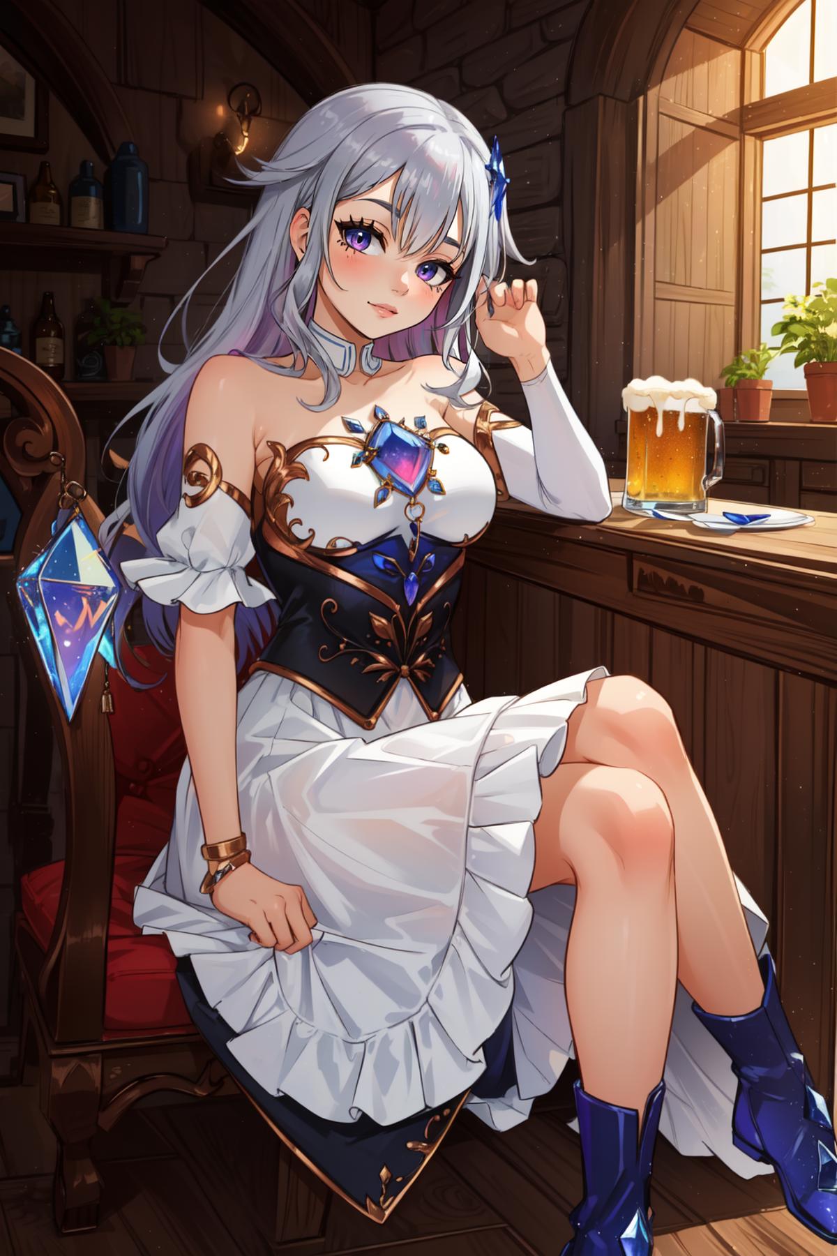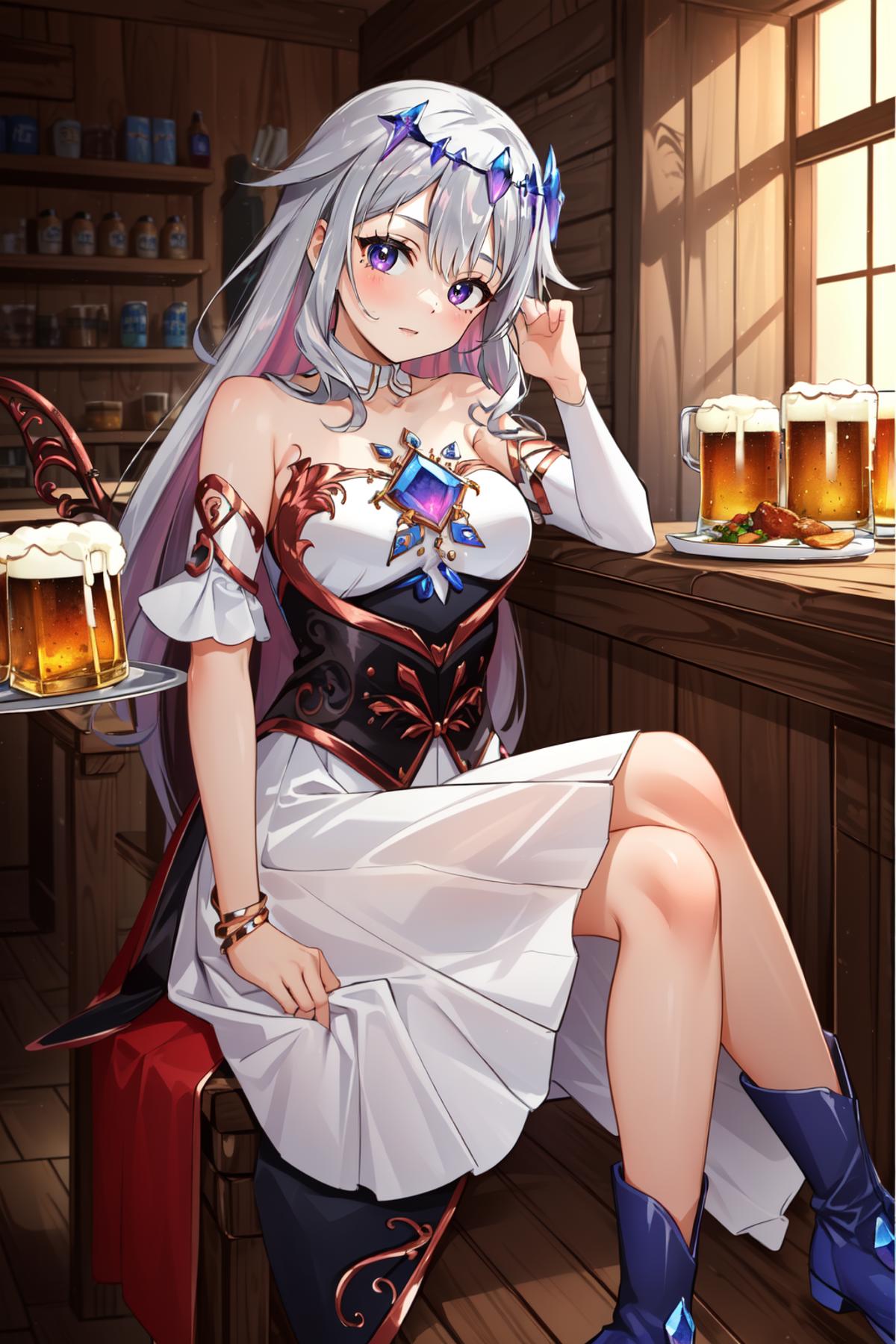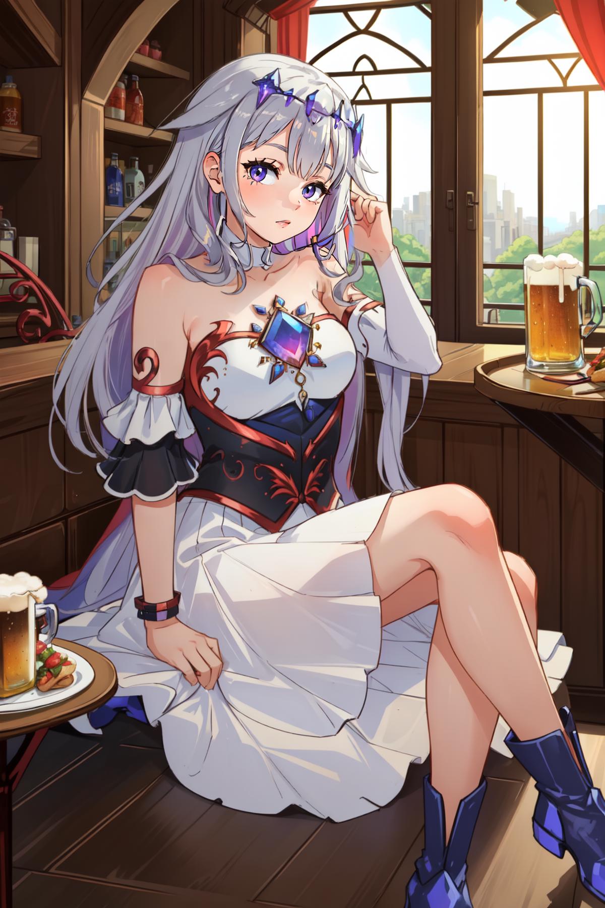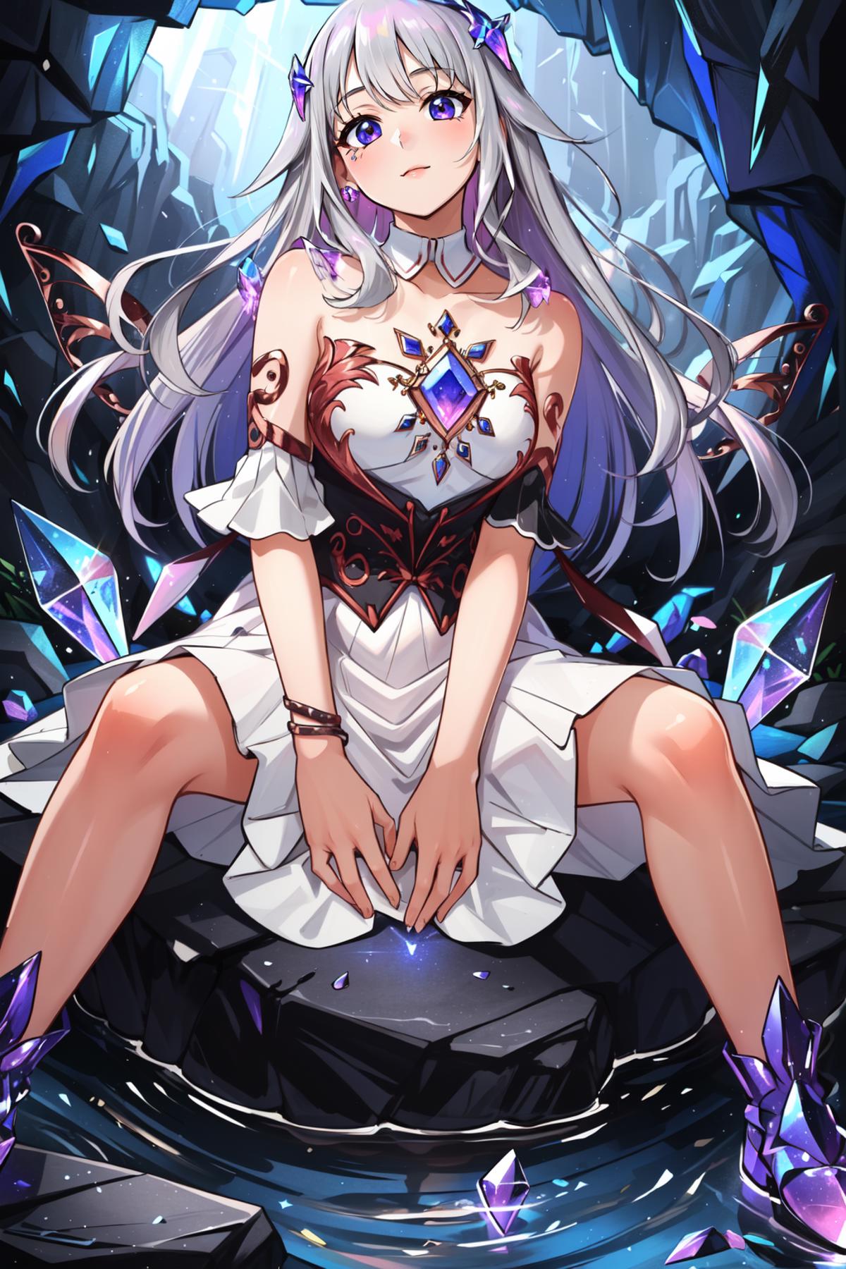 These keywords will help with the main outfit: white dress, detached sleeves, bare shoulders, wings, strapless, crystal, collarbone, short sleeves, white sleeves, strapless dress, boots
