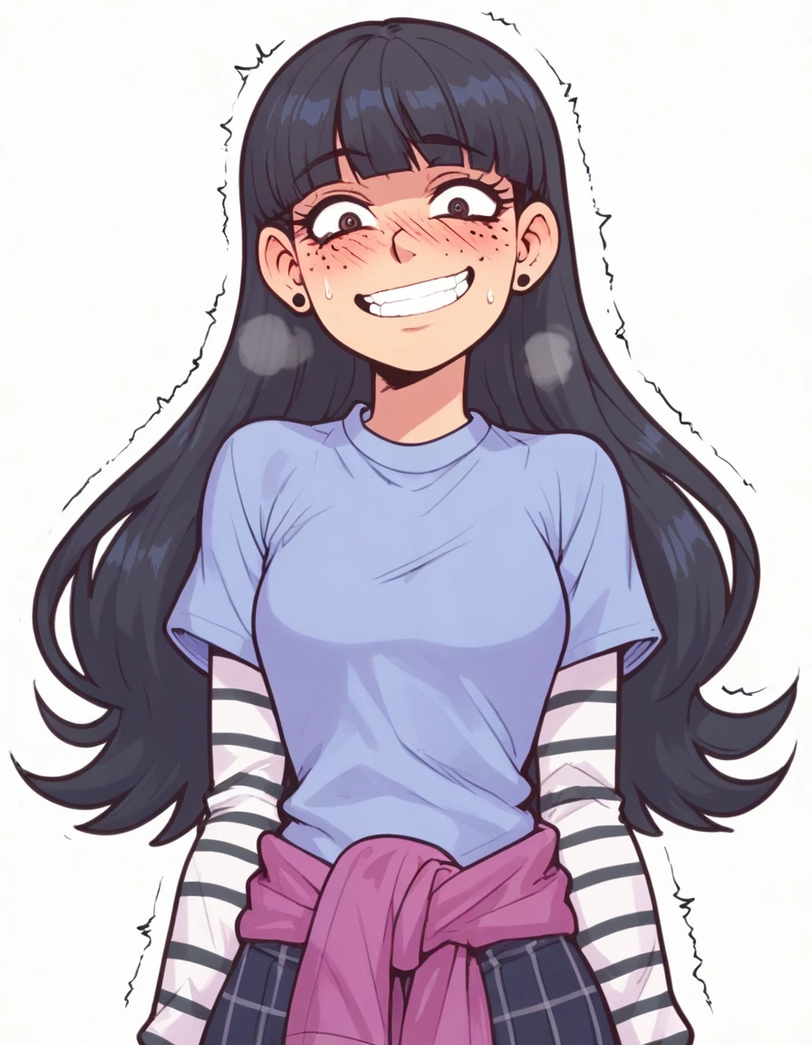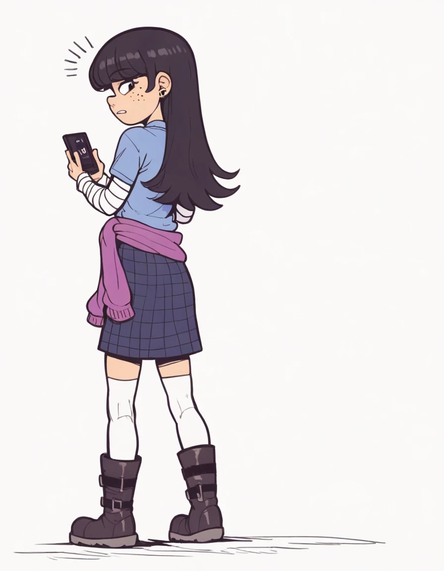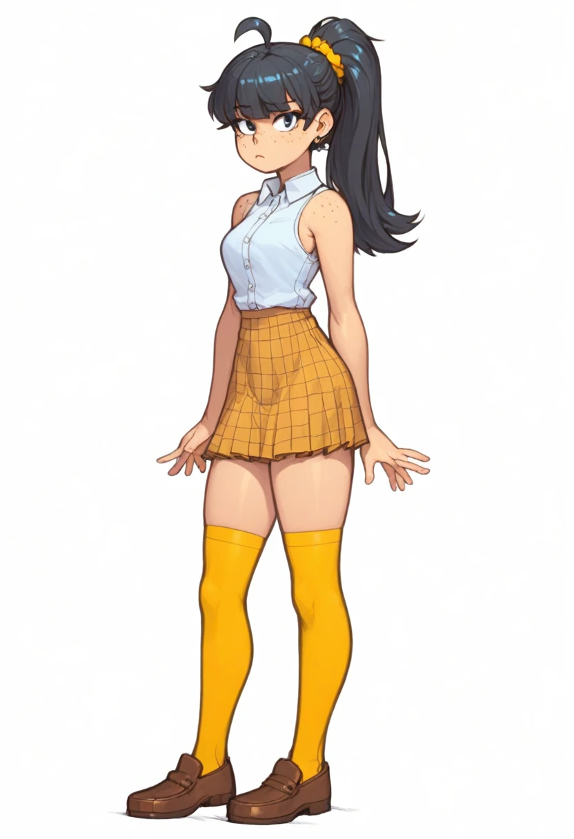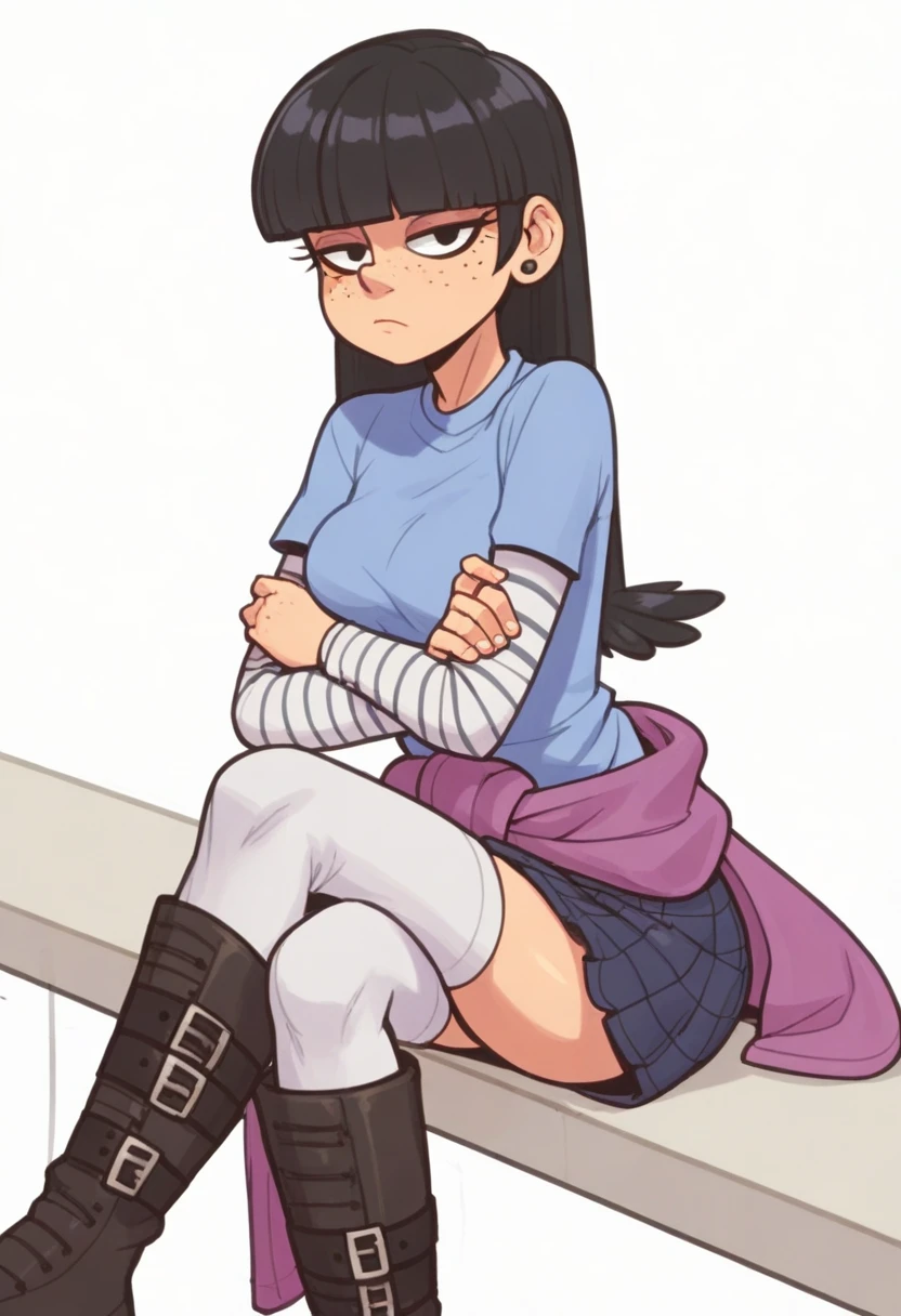black hair, freckles, stud earrings, blue shirt, short over long sleeves, sweater around waist, plaid skirt, white thighhighs, knee boots