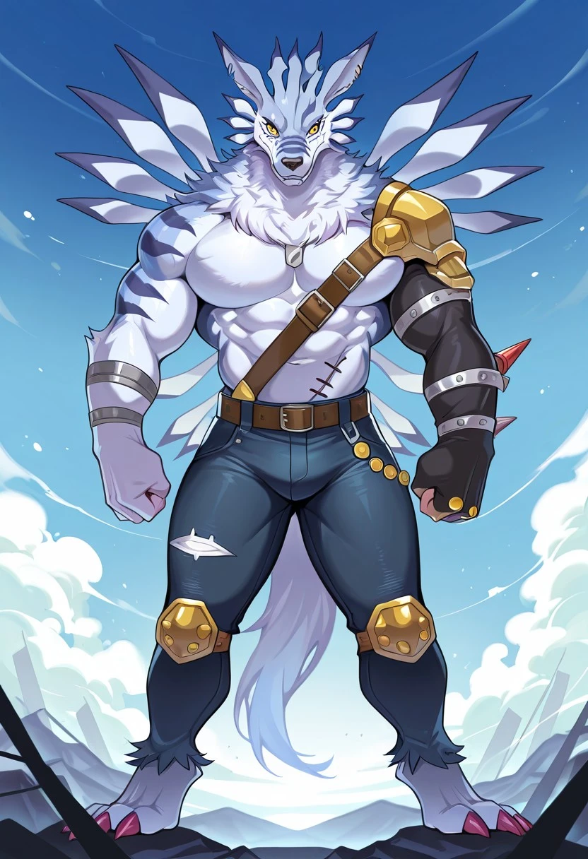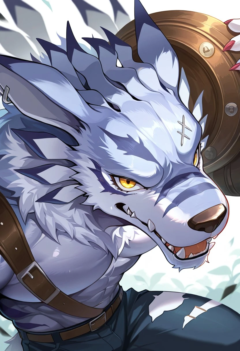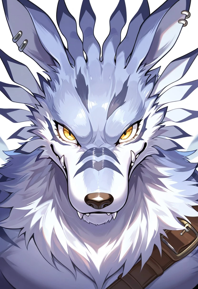 wolf boy, weregarurumon, white fur, blue fur, yellow eyes,