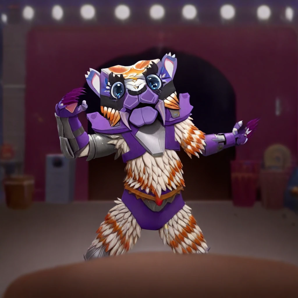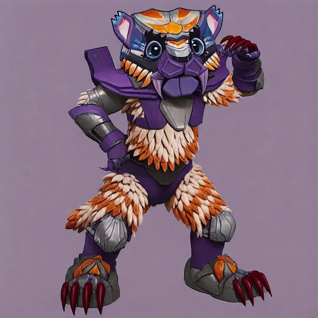 Me-Ouch,furry,furry female,anthro,cat,purple fur,brownish-orange feathers,blue eyes,cat eyes,claws,fangs,armour,eye brows,tail,cat tail with brownish-orange feathers