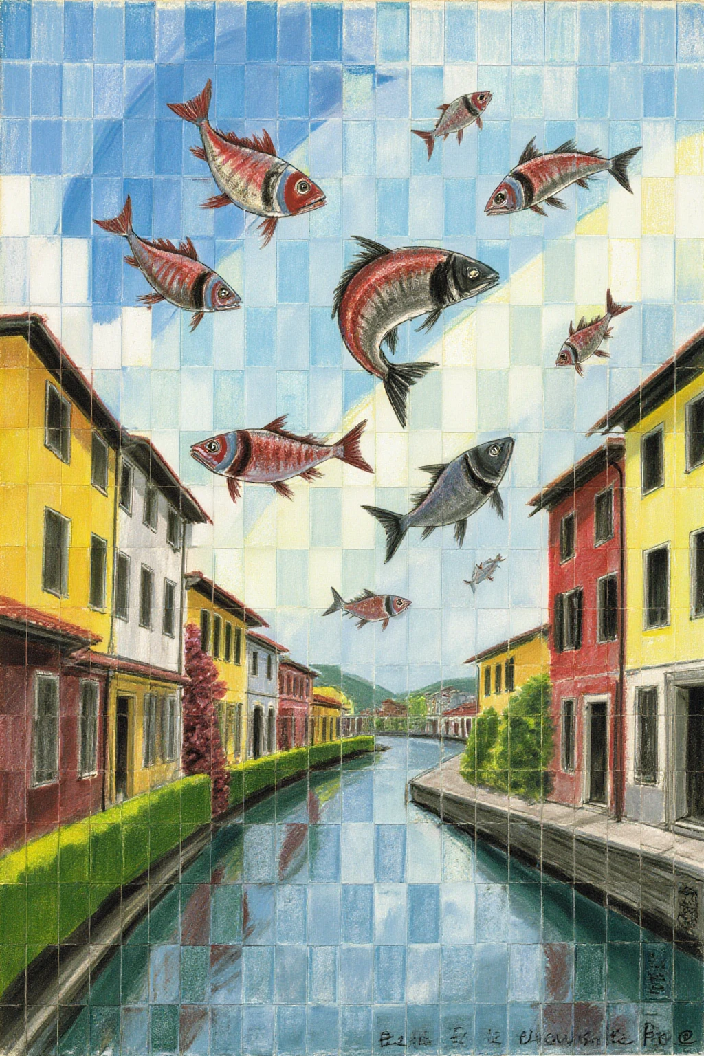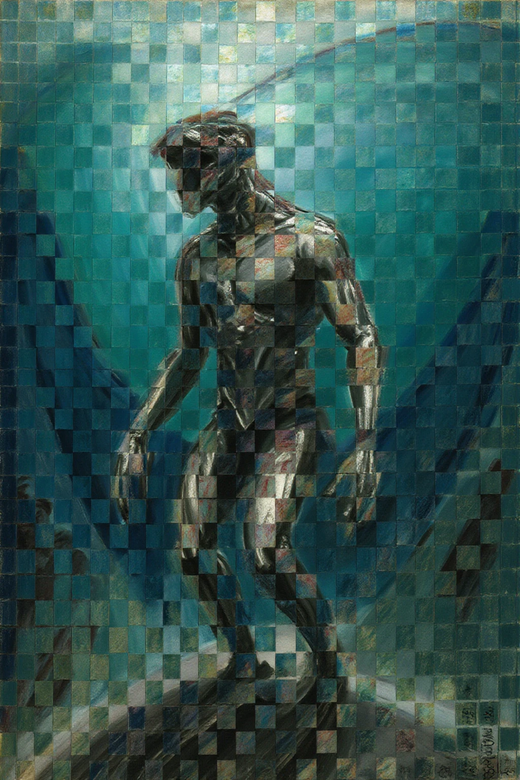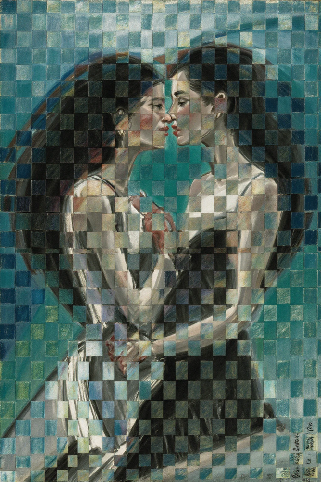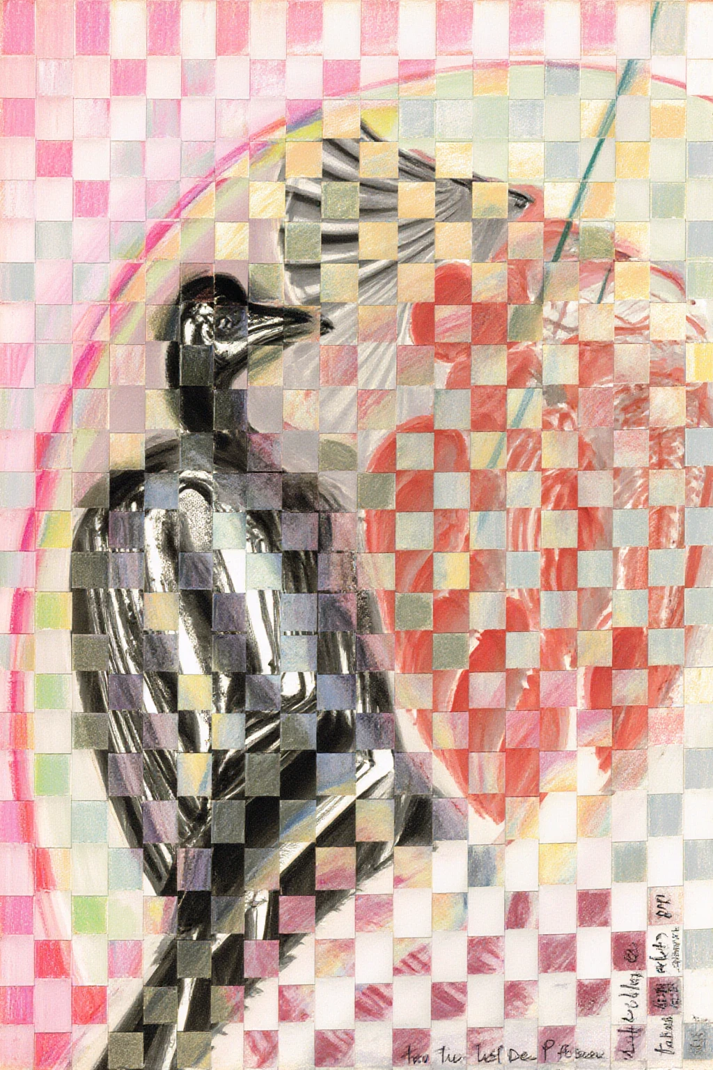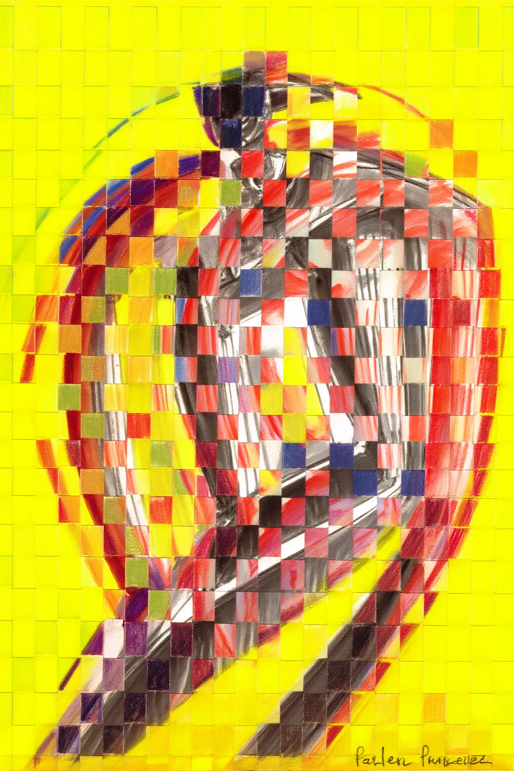 The image is a digital art piece that appears to be made up of small squares arranged in a mosaic-like pattern. The squares are of different sizes and colors, creating a mosaic effect. In the center of the image, there is a bird with a black beak and wings, perched on a branch. The bird is facing towards the right side of the frame, with its head turned slightly to the left. The background is a light pink color, and the overall effect is one of depth and dimension. The overall style of the piece is abstract and colorful, with a mix of geometric shapes and lines.
