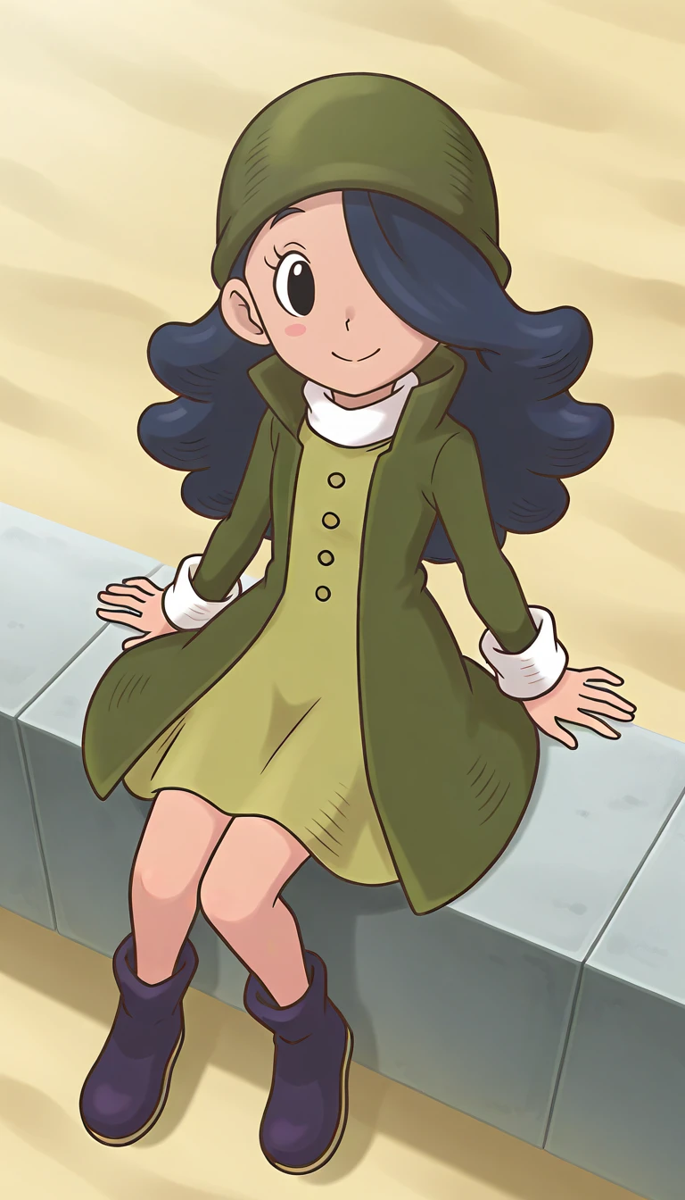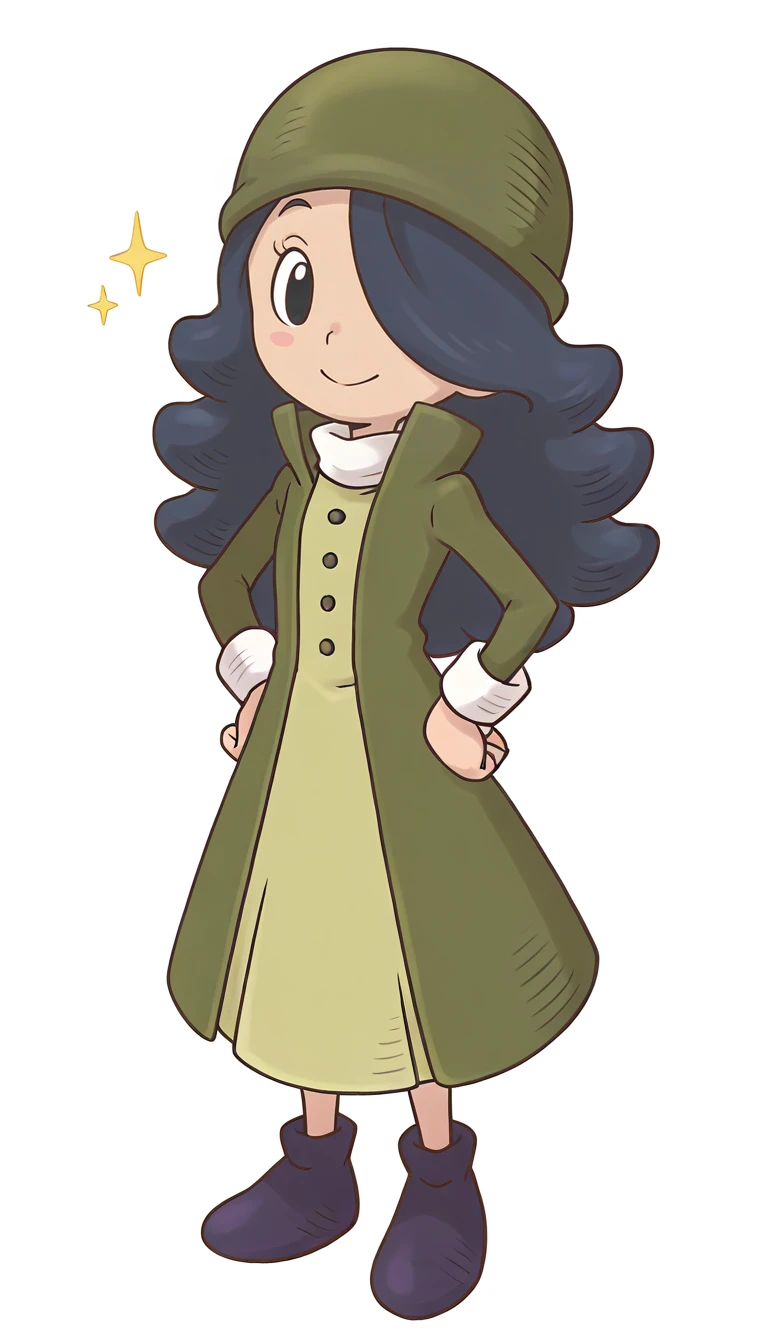 Outfit: green headwear, hat, coat, open coat, high collar, long sleeves, buttons, white collar, dress, footwear