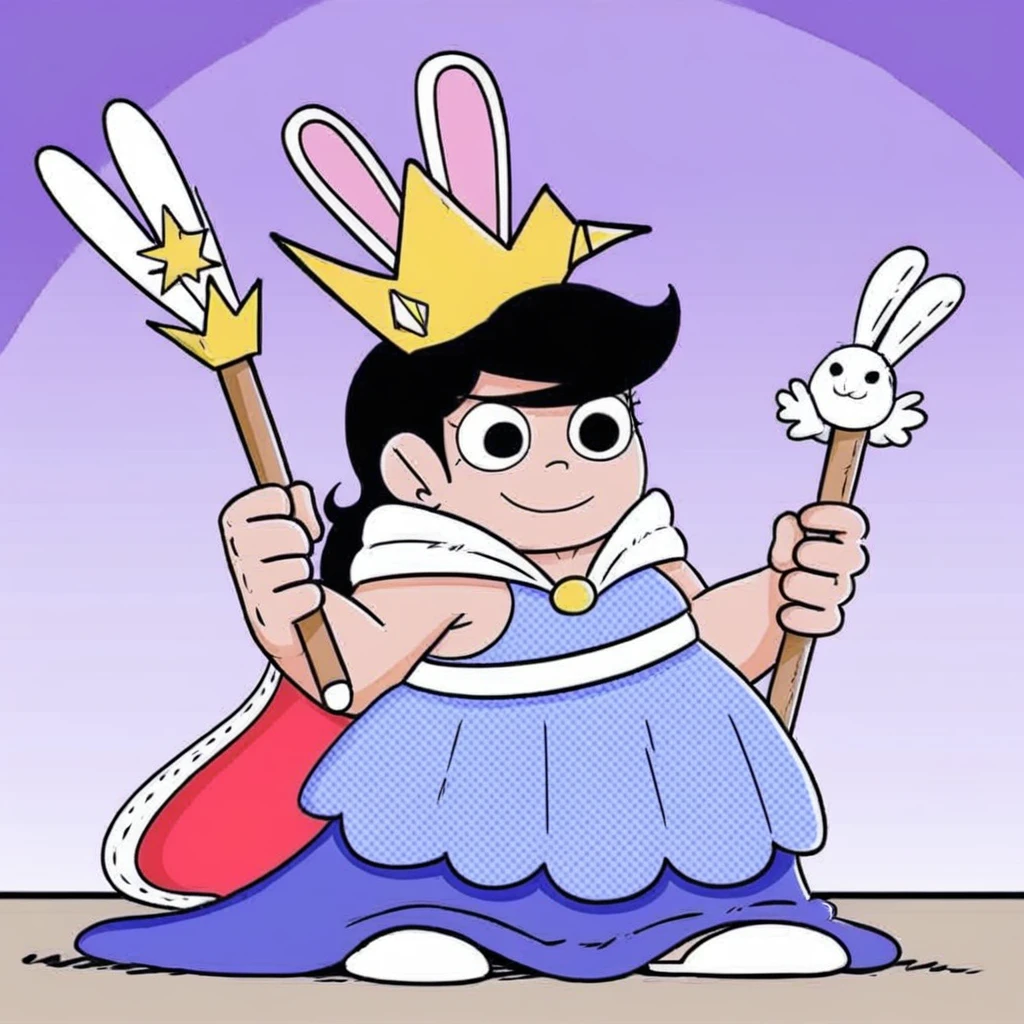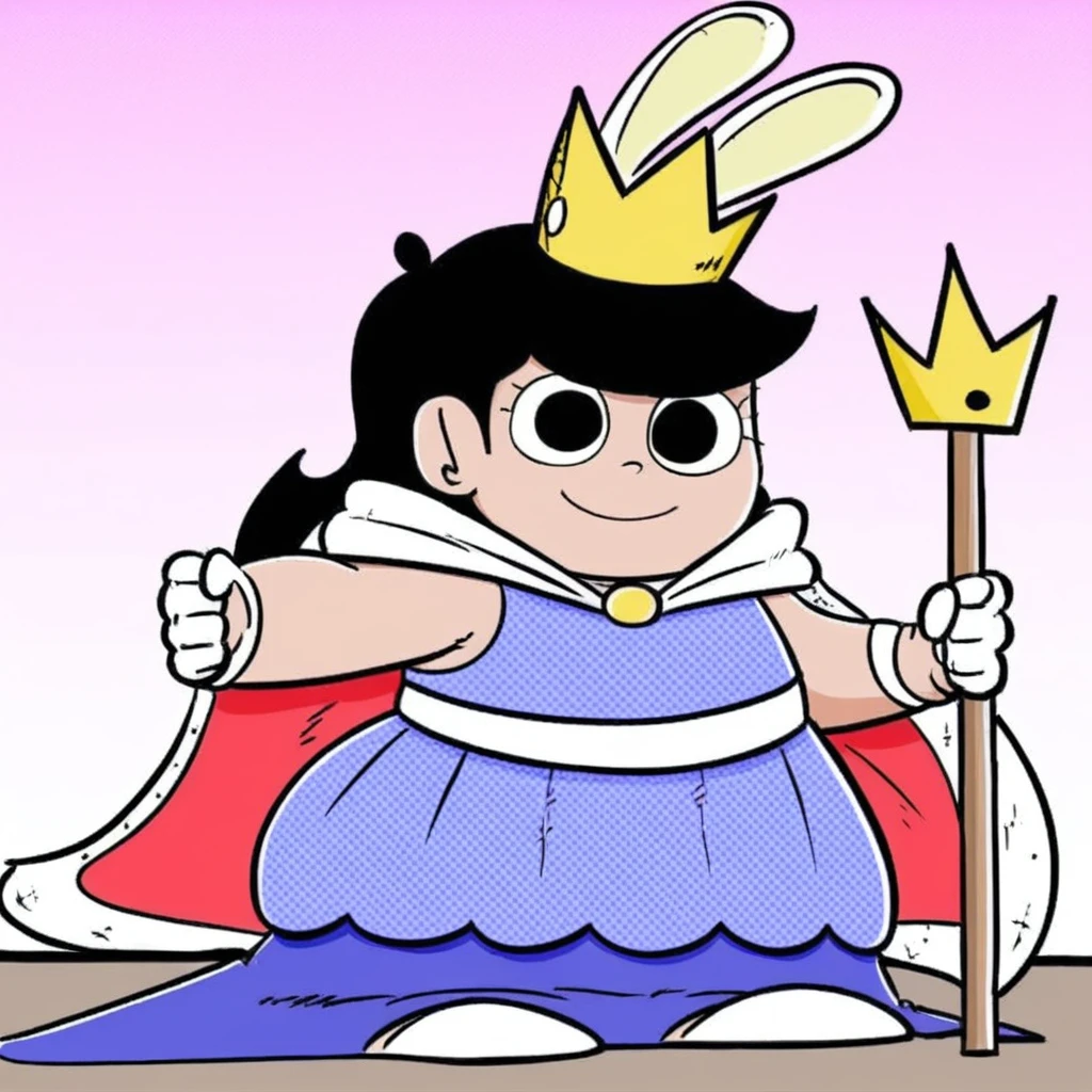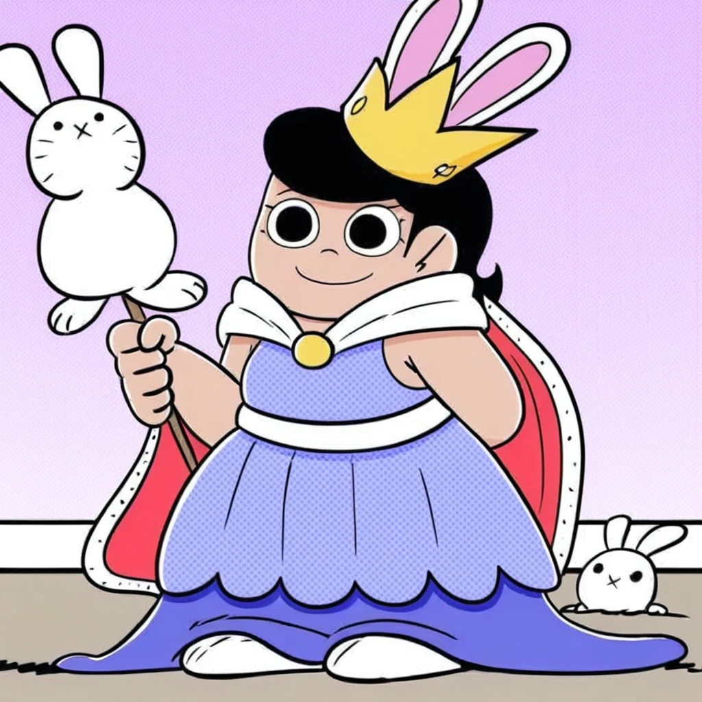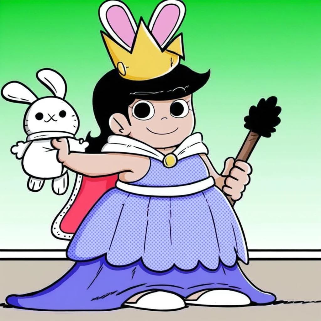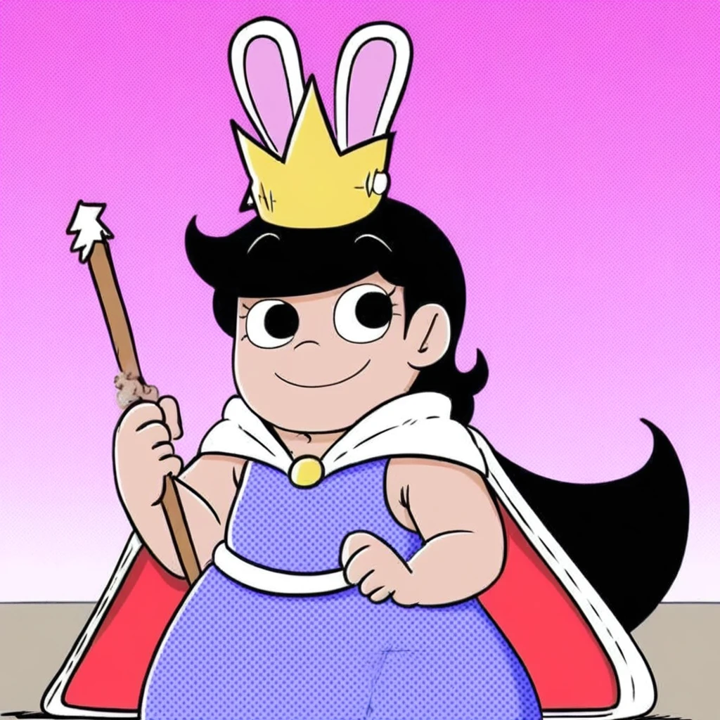 Princes Bunny: maricela, 1girl, solo, plump, fat, black hair, black eyes, smile, bunny hat, fake bunny ears, blue dress, crown, cape, bunny princess costume