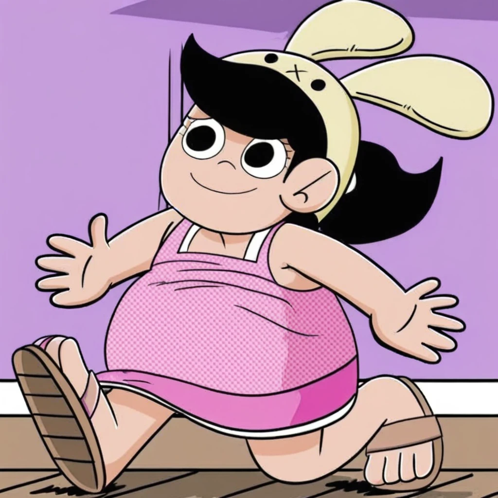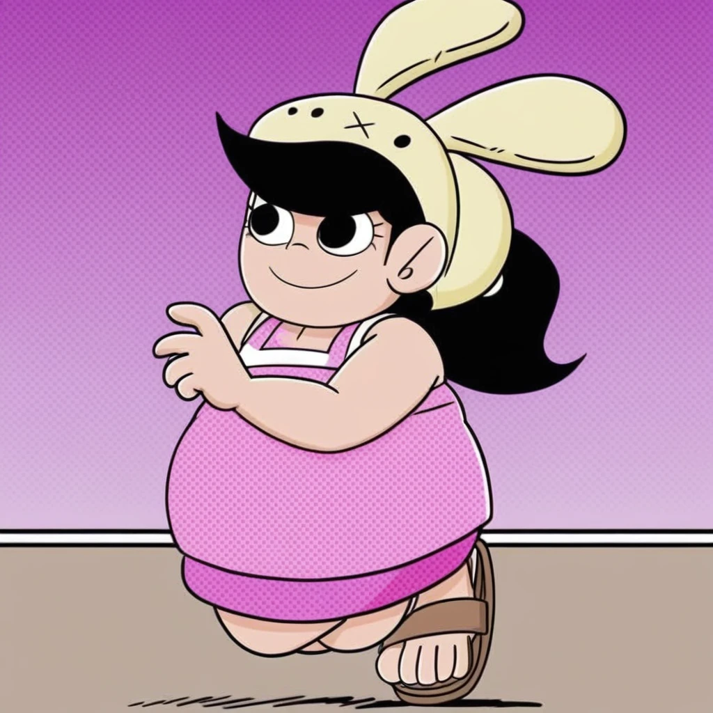 standard clothes: maricela, 1girl, solo, plump, fat, black hair, black eyes, smile, bunny hat, fake bunny ears, pink dress, pink skirt, sandals