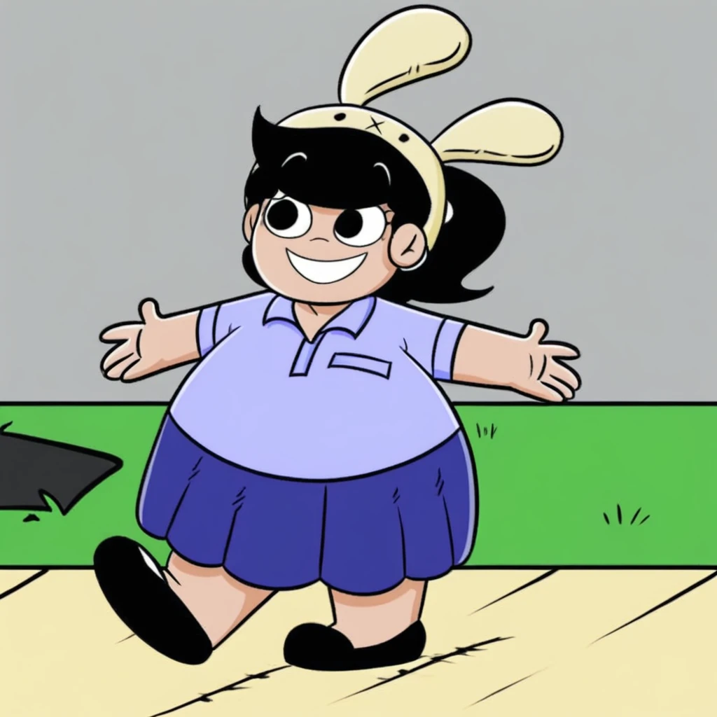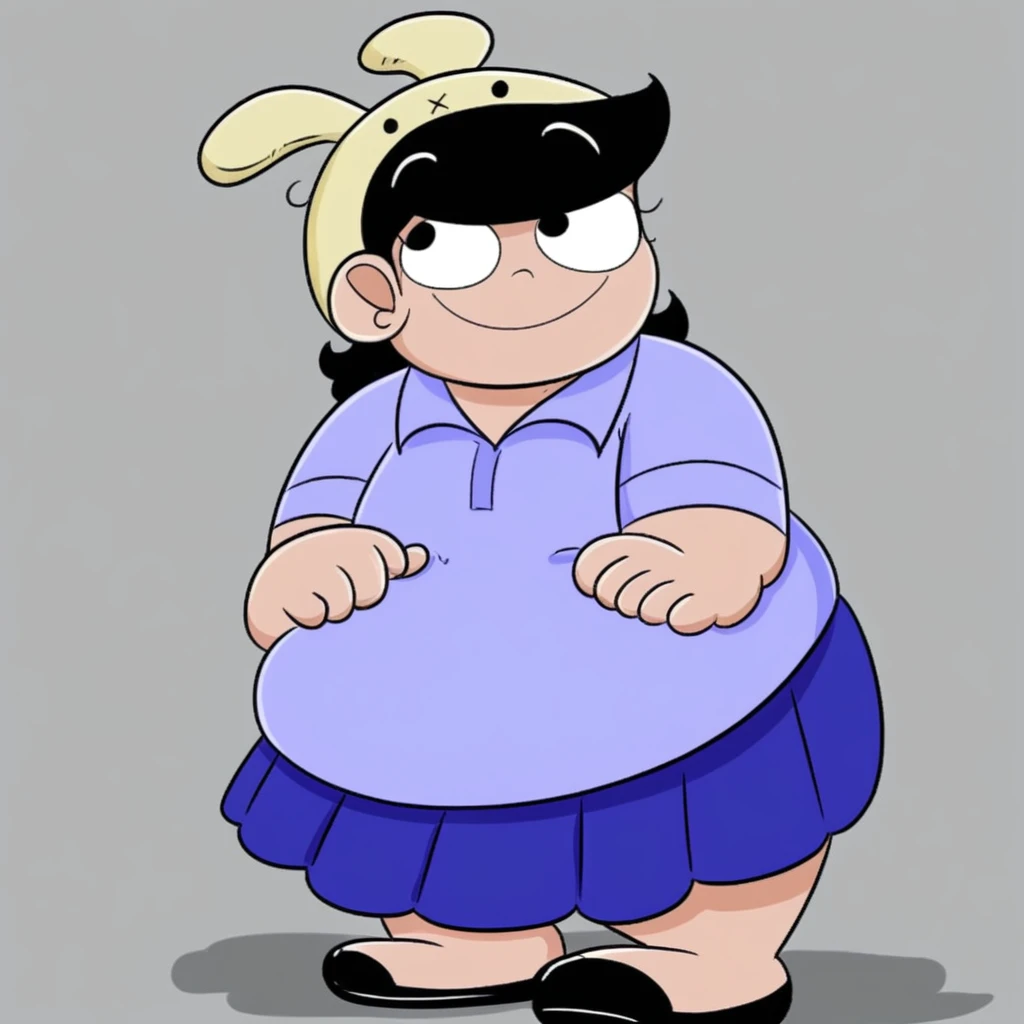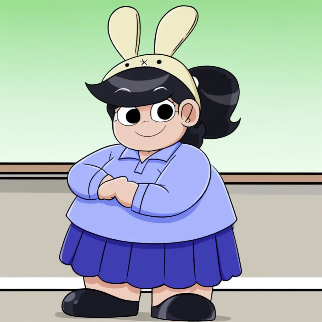 School uniform: maricela, 1girl, solo, plump, fat, black hair, black eyes, smile, bunny hat, fake bunny ears, school shirt, blue shirt, school skirt, blue skirt, black shoes