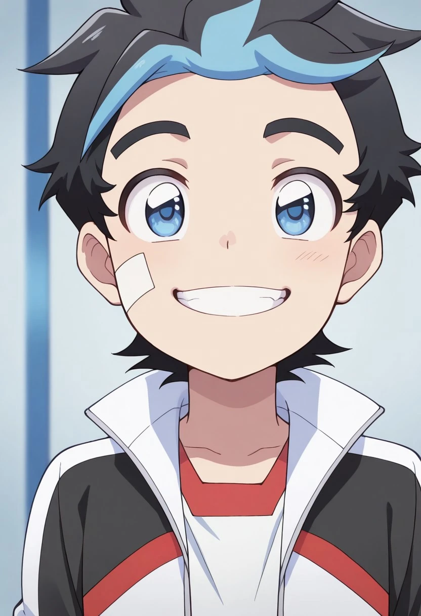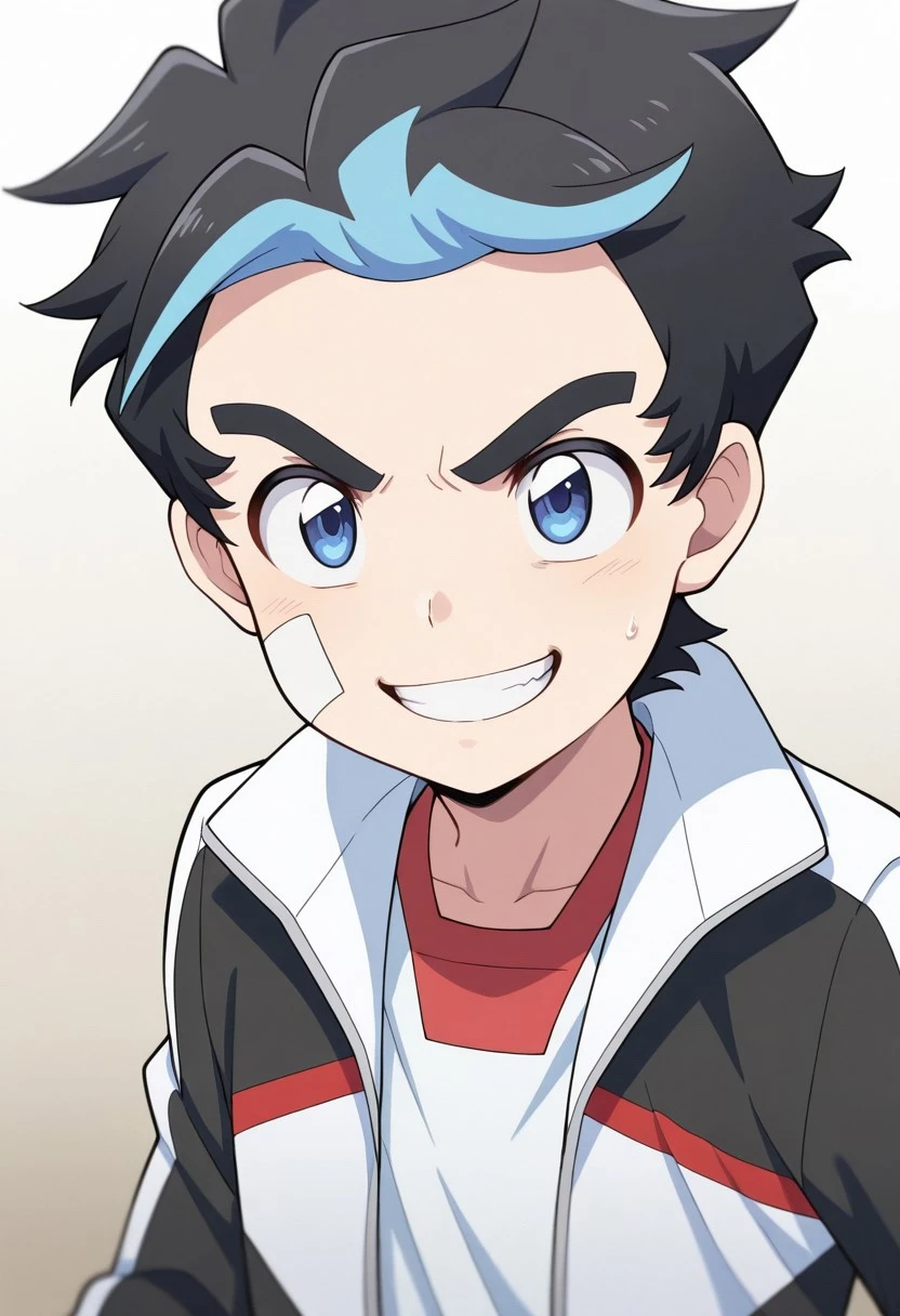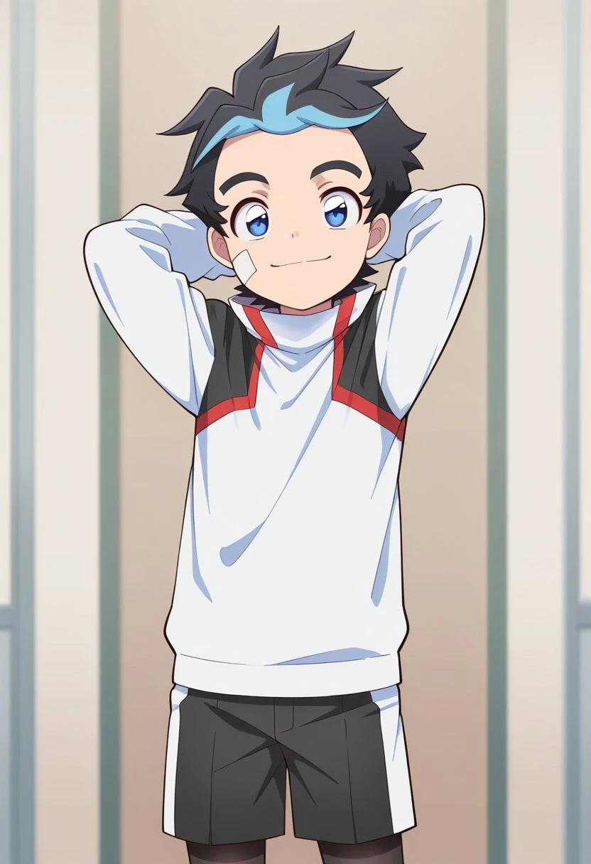 Casual - TatsuKiyos, 1boy, male focus, solo, blue eyes, multicolored hair, black hair, blue hair, bandaid on cheek, shirt, white shirt, track jacket, multicolored jacket, open jacket, pants, black pants, shoes, blue footwear,