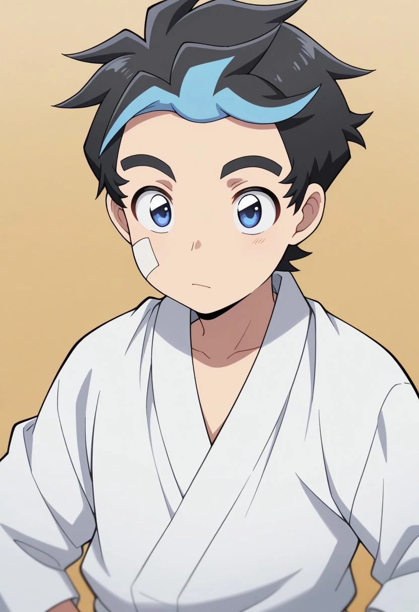 Casual - tatsumi, 1boy, male focus, pants, shirt, jacket, white shirt, open clothes, black hair, shoes, black pants, blue eyes, multicolored hair, open jacket, long sleeves, blue hair, short hair, bandaid, bandaid on face, white footwear, black jacket, bangs,