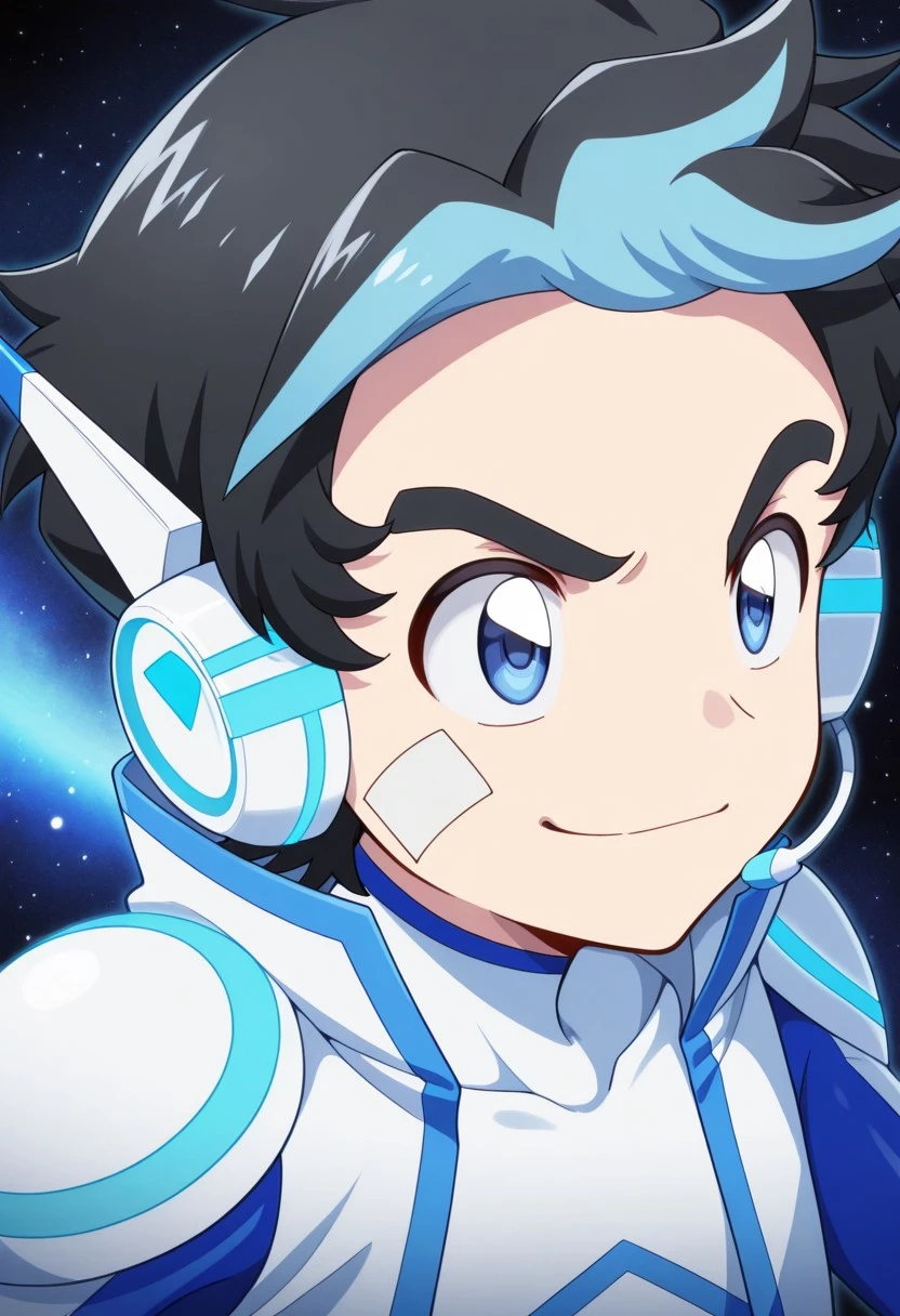 Suit - TatsuKiyos, 1boy, male focus, solo, blue eyes, multicolored hair, black hair, blue hair, bandaid on cheek, headset, white and blue bodysuit, boots,