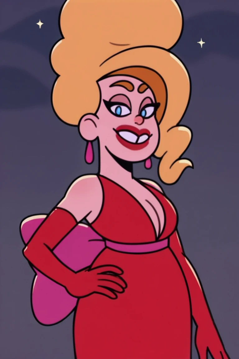 p4ulin3, blonde hair, blue eyes, lipstick, makeup, earrings, red dress, red elbow gloves, red heels