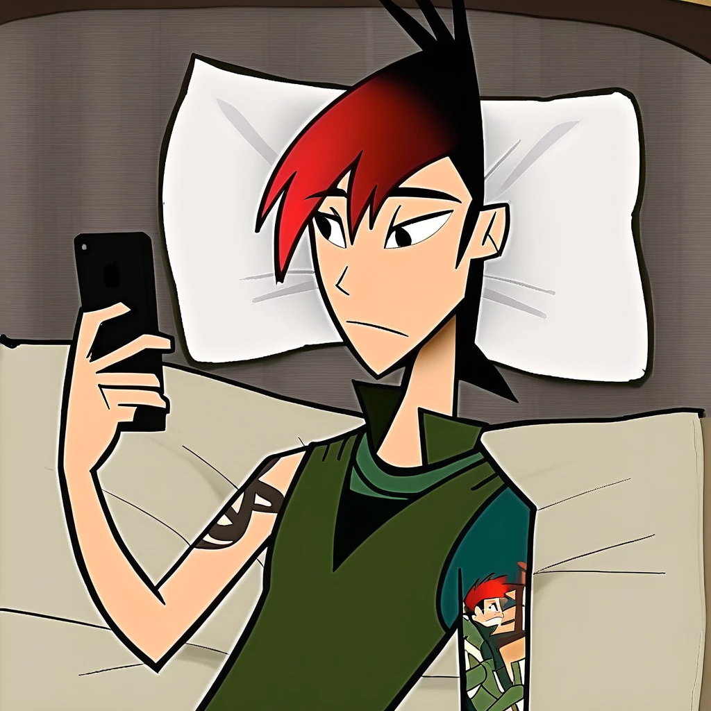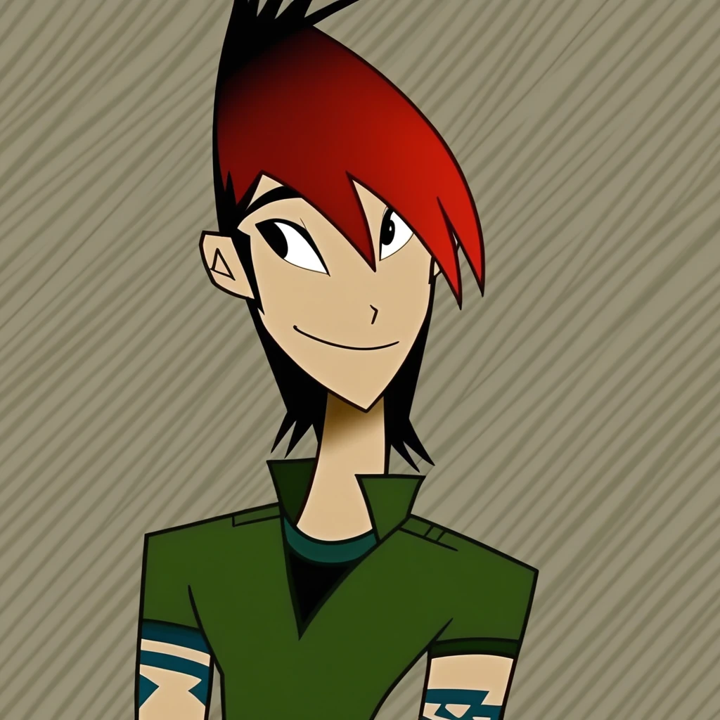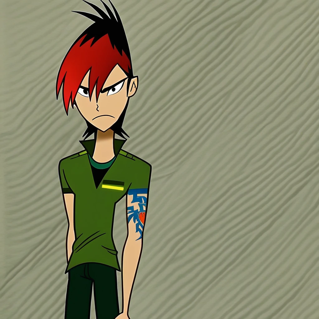 Trigger words: red hair, black hair, two-tone hair, black eyes, tattoo, green polo shirt, dark green pants, orange converses, lee ping