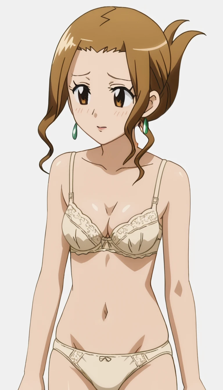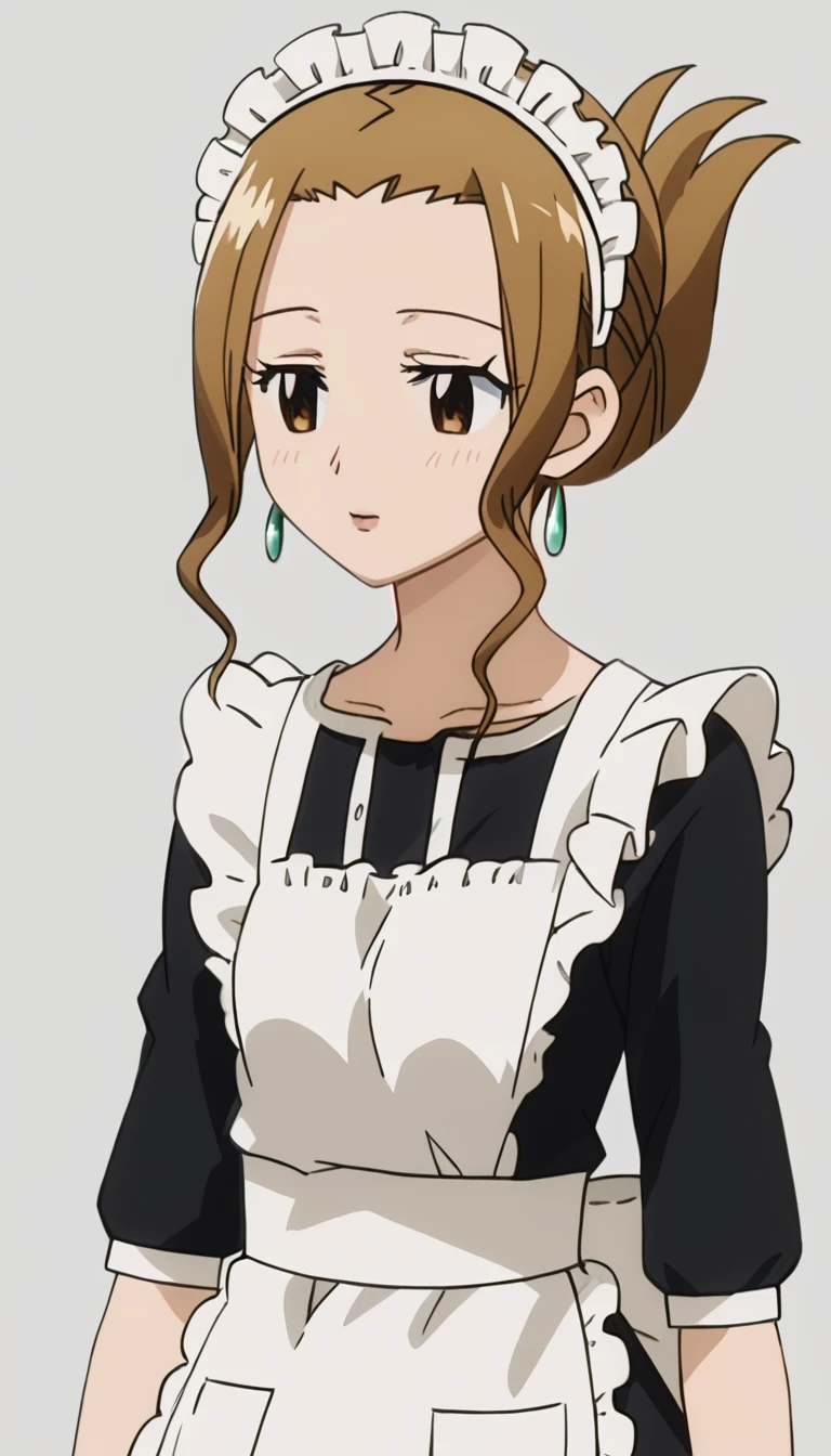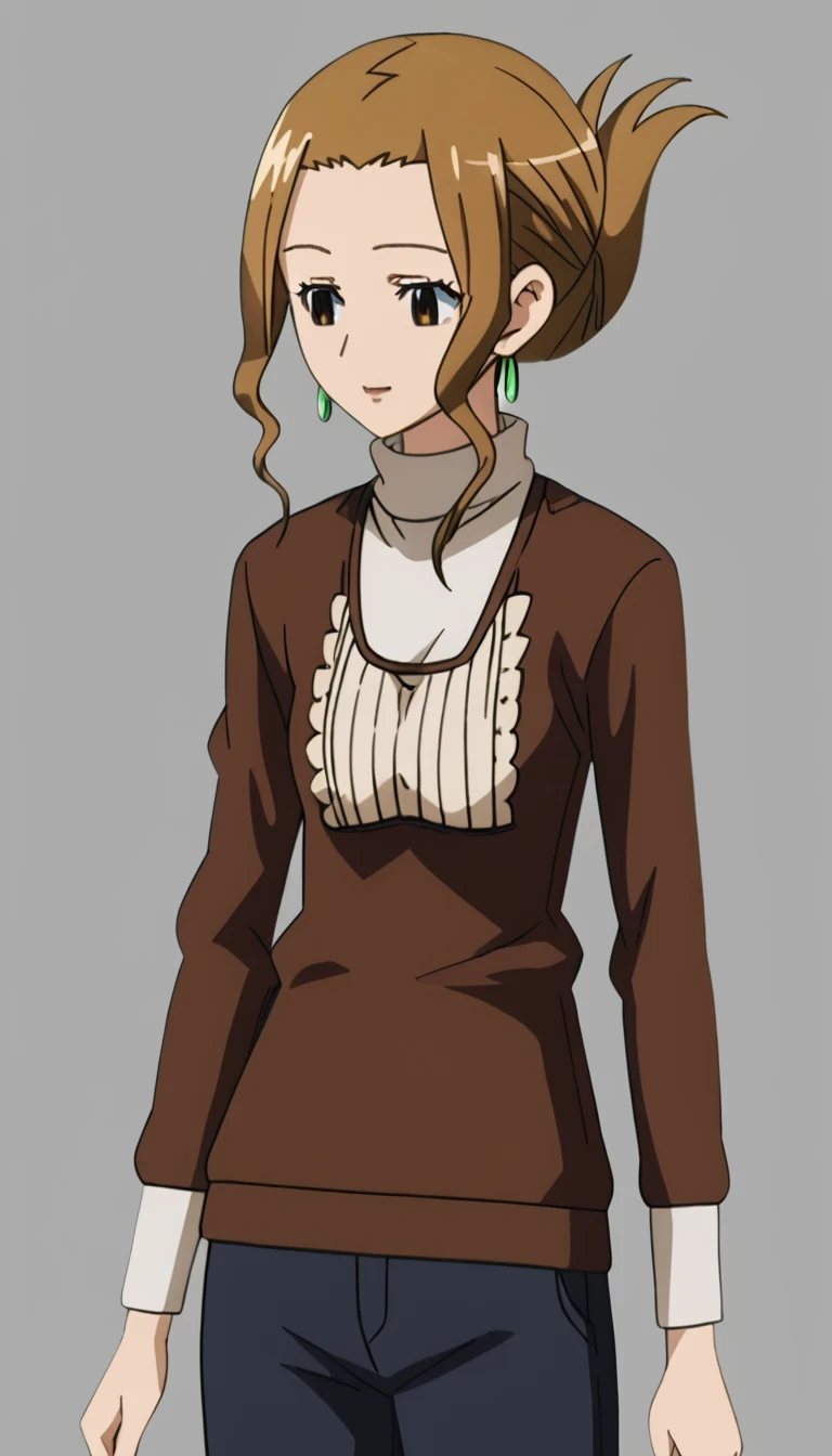 suzumother,1girl,brown eyes,earrings,brown hair,folded ponytail,
