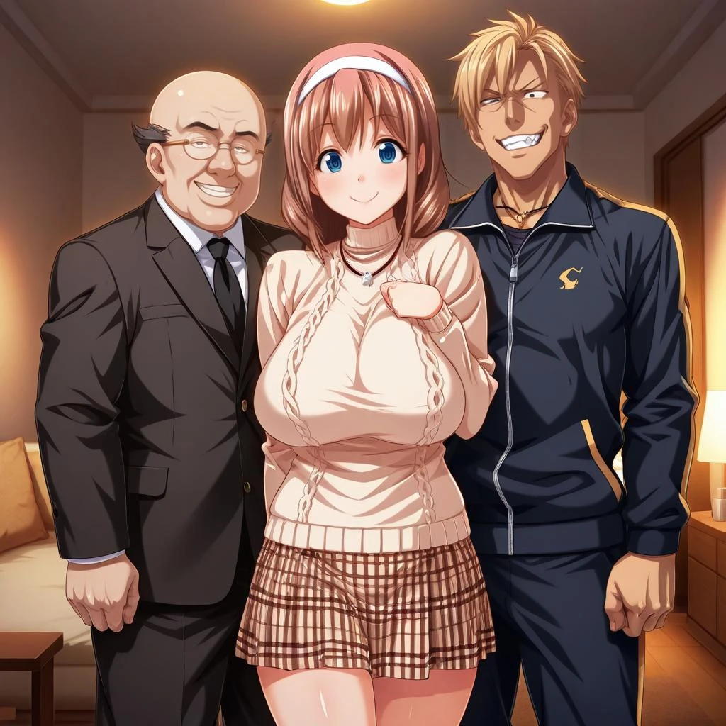 Koharu Hinomoto: 1girl, koharu, brown hair, blue eyes, white headband, beige sweater, necklace, light brown checkered skirt,