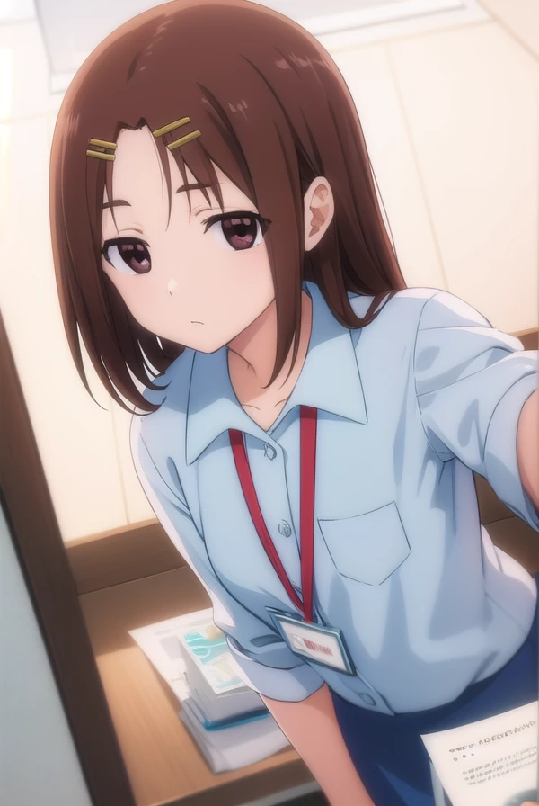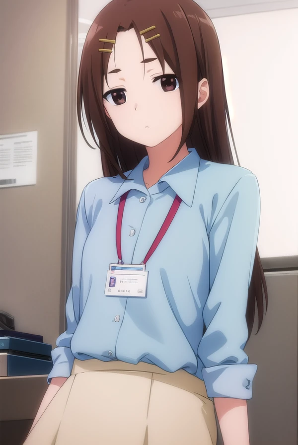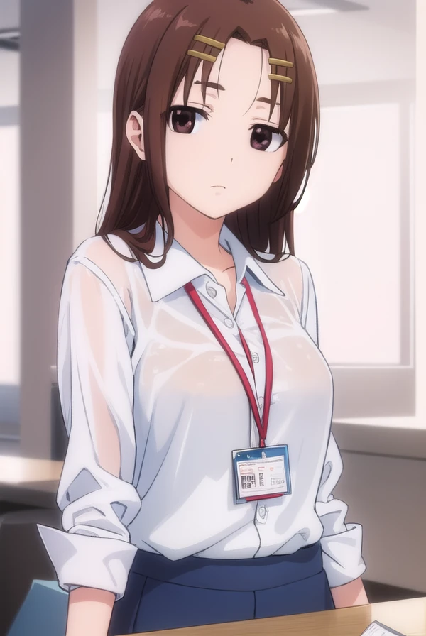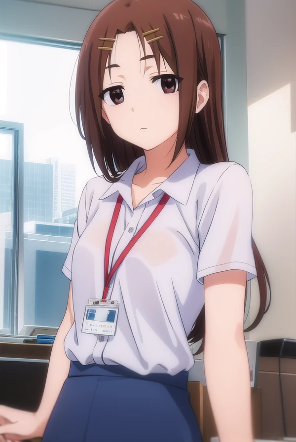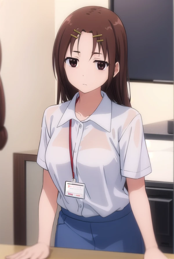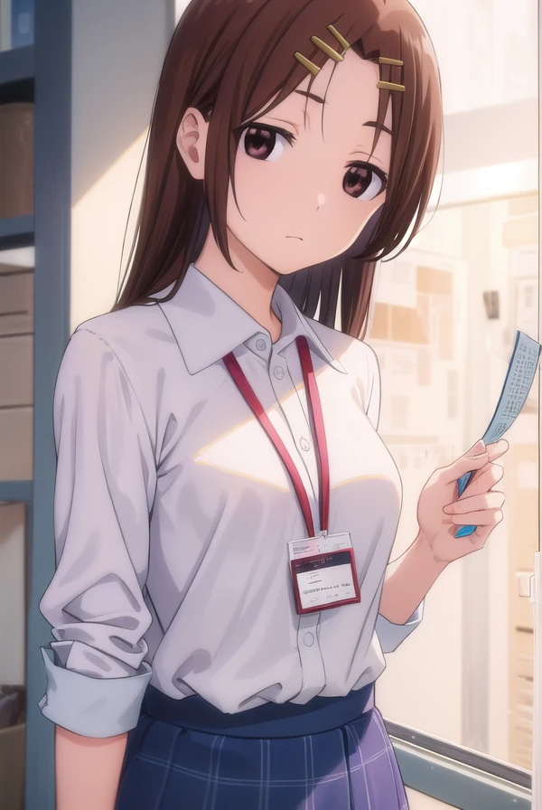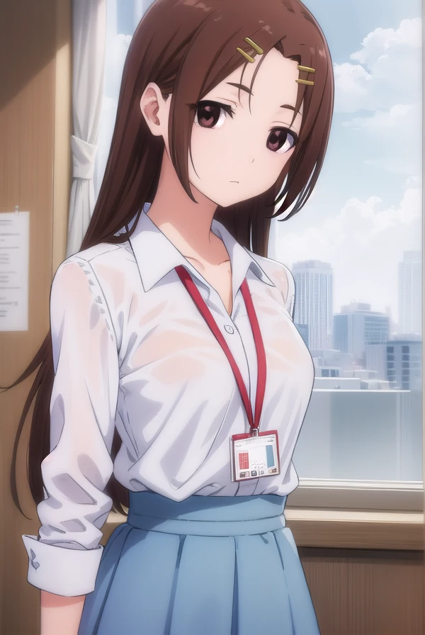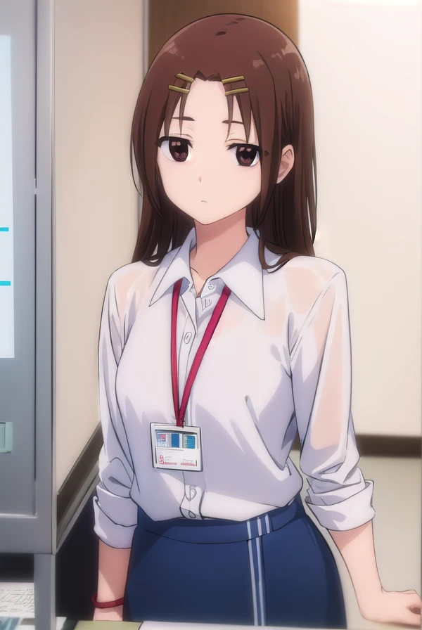 megumi chihaya, long hair, brown hair, hair ornament, (brown eyes:1.5), hairclip,