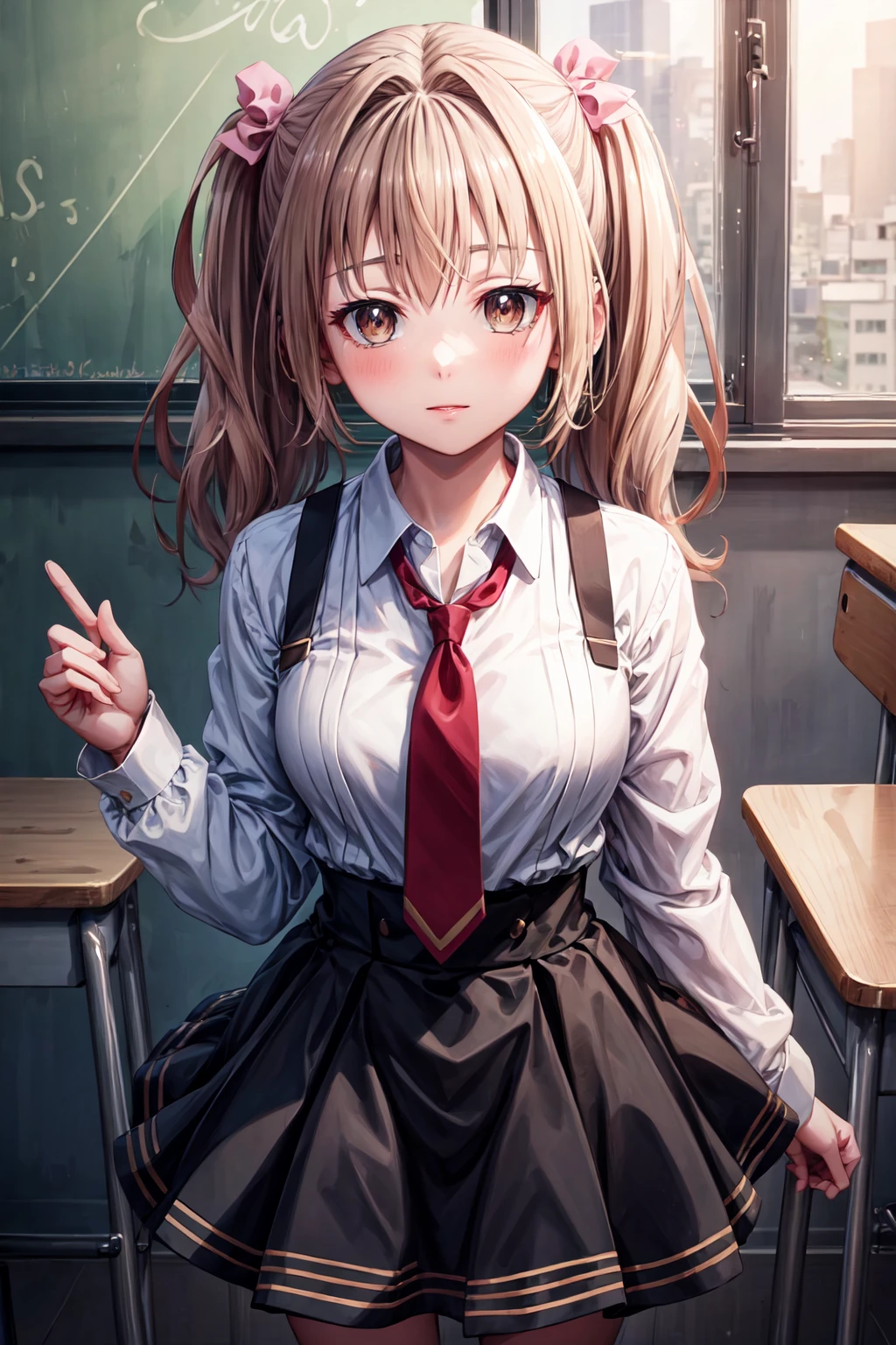 ((best quality, high quality, masterpiece, highres)), noa akizuki, 1girl, solo, looking at viewer, school uniform, white shirt, red necktie, bow, school, classroom, cowboy shot, skirt