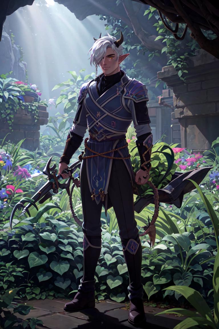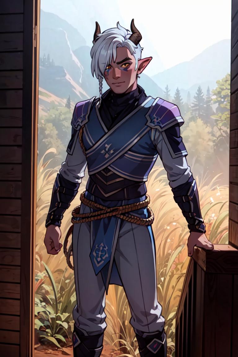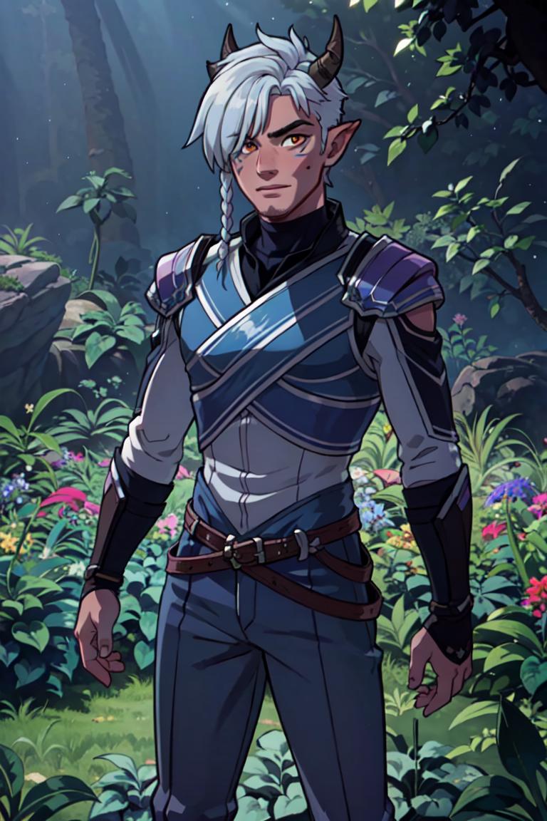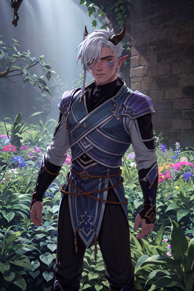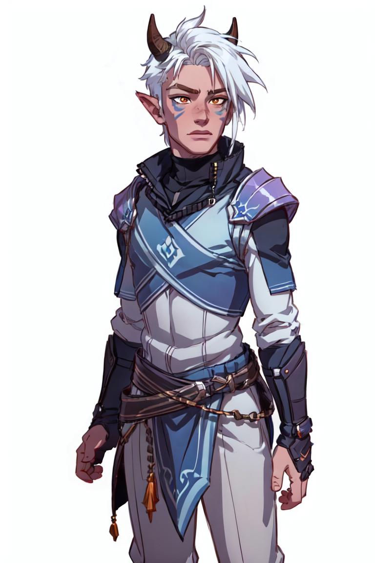 Additional: hair over one eye, orange eyes, horns, facial mark