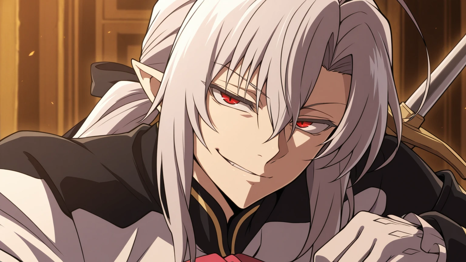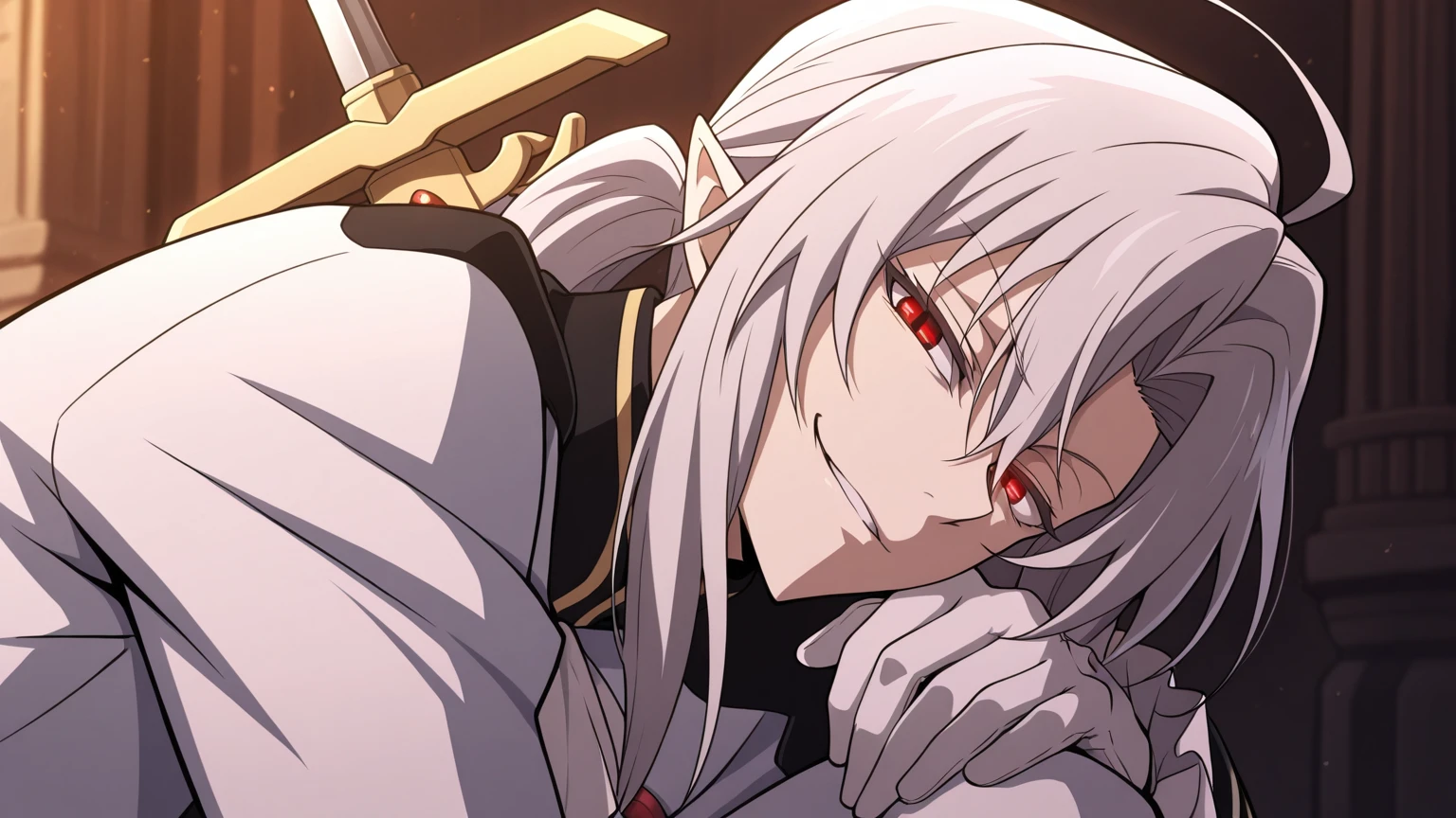 FeridBathory, silver hair, red eyes, Slit Eyes, ahoge, pointy ears