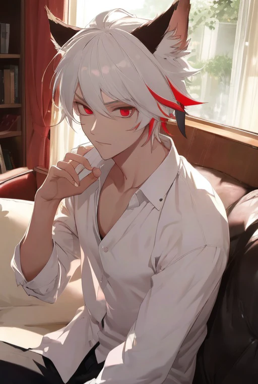 1boy, streaked hair, white hair, single red streaks hair, red eyes, yokai ears, pale skin