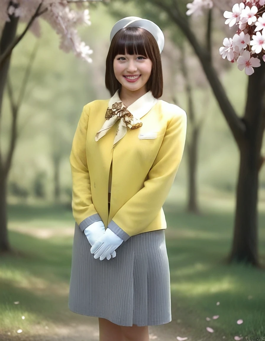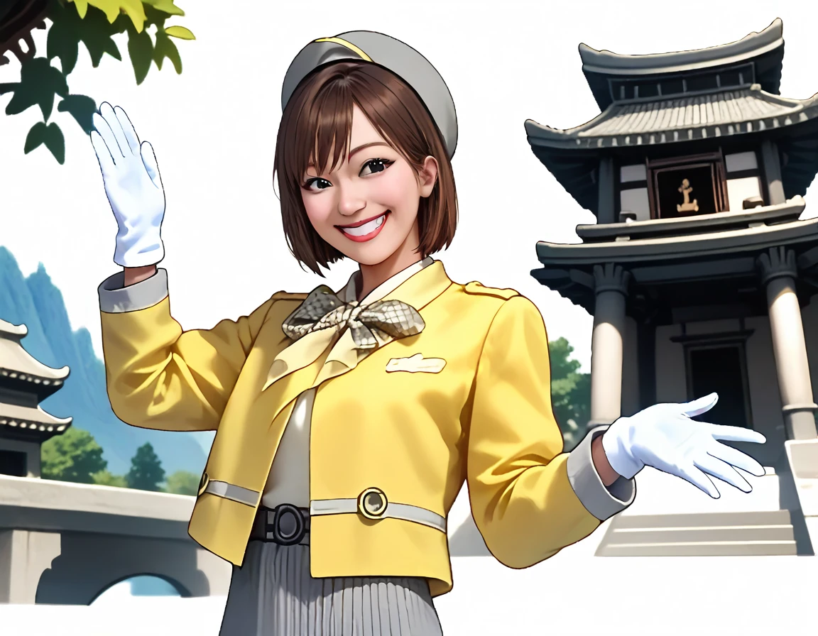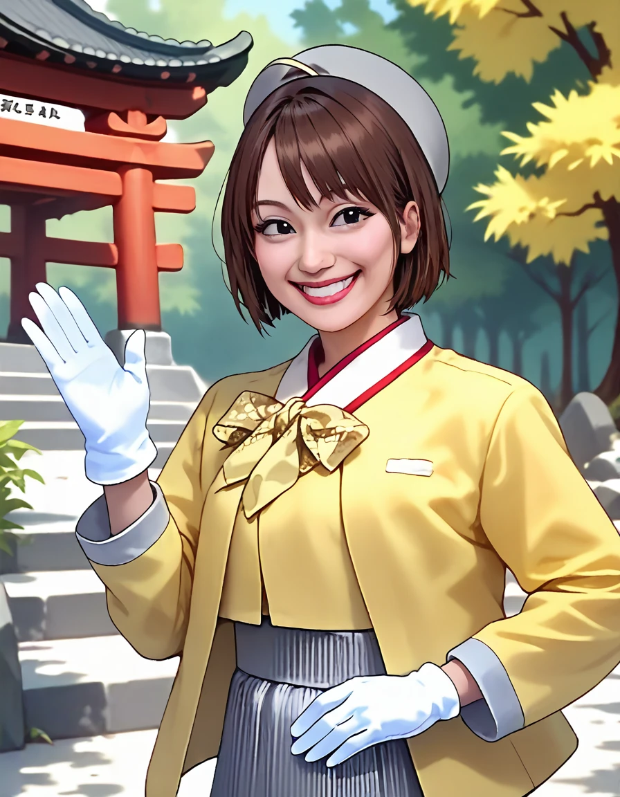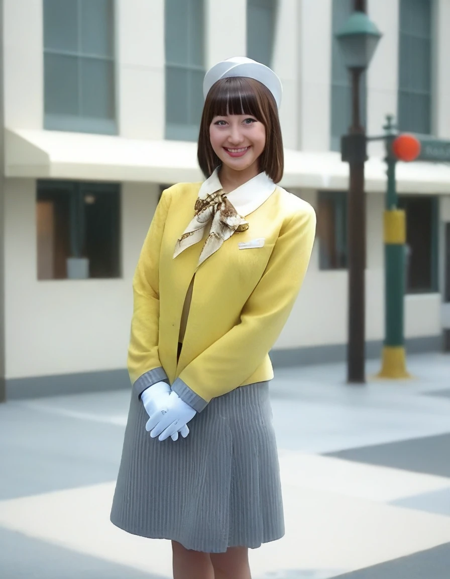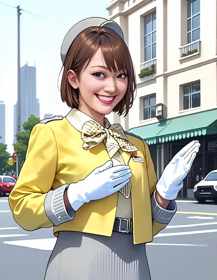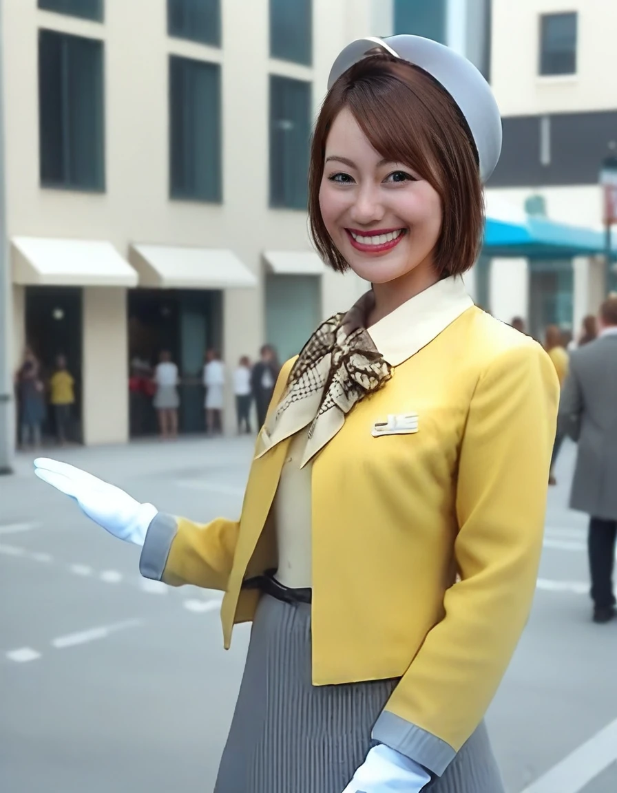 BusGuide, Yellow Jacket, grey skirt, grey hat