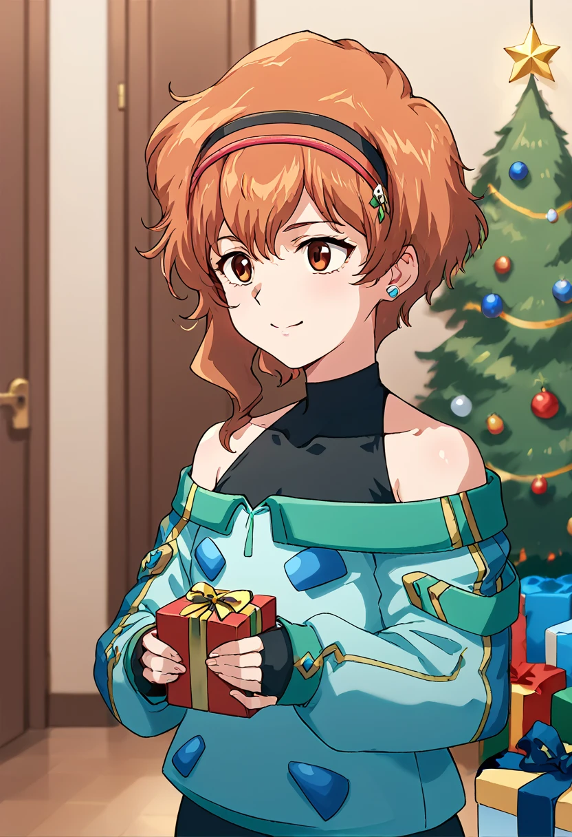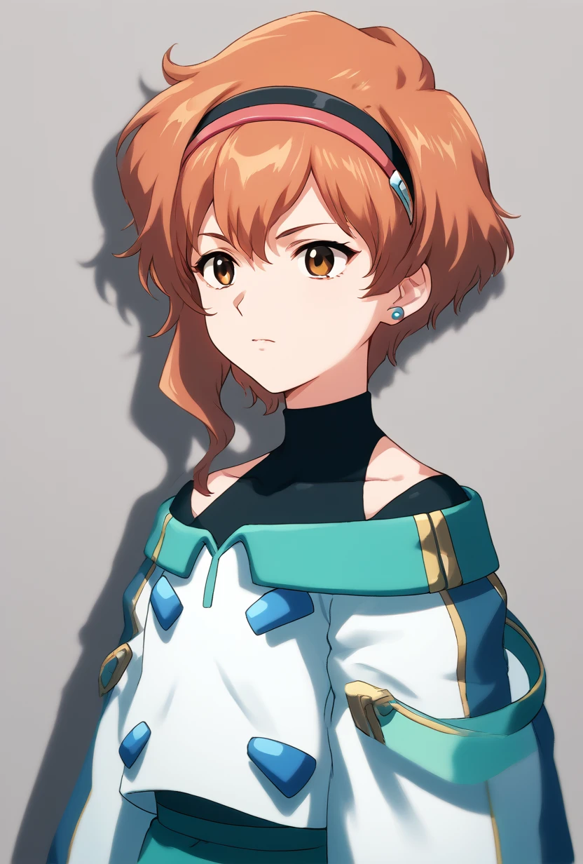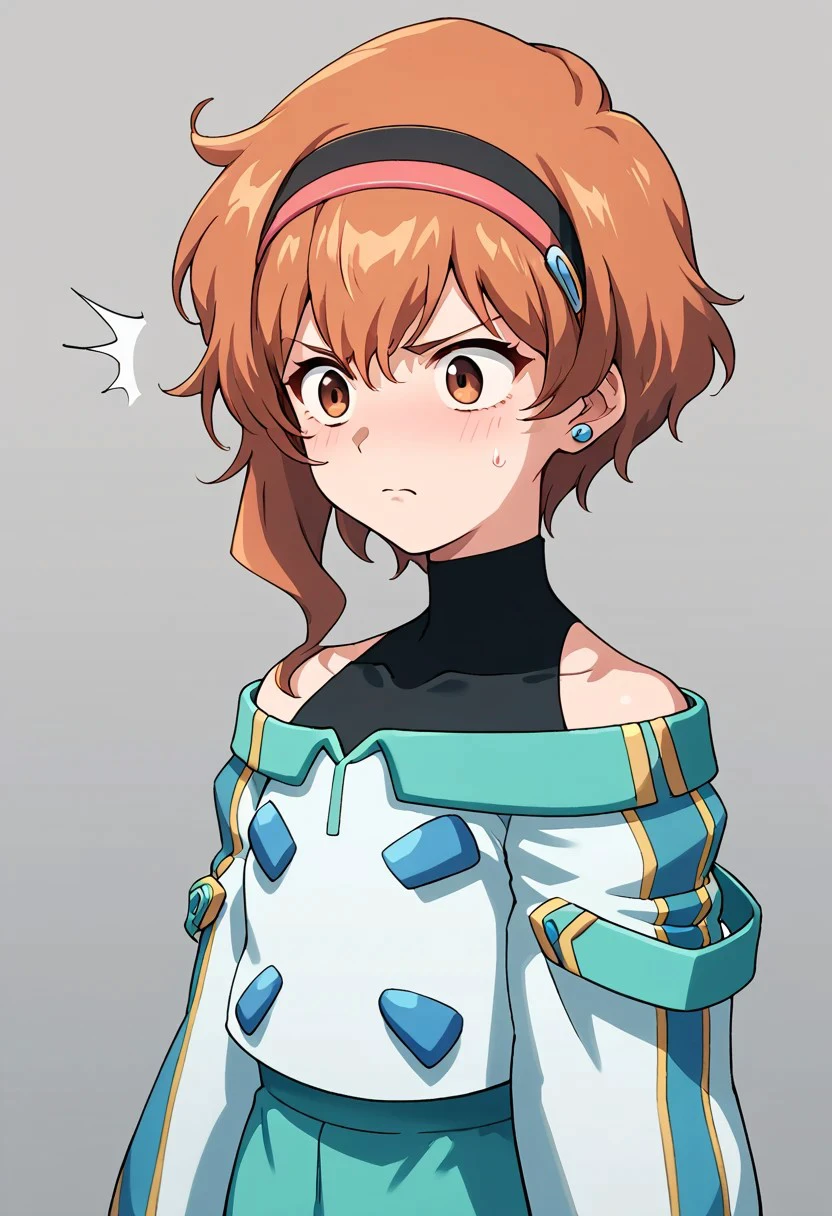 shis mitville, brown eyes, off shoulder, short hair, orange hair, jewelry, brown hair, earrings, hairbands