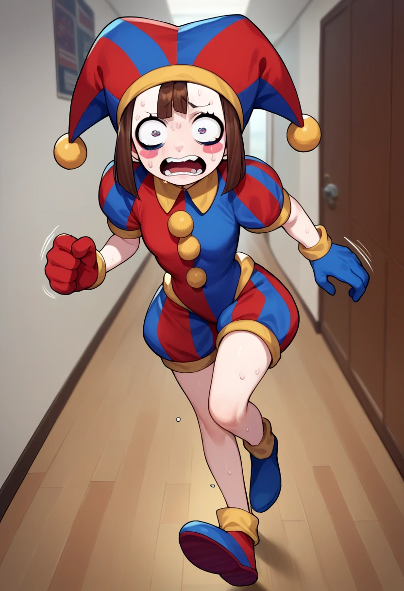 Default Outfit: jester cap, striped clothes, puffy short sleeves, mismatched gloves, puffy shorts