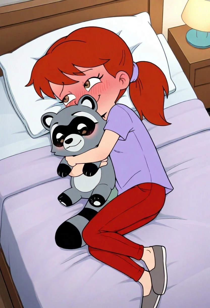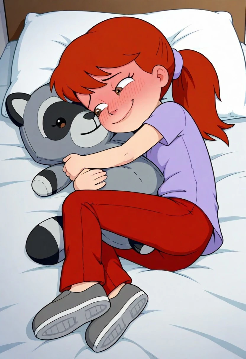 1girl,solo,female focus,Jessi Glaser,red head,red hair,brown eyes,ponytail,purple scrunchie,purple shirt,red pants,gray shoes