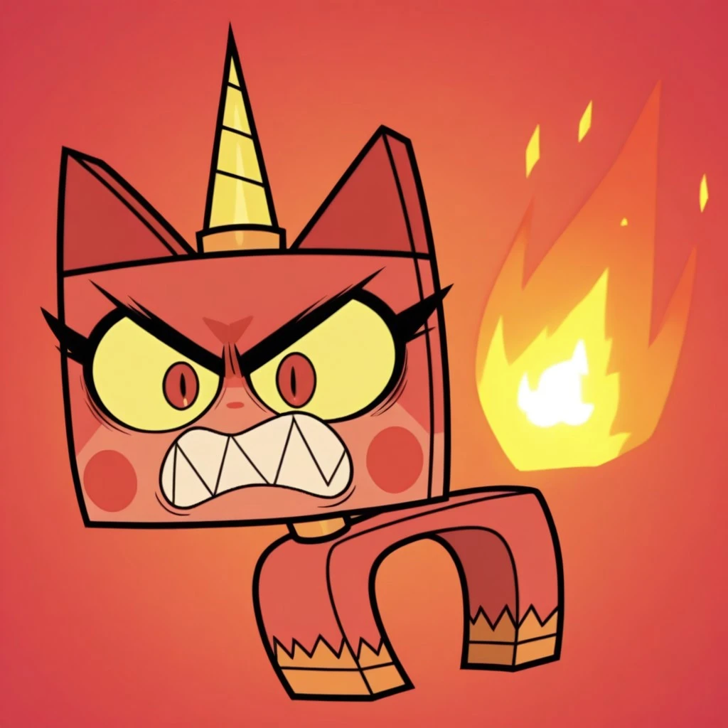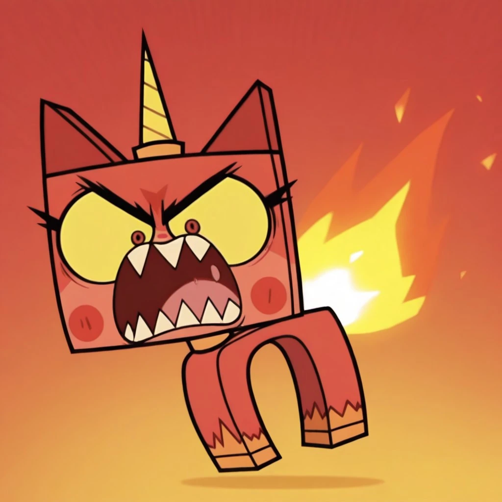 angryunikitty, cat, red fur, red ears, red eyes, yellow sclera, yellow horn, blush stickers, sharp teeth, fire
