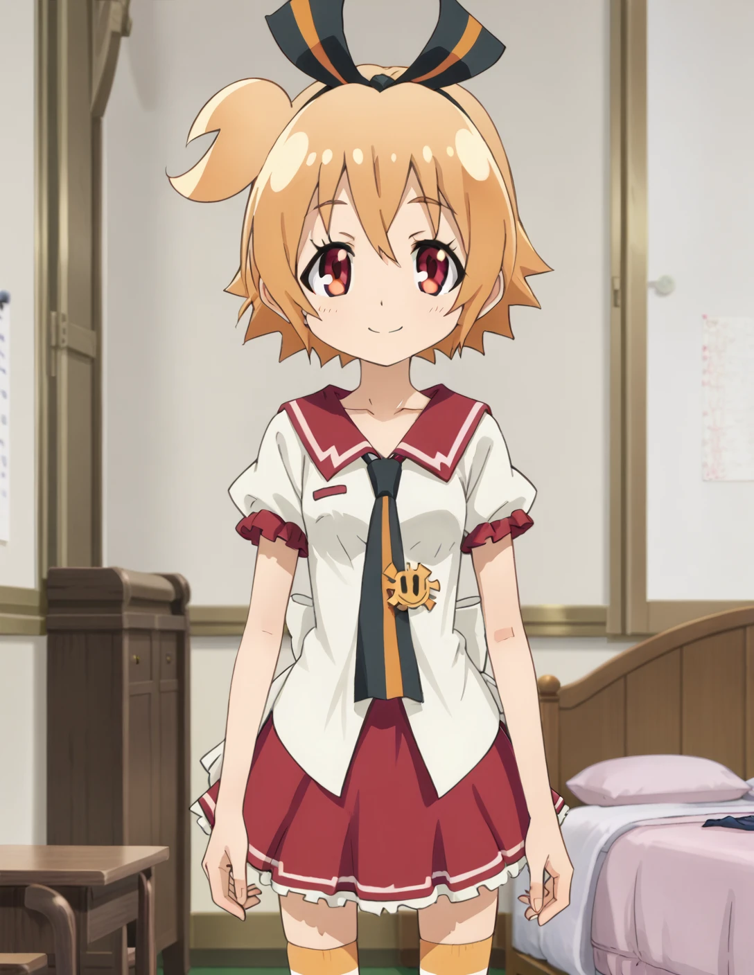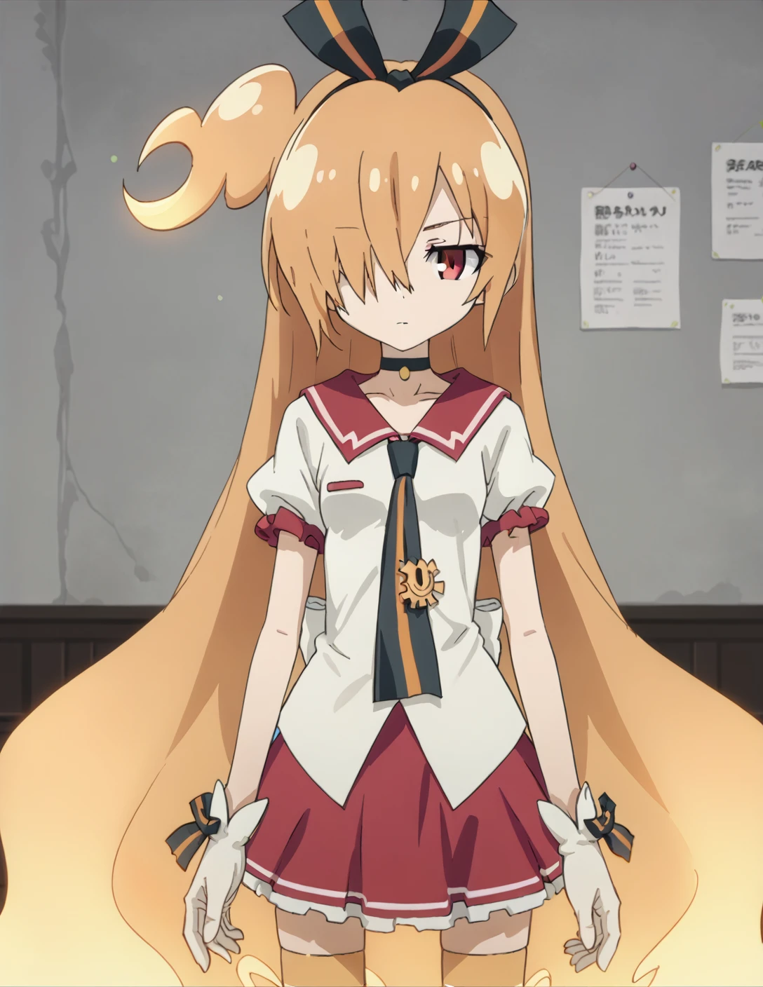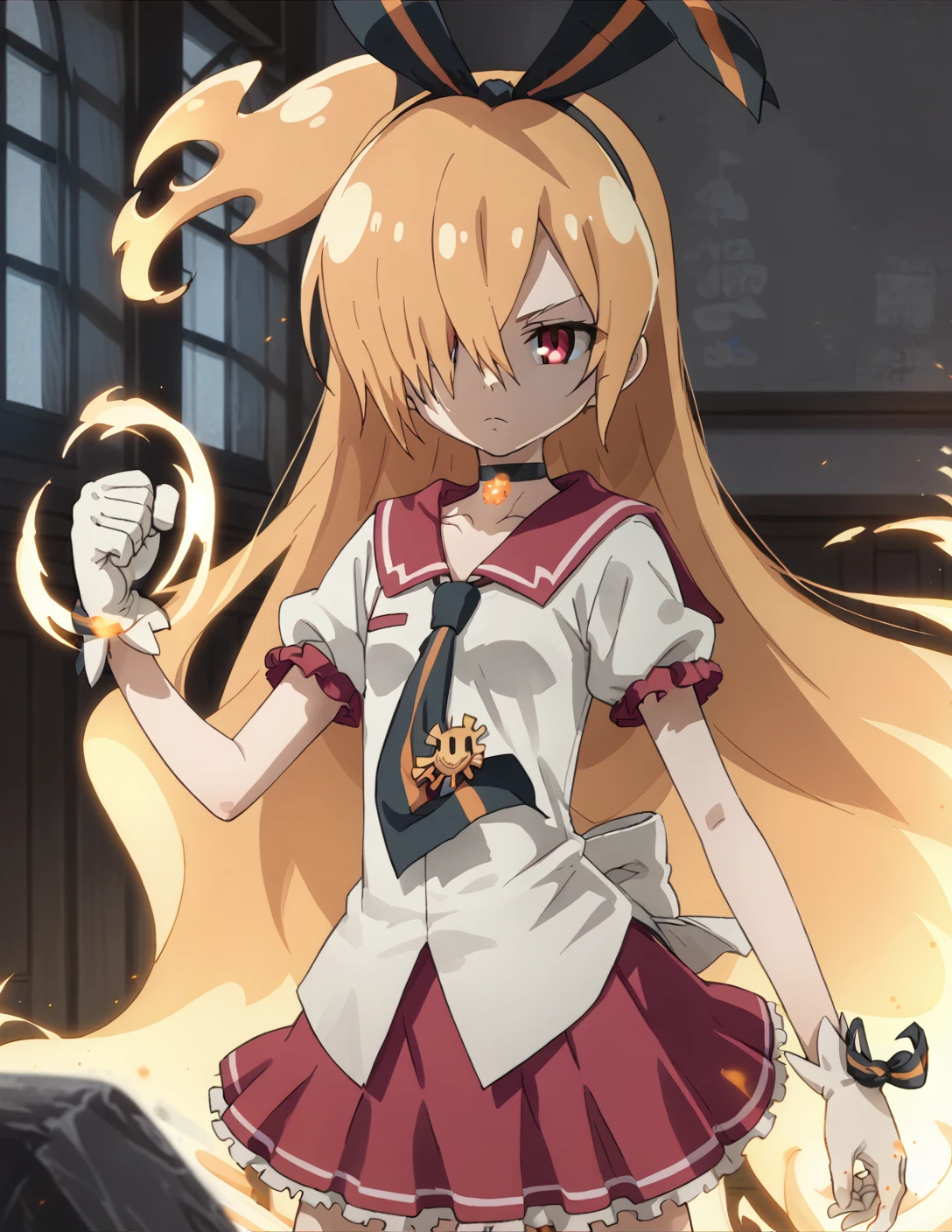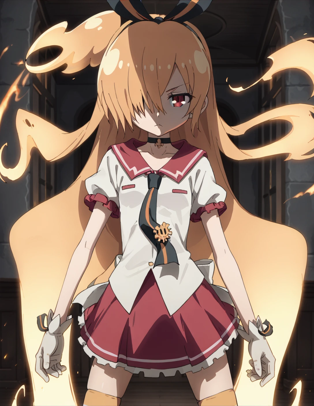 AkariTenebrae,very long hair, school uniform,hair over one eye, expressionless, choker, Gloves,