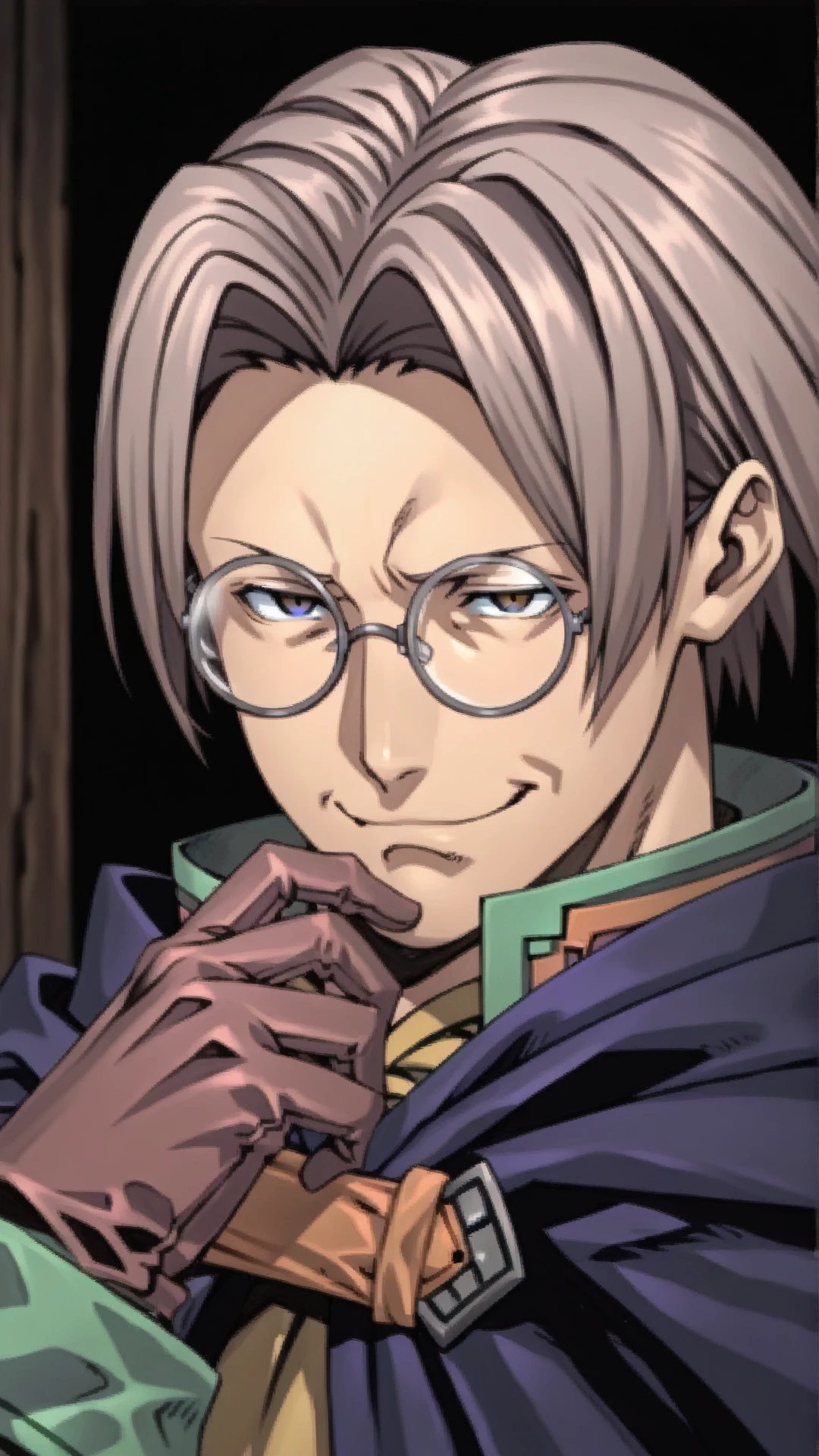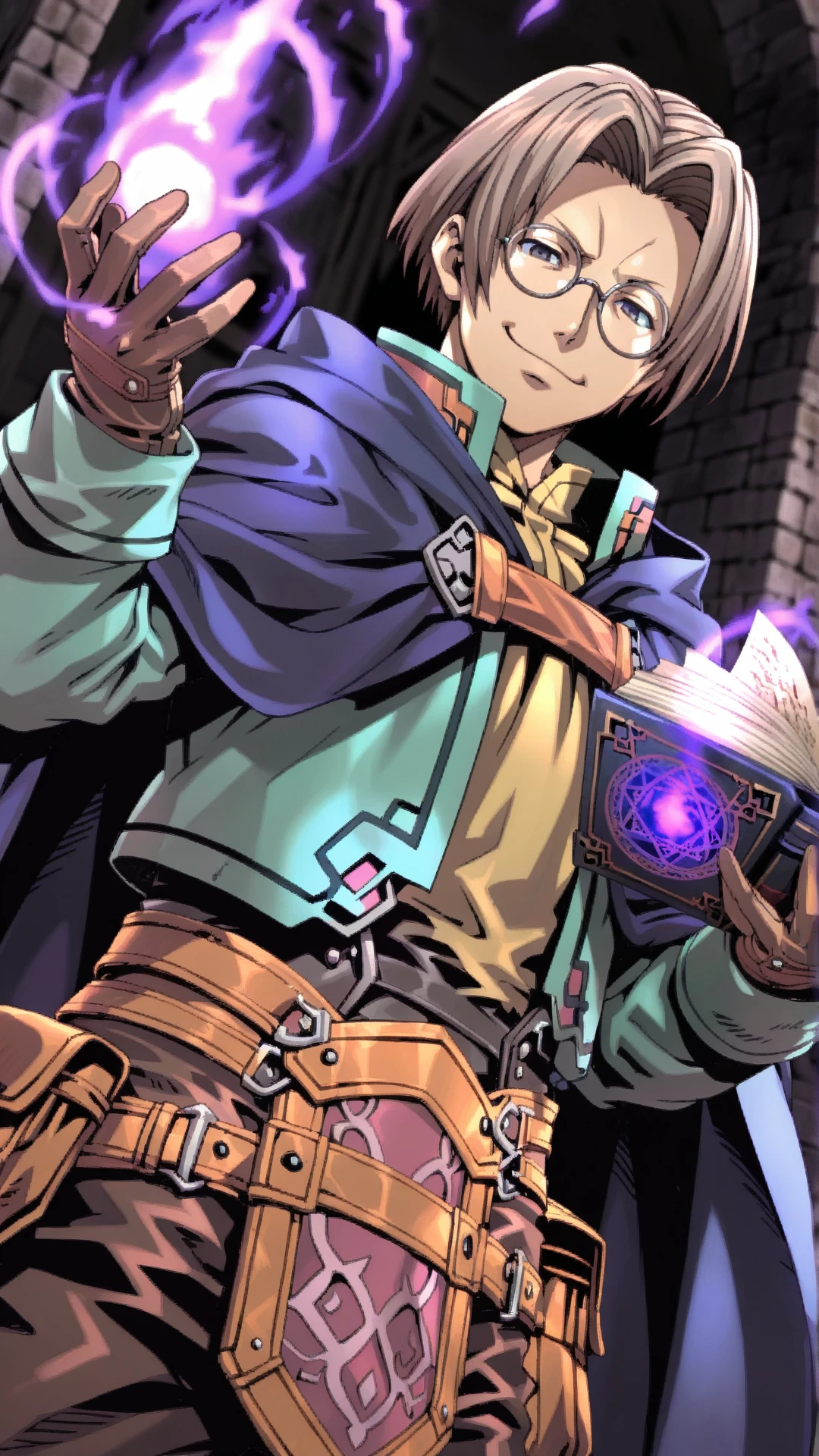 Outfit:round eyewear, boots, belt, brown gloves,blue cloak, long sleeves,