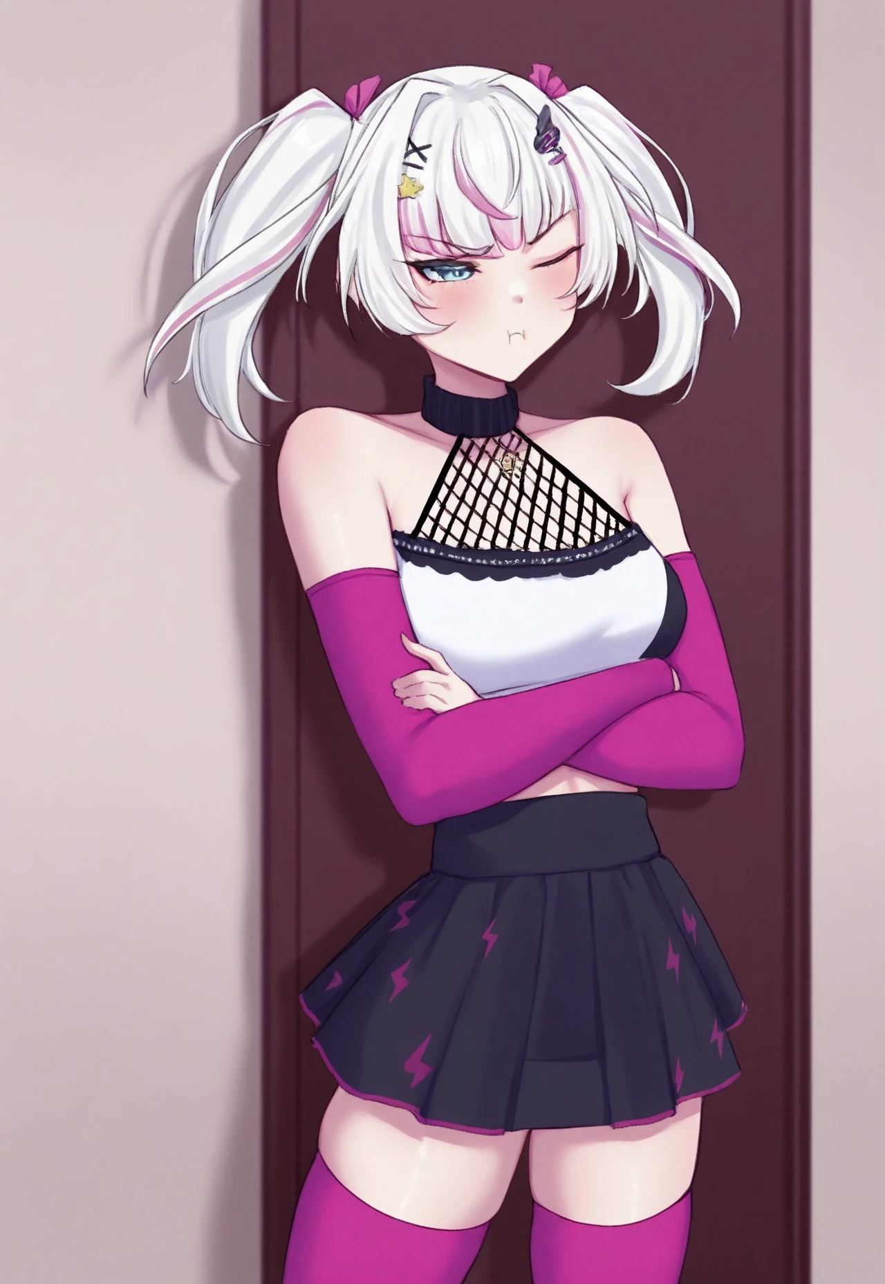 Lia-Default, fishnet, white top, pink arm stalking, detached sleeves, black skirt
