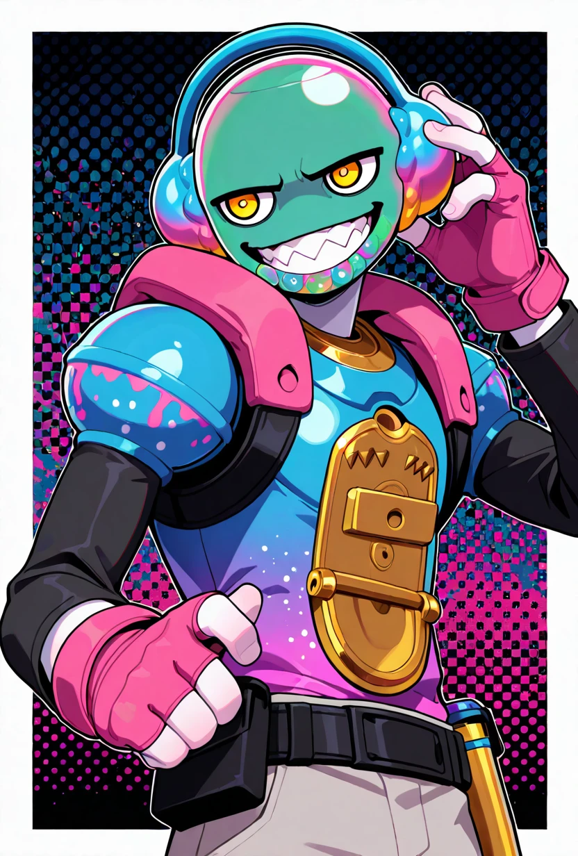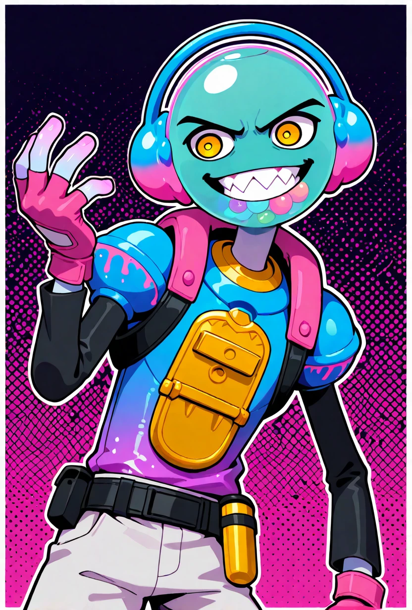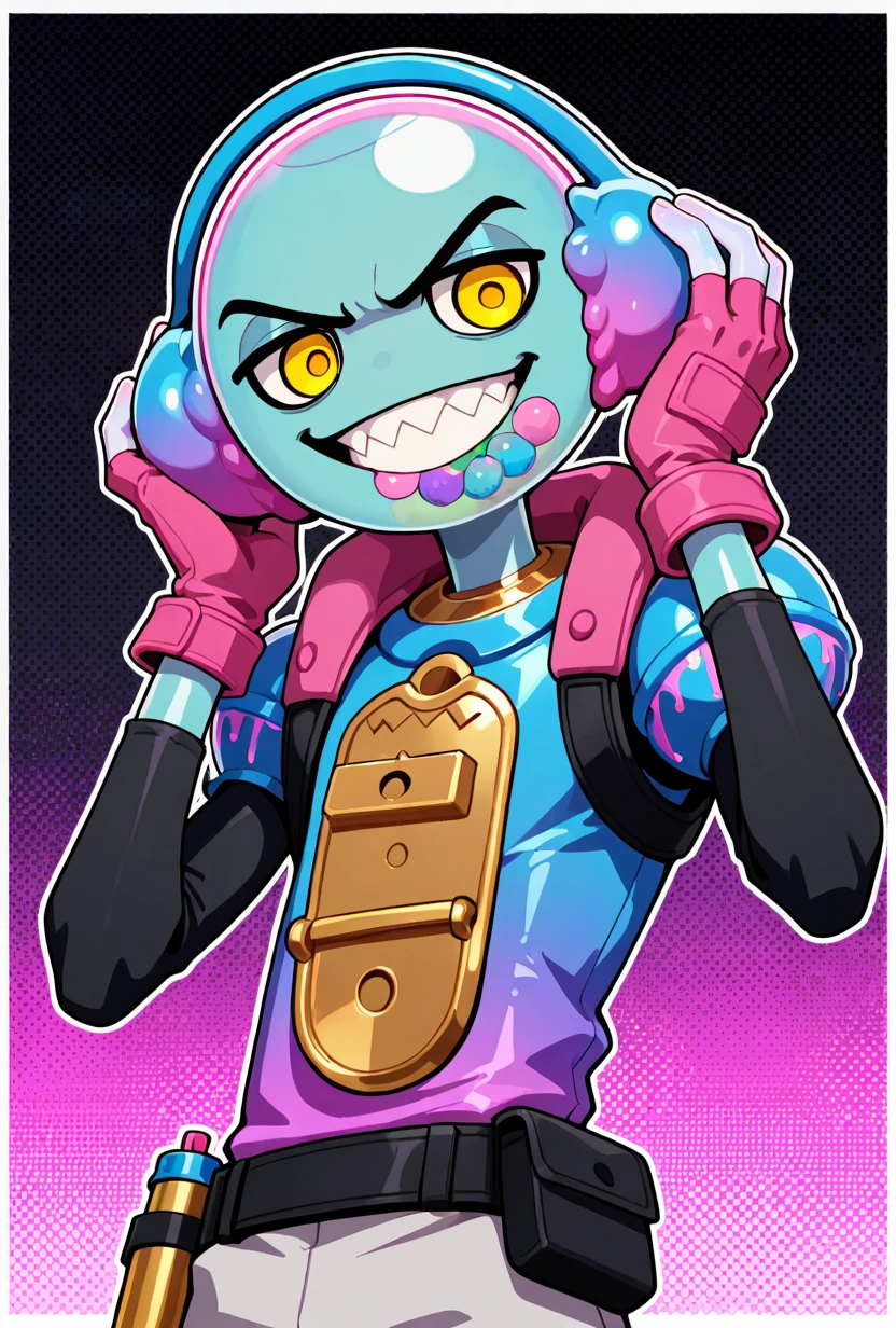 gumbo, sharp teeth, yellow eyes, 1boy, smile, fingerless gloves, solo, colored skin, grin, robot, pink gloves, pants, belt, headphones, round head, circular head, big head,