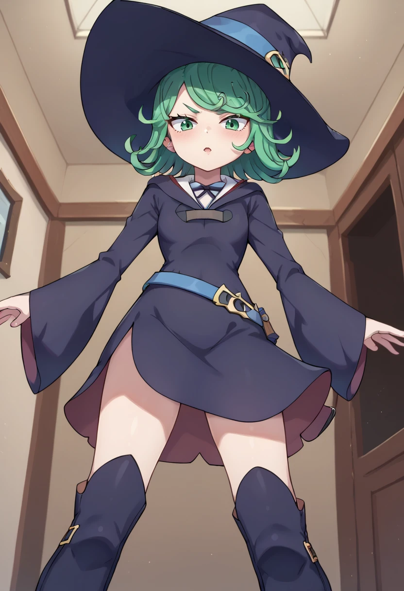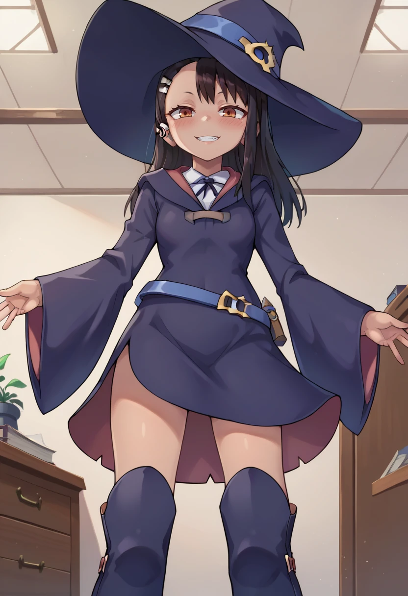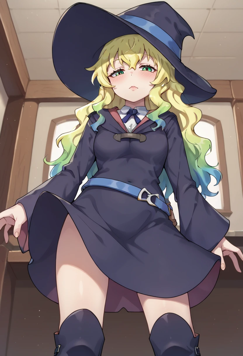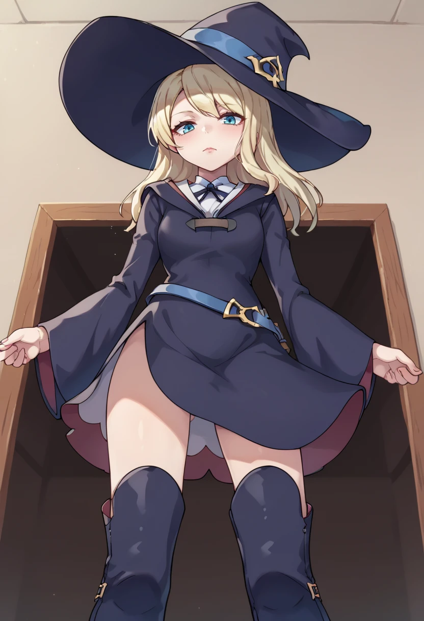 LunaNovaAcademyuniformCOS,1girl,long sleeves,hat,dress,ribbon,school uniform,white shirt,boots,belt,wide sleeves,neck ribbon,witch hat,knee boots,witch,luna nova school uniform