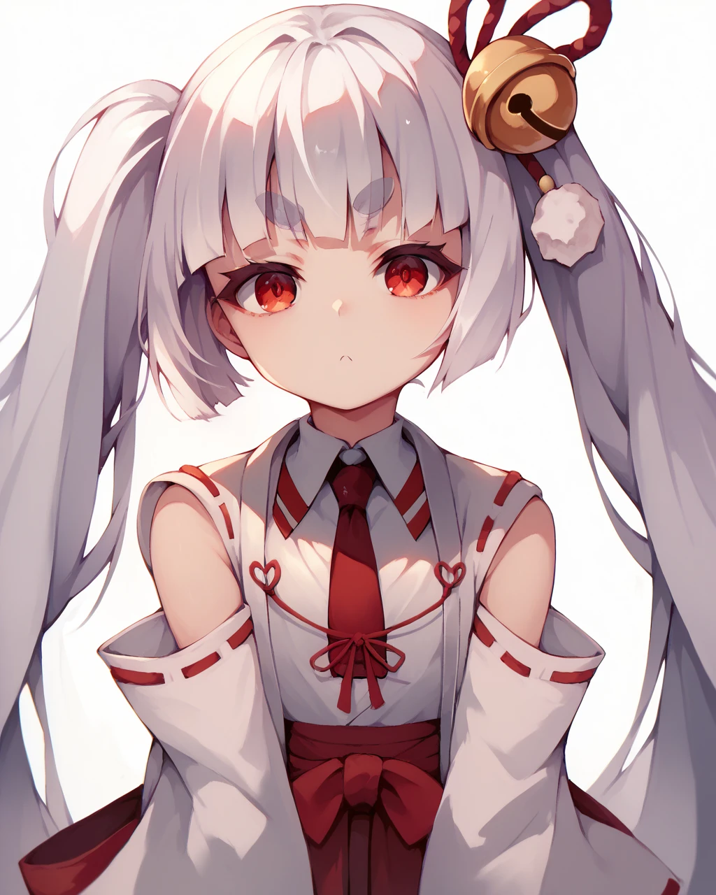 tsukuyo inaba, 1girl, solo,closed eyes, red eyes,very long hair,twintails,white hair,hair ornament, bangs, thick eyebrows,hair bell, jingle bell, detached sleeves, japanese clothes,miko,necktie,